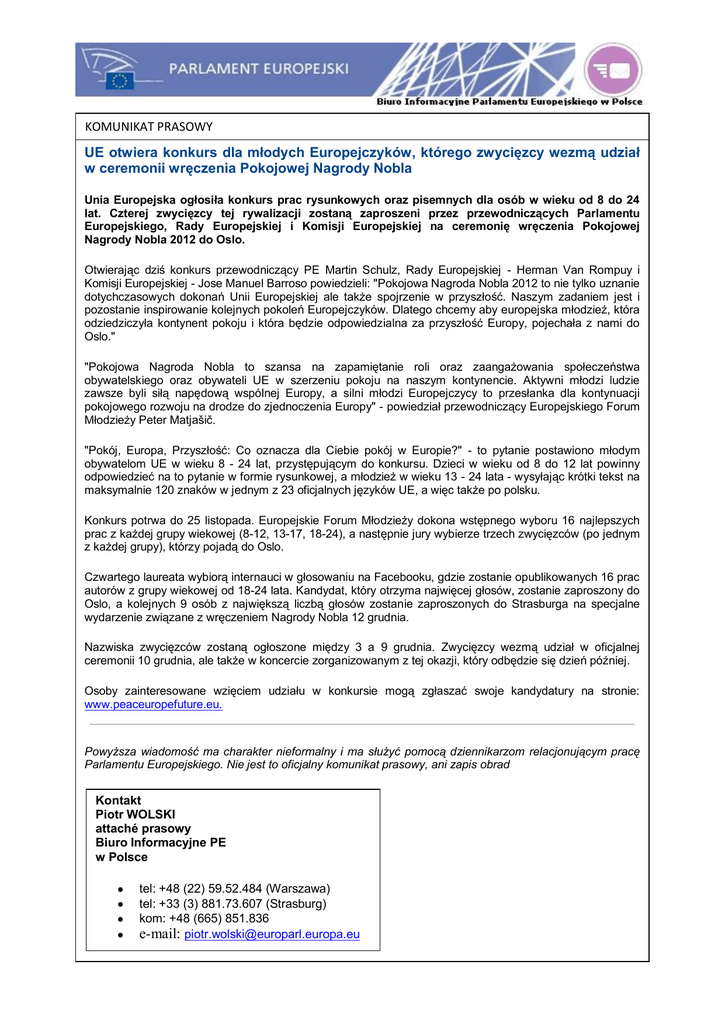 KOMUNIKAT PRASOWY UE otwiera konkurs dla młodych Europejczyków, którego zwycięzcy wezmą udział w ceremonii wręczenia Pokojowej Nagrody Nobla Unia Europejska ogłosiła konkurs prac rysunkowych oraz pisemnych dla osób w wieku od 8 do 24 lat. Czterej zwycięzcy tej rywalizacji zostaną zaproszeni przez przewodniczących Parlamentu Europejskiego, Rady Europejskiej i Komisji Europejskiej na ceremonię wręczenia Pokojowej Nagrody Nobla 2012 do Oslo. Otwierając dziś konkurs przewodniczący PE Martin Schulz, Rady Europejskiej - Herman Van Rompuy i Komisji Europejskiej - Jose Manuel Barroso powiedzieli: "Pokojowa Nagroda Nobla 2012 to nie tylko uznanie dotychczasowych dokonań Unii Europejskiej ale także spojrzenie w przyszłość. Naszym zadaniem jest i pozostanie inspirowanie kolejnych pokoleń Europejczyków. Dlatego chcemy aby europejska młodzież, która odziedziczyła kontynent pokoju i która będzie odpowiedzialna za przyszłość Europy, pojechała z nami do Oslo." "Pokojowa Nagroda Nobla to szansa na zapamiętanie roli oraz zaangażowania społeczeństwa obywatelskiego oraz obywateli UE w szerzeniu pokoju na naszym kontynencie. Aktywni młodzi ludzie zawsze byli siłą napędową wspólnej Europy, a silni młodzi Europejczycy to przesłanka dla kontynuacji pokojowego rozwoju na drodze do zjednoczenia Europy" - powiedział przewodniczący Europejskiego Forum Młodzieży Peter Matjašič. "Pokój, Europa, Przyszłość: Co oznacza dla Ciebie pokój w Europie?" - to pytanie postawiono młodym obywatelom UE w wieku 8 - 24 lat, przystępującym do konkursu. Dzieci w wieku od 8 do 12 lat powinny odpowiedzieć na to pytanie w formie rysunkowej, a młodzież w wieku 13 - 24 lata - wysyłając krótki tekst na maksymalnie 120 znaków w jednym z 23 oficjalnych języków UE, a więc także po polsku. Konkurs potrwa do 25 listopada. Europejskie Forum Młodzieży dokona wstępnego wyboru 16 najlepszych prac z każdej grupy wiekowej (8-12, 13-17, 18-24), a następnie jury wybierze trzech zwycięzców (po jednym z każdej grupy), którzy pojadą do Oslo. Czwartego laureata wybiorą internauci w głosowaniu na Facebooku, gdzie zostanie opublikowanych 16 prac autorów z grupy wiekowej od 18-24 lata. Kandydat, który otrzyma najwięcej głosów, zostanie zaproszony do Oslo, a kolejnych 9 osób z największą liczbą głosów zostanie zaproszonych do Strasburga na specjalne wydarzenie związane z wręczeniem Nagrody Nobla 12 grudnia. Nazwiska zwycięzców zostaną ogłoszone między 3 a 9 grudnia. Zwycięzcy wezmą udział w oficjalnej ceremonii 10 grudnia, ale także w koncercie zorganizowanym z tej okazji, który odbędzie się dzień później. Osoby zainteresowane wzięciem udziału w konkursie mogą zgłaszać swoje kandydatury na stronie: www.peaceuropefuture.eu. Powyższa wiadomość ma charakter nieformalny i ma służyć pomocą dziennikarzom relacjonującym pracę Parlamentu Europejskiego. Nie jest to oficjalny komunikat prasowy, ani zapis obrad Kontakt Piotr WOLSKI attaché prasowy Biuro Informacyjne PE w Polsce tel: +48 (22) 59.52.484 (Warszawa) tel: +33 (3) 881.73.607 (Strasburg) kom: +48 (665) 851.836 e-mail: [email protected]