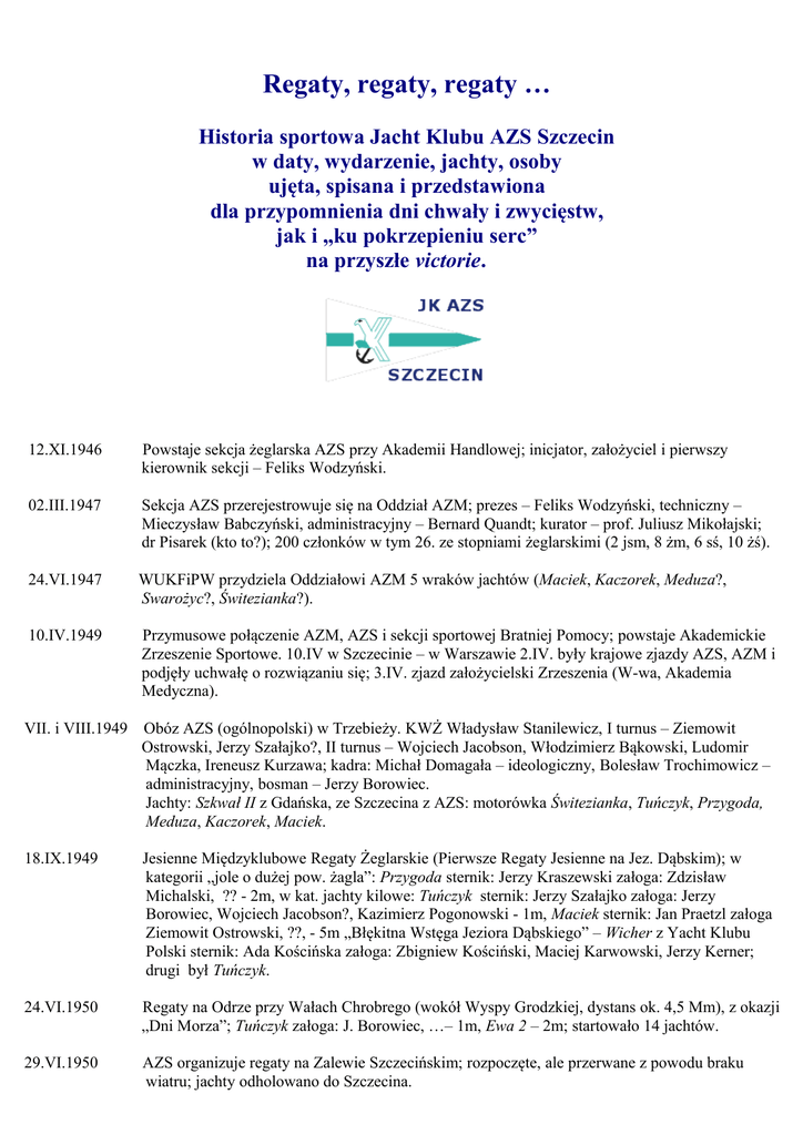 Regaty, regaty, regaty … Historia sportowa Jacht Klubu AZS Szczecin w daty, wydarzenie, jachty, osoby ujęta, spisana i przedstawiona dla przypomnienia dni chwały i zwycięstw, jak i „ku pokrzepieniu serc” na przyszłe victorie. 12.XI.1946 Powstaje sekcja żeglarska AZS przy Akademii Handlowej; inicjator, założyciel i pierwszy kierownik sekcji – Feliks Wodzyński. 02.III.1947 Sekcja AZS przerejestrowuje się na Oddział AZM; prezes – Feliks Wodzyński, techniczny – Mieczysław Babczyński, administracyjny – Bernard Quandt; kurator – prof. Juliusz Mikołajski; dr Pisarek (kto to?); 200 członków w tym 26. ze stopniami żeglarskimi (2 jsm, 8 żm, 6 sś, 10 żś). 24.VI.1947 WUKFiPW przydziela Oddziałowi AZM 5 wraków jachtów (Maciek, Kaczorek, Meduza?, Swarożyc?, Świtezianka?). 10.IV.1949 Przymusowe połączenie AZM, AZS i sekcji sportowej Bratniej Pomocy; powstaje Akademickie Zrzeszenie Sportowe. 10.IV w Szczecinie – w Warszawie 2.IV. były krajowe zjazdy AZS, AZM i podjęły uchwałę o rozwiązaniu się; 3.IV. zjazd założycielski Zrzeszenia (W-wa, Akademia Medyczna). VII. i VIII.1949 Obóz AZS (ogólnopolski) w Trzebieży. KWŻ Władysław Stanilewicz, I turnus – Ziemowit Ostrowski, Jerzy Szałajko?, II turnus – Wojciech Jacobson, Włodzimierz Bąkowski, Ludomir Mączka, Ireneusz Kurzawa; kadra: Michał Domagała – ideologiczny, Bolesław Trochimowicz – administracyjny, bosman – Jerzy Borowiec. Jachty: Szkwał II z Gdańska, ze Szczecina z AZS: motorówka Świtezianka, Tuńczyk, Przygoda, Meduza, Kaczorek, Maciek. 18.IX.1949 Jesienne Międzyklubowe Regaty Żeglarskie (Pierwsze Regaty Jesienne na Jez. Dąbskim); w kategorii „jole o dużej pow. żagla”: Przygoda sternik: Jerzy Kraszewski załoga: Zdzisław Michalski, ?? - 2m, w kat. jachty kilowe: Tuńczyk sternik: Jerzy Szałajko załoga: Jerzy Borowiec, Wojciech Jacobson?, Kazimierz Pogonowski - 1m, Maciek sternik: Jan Praetzl załoga Ziemowit Ostrowski, ??, - 5m „Błękitna Wstęga Jeziora Dąbskiego” – Wicher z Yacht Klubu Polski sternik: Ada Kościńska załoga: Zbigniew Kościński, Maciej Karwowski, Jerzy Kerner; drugi był Tuńczyk. 24.VI.1950 Regaty na Odrze przy Wałach Chrobrego (wokół Wyspy Grodzkiej, dystans ok. 4,5 Mm), z okazji „Dni Morza”; Tuńczyk załoga: J. Borowiec, …– 1m, Ewa 2 – 2m; startowało 14 jachtów. 29.VI.1950 AZS organizuje regaty na Zalewie Szczecińskim; rozpoczęte, ale przerwane z powodu braku wiatru; jachty odholowano do Szczecina. 22.VII.1959 IX.1950 Regaty na Jez. Dąbskim; bieg o najszybszą jednostkę: Przodownik załoga: J. Borowiec (I of) – 2m. Jesienne Międzyklubowe Regaty Żeglarskie; małe jole P-7: Janusz Kędzierski – 1m; jachty 1550m²: Tuńczyk sternik: Zdzisław Michalski załoga: … - 1m. 24-26.V.1951 Regaty Pokoju (Zalew Szcz.), trasa; Dąbie – Wickowo - Dąbie; 14 jachtów w tym 4 z AZS; w kat. do 50m²: Kania sternik: Jerzy Jósewicz załoga: ….. – 2m; jachty > 50m²: Witeź II sternik: Z. Ostrowski załoga: Jerzy Borowiec (II of), Ludomir Mączka, Tadeusz Kuźniar – 2m. 28-29.IX.1951 Regaty Przyjaźni (Zalew Szcz.); jachty do 30mkw: Kaczorek - 3m; jachty 30-50m²: Kania sternik: J. Kraszewski załoga: Małgorzata Jaworska, ?? - 2m; jachty >50m²: Swantewit sternik: Jerzy Szałajko załoga: Jerzy Borowiec (I of), Krzysztof Jaworski, Zbigniew Geralch - 1m, Przodownik sternik: Ziemowit Ostrowski załoga: ?? - 2m, Witeź II sternik: Jerzy Jósewicz załoga: ?? - 3m; najszybsza jednostka bezwzględnie: Przodownik Z. Ostrowski; trasę 87 mil morskich przepłynął w 19godzin 31min 56sek; sędzia główny Bogumił Pierożek. 28.X.1951 Regaty Jesienne; wyścig jachtów z przeliczeniem: Kania J. Kraszewski – 1m; w wyścigu o „Błekitną Wstęgę”: Przodownik Z. Ostrowski – 2m; 30 jachtów, Swantewit J. Szałajko załoga: J. Borowiec (I of) – 3m, Kania J. Kraszewski – 4m. 1951 Mistrzostwa Okręgu na jachtach mieczowych (jole) o 15 m²; Janusz Kędzierski v-ce mistrzostwo. 7.VI.1952 Regaty dla uczczenia Zlotu MPBPL (2 dni na Zalewie Szcz.); Witeź II – 2m. 2.VII.1952 Mistrz. Okręgu Jachtów Kilowych (Jez. Dąbskie); Józef Demczuk – 2m 23.VII.1952 Regaty Etapowe (Zalew Szcz.); Witeź II – 3m, Kania, Swantewit, Przodownik. VIII.1952 Ograniczenie przez Wojsko (WOP) pływań żeglarskich tylko do Jeziora Dąbskiego; sytuacja ta trwała do czerwca 1963r. 15-17.VIII.1952 Mistrzostwa Polski Jachtów Kilowych (Gdynia); Kazimierz Haska, Kazimierz Rypiński, Czesław Skibicki, Stefan Lewicki – 2m (regaty przesiadkowe). X. 1952 IV Regaty Jesienne; „Błękitna Wstęga Jeziora Dąbie” – Krzysztof Jaworski na Swantewicie załoga: Józef Demczuk, ?? … ; w kl. P-7: Janusz Kędzierski – 1m. 1953 Regaty Etapowe (Zalew Szcz). Kania K. Jaworski, A.J. Pisz, J. Smagacz, E. Ryżewski. 20-21.IX.1953 1953 II Żeglarskie Mistrzostwa Polski Jachtów Kilowych w Gdyni(Sopot); K. Jaworski – 1m (Mistrz Polski); Maryla Grochowska – 1m (Mistrzyni Polski) (LPŻ). Ogólnopolskie zebranie AZS, powołano Radę Żeglarską, pierwszym przewodniczącym został Jerzy Borowiec. 15-16.V.1954 Regaty Pokoju (Zalew Szcz.); jez. Dąbie – Lubin – jez. Dąbie; I gr. jachtów: Kania Zb. Gerlach – 1m. 18.VIII.1954 Mistrzostwa Okręgu Jachtów Kilowych; Wojciech. Jacobson - 1m. 4-11.IX.1954 Żeglarskie Mistrzostwa Polski Jachtów Mieczowych (jez. Niegocin); kl. H: Wiesława Zarębska – 2m, M. Grochowska – 3m); obie z LPŻ. XI.1954 Powołanie do Kadry Narodowej w żeglarstwie; W. Zarębska – bojery, M. Grochowska i W. Zarębska – kl. H, M. Grochowska – jachty morskie. (LPŻ). 1954 Stopień sędziego kl. P otrzymują Kazimierz Haska i Ryszard Książyński. 1954 Akademickie Mistrzostwa Polski w kl. O-Finn: 1m w kl. kobiet Aleksandra Buszkiewicz (jako AZS Poznań). 7.III.1955 Obóz bojerowy w Giżycku. 21-22.V.1955 Regaty Pokoju; Przodownik W. Jacobson – 1m, Witeź II Z. Ostrowski – 2m. 2-3.VII.1955 Mistrzostwa Okręgu; k