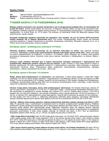 Strona 1 z 5 Sparks Polska Od: Wysłano: Temat: "Sparks Polska" <[email protected]> 17 października 2016 23:12 Raport pogodowy Sparks Polska i kondycja upraw w Polsce i na świecie - 42/2016 TYDZIEŃ 42/2016 (17-23 PAŹDZIERNIKA 2016) Bieżący tydzień przyniesie nam wysokie temperatury, jak na drugą połowę października, bo dochodzące do prawie 20 stopni. Jednak wciąż będzie się chmurzyć, a miejscami również padać, do tego może porywiście wiać. W najbliższy weekend pogoda nie ulegnie istotnej zmianie. W województwach południowych i zachodnich będzie najpogodniej i tu można liczyć na 13-14 stopni. Dla odmiany na wschodzie Polski Niż Białoruski zapewni duże zachmurzenie i opady mżawki. Początek następnego tygodnia zapowiada się pogodnie i bez opadów, ale już od wtorku 25/10 ponownie Polska dostanie się w objęcia deszczowej aury. Pod koniec rozpatrywanego okresu zmieni się kierunek cyrkulacji powietrza z cieplej: południowej na wyraźnie chłodniejszą: wschodnią. Wszystko wskazuje na to, że w Polsce utrzyma się deszczowa i wietrzna pogoda. Kondycja upraw i przebieg prac polowych w Polsce Aktualne działania rolników koncentrują się na zbiorach kukurydzy na ziarno oraz zbiorach buraków cukrowych. Oceniamy, iż skali kraju zaawansowanie zbiorów kukurydzy wynosi około 45%. Zbiory kukurydzy są mocno zaawansowane na Kujawach, w centrum i na Podlasiu, gdzie notowany we wrześniu brak opadów przyśpieszył dojrzewanie ziarna. Znacznie mniej ziarna zebrano natomiast w Wielkopolsce, na Dolnym Śląsku i Pomorzu. Znaczna część rolników aktualnie jest w trakcie stosowania nawozów naturalnych i wykonywania orki przedzimowej. Większość pszenic ozimych jest już zasiana. Część rolników w kraju sieje jednak to zboże w terminie opóźnionym. W wielu przypadkach wynika to z niekorzystnych warunków, które panowały w okolicach optymalnych terminów siewu. Przesuszona gleba praktycznie uniemożliwiała przeprowadzenie zabiegów uprawowych, ci którzy zdecydowali się na siew – siali w pył. Kondycja upraw w Europie i na świecie Rosja: zbiory zbóż podstawowych na ukończeniu. Jak dotychczas, w Rosji zboża zebrano z około 93% areału uzyskując 115 mln ton ziarna (przez suszeniem i czyszczeniem). Z tej wielkości, zebrano 76 mln ton pszenicy (z 98% areału), 19 mln ton jęczmienia (z 97% areału) i ponad 6 mln ton kukurydzy (z 39% areału). Według firmy Rusagrotrans, w bieżącym sezonie Rosja zbierze około 56,4 mln ton pszenicy konsumpcyjnej 3-ciej i 4-tej klasy, a więc znacznie więcej niż w poprzednim sezonie (49,5 mln ton). Ukraina: trwają zbiory kukurydzy, zbiory zbóż podstawowych zakończone. Na Ukrainie dotychczas zebrano 47 mln ton ziarna zbóż z powierzchni 11,4 mln ha, tj. z około 80% areału – poinformowało Ministerstwo Rolnictwa kraju. Dla porównania w analogicznym okresie zeszłego roku zebrano 47,2 mln ton. Średnie plony wzrosły z 3,81 t/ha w zeszłym roku do 4,09 t/ha w bieżącym. Jak szacuje ministerstwo, rolnicy zebrali dotychczas 7,8 mln ton kukurydzy z 1,4 mln ha, co stanowi 33% całej powierzchni upraw tego gatunku. Średnie plony kukurydzy są wyższe niż rok wcześniej – 5,5 t/ha (wobec 5,01 t/ha w 2015 r.). Całkowicie zakończono natomiast zbiory pszenicy i jęczmienia. Ministerstwo szacuje wysokość tegorocznych zbiorów zbóż ogółem na 63 mln ton w porównaniu do 60 mln ton w 2015 roku. Ukraina: zbliżony areał uprawy pszenicy, większa powierzchnia zasiewów rzepaku ozimego pod zbiory w 2017 roku. Po epizodzie suszy i opóźnieniach w zasiewach zbóż na Ukrainie, nastąpił powrót opadów deszczu. Wielkość powierzchni uprawy pszenicy przewidywana jest w takiej samej wielkości jak przed rokiem, tj. 6,2 mln ha. Dotychczas pszenicą ozimą obsiano 65% planowanego areału. Większość obszarów, gdzie nie zdążono jeszcze wykonać zasiewów zlokalizowana jest w południowej części kraju. Rejony te są więc tym samym mniej narażone na wystąpienie porannych przymrozków. Z kolei, siewy rzepaku ozimego na Ukrainie pod zbiory w 2017 roku są zakończone. Rzepakiem obsiano około 740 tys. ha, tj. o 140 tys. ha więcej niż pod zbiory w 2016 roku. - USA: trwają zbiory kukurydzy i soi. W USA trwają zbiory kukurydzy i soi. Na dzień 16/10, ziarno kukurydzy zebrano z 46% areału uprawy wobec 35% przed tygodniem, 54% w tym samym okresie przed rokiem i 49% średnio w latach 2011-2015. Około 97% kukurydzy w USA jest już gotowej do zbioru, tj. o 4% więcej niż przed rokiem i o 3% więcej niż średnio w latach 2011-2015. Z kolei, na dzień 16/10 soję w USA zebrano z 62% areału wobec 44% przed tygodniem, 73% w tym samym okresie przed rokiem i 63% średnio w latach 2011-2015. - USA: tempo siewów pszenicy ozimej zbliżone do tego przed rokiem i do średniej wieloletniej. Na dzień 16/10 w USA pszenicą ozimą obsiano 72% planowanego areału, tj. o 1% mniej niż w tym samym okresie przed rokiem i o 1% 2016-10-17 Strona 2 z 5 mniej niż średnio w latach 2011-2015. Wschody pszenicy zanotowano na 47% areału zasiewów, tj. o 3% mniejszym niż przed rokiem i o 2% mniejszym niż średnio w latach 2011-2015. Australia: spodziewane bardzo wysokie zbiory pszenicy, ale większy udział ziarna jakości paszowej w zbiorach. Według uśrednionych prognoz dziesięciu niezależnych analityków, w sezonie 2016/17 Australia spodziewa się zbiorów pszenicy bliskich rekordowym poziomom, w wysokości 28,35 mln ton. Jest to nieznacznie więcej w porównaniu do oficjalnych, wrześniowych szacunków w wysokości 28,1 mln ton. Spodziewane bardzo dobre wyniki będą bardzo zbliżone do 30 mln ton odnotowanych w sezonie 2010/11. Niestety uprawy zlokalizowane na wschodnim wybrzeżu mogą ucierpieć z powodu dotkliwych opadów deszczu, z kolei plantacje na zachodzie kontynentu z powodu chłodu. Według obecnych prognoz odsetek ziarna pszenicy kwalifikującej się na ziarno paszowe wyniesie ok. 9%, tj. o 2% więcej ni