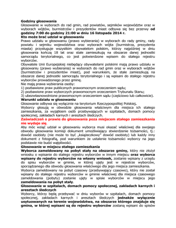 Godziny głosowania Głosowanie w wyborach do rad gmin, rad powiatów, sejmików województw oraz w wyborach wójtów, burmistrzów i prezydentów miast odbywa się bez przerwy od godziny 7:00 do godziny 21:00 w dniu 16 listopada 2014 r. Kto może brać udział w głosowaniu Prawo udziału w głosowaniu (prawo wybierania) w wyborach do rady gminy, rady powiatu i sejmiku województwa oraz wyborach wójta (burmistrza, prezydenta miasta) przysługuje wszystkim obywatelom polskim, którzy najpóźniej w dniu głosowania kończą 18 lat oraz stale zamieszkują na obszarze danej jednostki samorządu terytorialnego, co jest potwierdzone wpisem do stałego rejestru wyborców. Obywatele Unii Europejskiej niebędący obywatelami polskimi mają prawo udziału w głosowaniu (prawo wybierania) w wyborach do rad gmin oraz w wyborach wójtów (burmistrzów i prezydentów miast), pod warunkiem, że stale zamieszkują na obszarze danej jednostki samorządu terytorialnego i są wpisani do stałego rejestru wyborców prowadzonego przez gminę. Nie mają prawa wybierania osoby: 1) pozbawione praw publicznych prawomocnym orzeczeniem sądu; 2) pozbawione praw wyborczych prawomocnym orzeczeniem Trybunału Stanu; 3) ubezwłasnowolnione prawomocnym orzeczeniem sądu (częściowo lub całkowicie). Warunki udziału w głosowaniu Głosowanie odbywa się wyłącznie na terytorium Rzeczypospolitej Polskiej. Wyborcy głosują w obwodzie głosowania właściwym dla miejsca ich stałego zamieszkania, za wyjątkiem osób przebywających w szpitalach, domach pomocy społecznej, zakładach karnych i aresztach śledczych. Zaświadczeń o prawie do głosowania poza miejscem stałego zamieszkania nie wydaje się. Aby móc wziąć udział w głosowaniu wyborca musi okazać właściwej dla swojego obwodu głosowania komisji dokument umożliwiający stwierdzenie tożsamości, tj.: dowód osobisty (nie może to być „książeczkowy” dowód osobisty) lub każdy inny dokument z fotografią, pod warunkiem że ustalenie tożsamości wyborcy na jego podstawie nie budzi wątpliwości. Głosowanie w miejscu stałego zamieszkania Wyborca zameldowany na pobyt stały na obszarze gminy, który nie złożył wniosku o wpisanie do stałego rejestru wyborców w innym miejscu oraz wyborca wpisany do rejestru wyborców na własny wniosek, zostanie wpisany z urzędu do spisu wyborców w gminie, w której ujęty jest w rejestrze wyborców, sporządzanego dla obwodu głosowania właściwego dla jego miejsca zamieszkania. Wyborca zameldowany na pobyt czasowy (przebywający czasowo), który nie został wpisany do stałego rejestru wyborców w gminie właściwej dla miejsca czasowego zameldowania (pobytu) zostanie ujęty w spisie wyborców w miejscu jego zameldowania na pobyt stały. Głosowanie w szpitalach, domach pomocy społecznej, zakładach karnych i aresztach śledczych Wyborcy, którzy będą przebywać w dniu wyborów w szpitalach, domach pomocy społecznej, zakładach karnych i aresztach śledczych jednakże wyłącznie usytuowanych na terenie województwa, na obszarze którego znajduje się gmina, w której wpisani są do rejestru wyborców zostaną wpisani do spisów wyborców sporządzonych dla obwodów głosowania utworzonych w tych jednostkach i będą mogli głosować w tych obwodach. Dyrektor jednostki powiadomi osoby przebywające w jednostce o umieszczeniu ich w spisie wyborców. Wyborcy, którzy będą przebywali w wyżej wymienionej jednostce usytuowanej: - na obszarze gminy, w której wpisani są do rejestru wyborców — otrzymają karty do głosowania w wyborach do rady tej gminy, rady powiatu, sejmiku województwa oraz wyborach wójta (burmistrza, prezydenta miasta), - na obszarze gminy znajdującej się na obszarze tego powiatu co gmina, w której wpisani są do rejestru wyborców — otrzymają karty do głosowania w wyborach do rady powiatu i sejmiku województwa, - na obszarze gminy znajdującej się na obszarze tego województwa co gmina, w której wpisani są do rejestru wyborców, ale na obszarze innego powiatu — otrzymają kartę do głosowania w wyborach do sejmiku województwa. Wyborcy wpisani do spisu wyborców w wyżej wymienionych jednostkach zostaną z urzędu skreśleni ze spisu w miejscu stałego zamieszkania. Uprawnienia dla wyborców niepełnosprawnych: Głosowanie przez pełnomocnika Głosować przez pełnomocnika mogą wyborcy którzy najpóźniej w dniu głosowania ukończą 75 lat lub posiadający orzeczenie o znacznym lub umiarkowanym stopniu niepełnosprawności, w tym także wyborcy posiadający orzeczenie organu rentowego o: 1) całkowitej niezdolności do pracy; 2) niezdolności do samodzielnej egzystencji; 3) orzeczenie o zaliczeniu do I grupy inwalidów; 4) orzeczenie o zaliczeniu do II grupy inwalidów; a także osoby о stałej albo długotrwałej niezdolności do pracy w gospodarstwie rolnym, którym przysługuje zasiłek pielęgnacyjny. Nie mają prawa do głosowania przez pełnomocnika wyborcy przebywający w: - zakładach opieki zdrowotnej, - domach pomocy społecznej, - zakładach karnych i aresztach śledczych oraz ich oddziałach zewnętrznych, a także wyborcy głosujący korespondencyjnie. W celu sporządzenia aktu pełnomocnictwa wyborca składa wniosek do wójta (burmistrza, prezydenta) gminy, w której jest wpisany do rejestru wyborców. Wniosek należy złożyć najpóźniej do dnia 7 listopada 2014 r. Wyborca ma prawo cofnąć pełnomocnictwo: 1) głosując osobiście, jeśli nie zagłosował przed nim jego pełnomocnik (głosowanie osobiste unieważnia pełnomocnictwo); 2) składając stosowne oświadczenie: - wójtowi (burmistrzowi, prezydentowi), najpóźniej do 14 listopada 2014 r. - właściwej obwodowej komisji wyborczej w dniu głosowania, jeśli nie zagłosował wcześniej jego pełnomocnik (głosowanie osobiste unieważnia pełnomocnictwo). Głosowanie korespondencyjne Głosować korespondencyjnie mogą wyborcy posiadający orzeczenie o znacznym lub umiarkowanym stopn