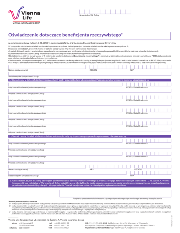 Nr wniosku / Nr Polisy Oświadczenie dotyczące beneficjenta rzeczywistego* w rozumieniu ustawy z dnia 16.11.2000 r. o przeciwdziałaniu praniu pieniędzy oraz finansowaniu terroryzmu W przypadku niezłożenia oświadczenia, o którym mowa w polu nr 1 niezbędne jest złożenie oświadczenia, o którym mowa w polu nr 2; Składanie oświadczeń, o których mowa w polu nr 1 oraz w polu nr 2 nie jest konieczne o ile dotyczy: a) spółek, których papiery wartościowe są w obrocie zorganizowanym, podlegających lub stosujących przepisy prawa Unii Europejskiej w zakresie ujawniania informacji, b) podmiotów świadczących usługi finansowe na terytorium państwa członkowskiego Unii Europejskiej Oświadczenie, o którym mowa w polu nr 1 zmierza do ustalenia tożsamości beneficjenta rzeczywistego* i obejmuje w szczególności wskazanie imienia i nazwiska, nr PESEL/daty urodzenia oraz miejsca zamieszkania beneficjenta rzeczywistego; Oświadczenie, o którym mowa w polu nr 2 zmierza do ustalenia struktury własności osoby prawnej i obejmuje w szczególności wskazanie imienia i nazwiska, nr PESEL/daty urodzenia oraz miejsca zamieszkania osoby fizycznej będącej właścicielem/udziałowcem osoby prawnej bądź wskazanie oznaczenia firmy i siedziby właściciela/ udziałowca osoby prawnej; Nazwa osoby prawnej REGON NIP Siedziba spółki (miejscowość, kraj) 1. Oświadczam/-y, że beneficjentami rzeczywistymi* osoby prawnej będącej ubezpieczającym/uposażonym/uprawnionym z umowy ubezpieczenia są: Imię i nazwisko beneficjenta rzeczywistego PESEL / Data Urodzenia Miejsce zamieszkania (miejscowość, kraj) Imię i nazwisko beneficjenta rzeczywistego PESEL / Data Urodzenia Miejsce zamieszkania (miejscowość, kraj) Imię i nazwisko beneficjenta rzeczywistego PESEL / Data Urodzenia Miejsce zamieszkania (miejscowość, kraj) Imię i nazwisko beneficjenta rzeczywistego PESEL / Data Urodzenia Miejsce zamieszkania (miejscowość, kraj) 2. Oświadczam/-y, że właścicielami/udziałowcami ubezpieczającego/uposażonego/uprawnionego z umowy ubezpieczenia są: Imię i nazwisko beneficjenta rzeczywistego PESEL / Data Urodzenia Miejsce zamieszkania (miejscowość, kraj) Imię i nazwisko beneficjenta rzeczywistego PESEL / Data Urodzenia Miejsce zamieszkania (miejscowość, kraj) Nazwa osoby prawnej KRS REGON NIP Siedziba spółki (miejscowość, kraj) 3. Oświadczam, że jest mi znany obowiązek poinformowania beneficjenta rzeczywistego o przekazaniu jego danych osobowych Vienna Life TU na Życie S.A. Vienna Insurance Group z siedzibą w Warszawie, ul. Cybernetyki 7, w celu identyfikacji a także obowiązek poinformowania beneficjenta rzeczywistego o przysługującym mu prawie dostępu do treści jego danych i ich poprawiania. Oświadczam jednocześnie, że obowiązki te wykonałem/am/liśmy. Podpis/-y przedstawicieli ubezpieczającego/uposażonego/uprawnionego z umowy ubezpieczenia *Beneficjent rzeczywisty oznacza: Vienna Life Towarzystwo Ubezpieczeń na Życie S. A. Vienna Insurance Group adres infolinia ul. Cybernetyki 7 02-677 Warszawa 801 888 000 tel. fax web +48 22 460 22 22 +48 22 332 17 55 www.viennalife.pl NIP: 951-19-33-418; KRS: Sąd Rejonowy dla M. St. Warszawy w Warszawie XIII Wydział Gospodarczy Krajowego Rejestru Sądowego - numer KRS 0000056463 Wysokość kapitału zakładowego: 82 000 000 PLN (opłacony w całości) F-BENEF-1610 a) osoby fizyczne, które są właścicielami osoby prawnej lub sprawują kontrolę nad Klientem albo mają wpływ na osobę fizyczną, w imieniu której przeprowadzana jest transakcja lub prowadzona jest działalność, b) osoby fizyczne, które są udziałowcami lub akcjonariuszami lub posiadają prawo głosu na zgromadzeniu wspólników w wysokości powyżej 25% w tej osobie prawnej, w tym za pomocą pakietów akcji na okaziciela, z wyjątkiem spółek, których papiery wartościowe są w obrocie zorganizowanym, podlegających lub stosujących przepisy prawa Unii Europejskiej w zakresie ujawniania informacji, a także podmiotów świadczących usługi finansowe na terytorium państwa członkowskiego Unii Europejskiej albo państwa równoważnego – w przypadku osób prawnych, c) osoby fizyczne, które sprawują kontrolę nad co najmniej 25% majątku – w przypadku podmiotów, którym powierzono administrowanie wartościami majątkowymi oraz rozdzielanie takich wartości, z wyjątkiem podmiotów wykonujących czynności, o których mowa w art. 69 ust. 2 pkt 4 ustawy z dnia 29 lipca 2005 r. o obrocie instrumentami finansowymi
