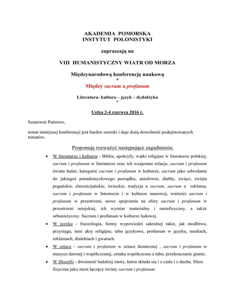 AKADEMIA POMORSKA INSTYTUT POLONISTYKI zapraszają na VIII HUMANISTYCZNY WIATR OD MORZA Międzynarodową konferencję naukową * Między sacrum a profanum Literatura- kultura – język – dydaktyka * Ustka 2-4 czerwca 2016 r. Szanowni Państwo, temat niniejszej konferencji jest bardzo szeroki i daje dużą dowolność podejmowanych tematów. Proponuję rozważyć następujące zagadnienia: W literaturze i kulturze - Biblia, apokryfy, wątki religijne w literaturze polskiej, sacrum i profanum w literaturze oraz ich wzajemne relacje, sacrum i profanum świata baśni, kategorie sacrum i profanum w kulturze, sacrum jako odwołanie do jakiegoś ponadzmysłowego porządku, aniołowie, diabły, święci, święta pogańskie, chrześcijańskie, świeckie, tradycja a sacrum, sacrum a reklama, sacrum i profanum w Internecie i w kulturze masowej, wartości sacrum i profanum w przestrzeni, nowe spojrzenie na sfery sacrum i profanum w przestrzeni miejskiej, ich wymiar materialny i metafizyczny, a także urbanistyczny. Sacrum i profanum w kulturze ludowej. W języku - frazeologia, formy wypowiedzi sakralnej takie, jak modlitwa, przysięga, inne akty religijne, tabu językowe, profanum w języku, mediach, reklamach, dialektach i gwarach. W sztuce - sacrum i profanum w sztuce ikonicznej , sacrum i profanum w muzyce dawnej i współczesnej, sztuka współczesna a tabu, przekraczanie granic. W filozofii - dwoistość ludzkiej istoty, która składa się i z ciała i z ducha. Sfera fizyczna jako most łączący światy sacrum i profanum. Sacrum i profanum w myśleniu o ojczyźnie. Problematyka sacrum i profanum w dydaktyce polonistycznej Konferencja odbędzie się jak zawsze w Ustce, w gościnnym dla nas hotelu Rejs Dokładne dane hotelu i dojazdu zostaną przesłane Państwu w dalszym terminie. W ramach opłaty uczestnikom konferencji proponujemy: obrady w niepowtarzalnej naukowej atmosferze, 2 noclegi, wyżywienie i uroczystą kolację w pięknym luksusowym hotelu w nadmorskim kurorcie oraz dodatkowe atrakcje. Po każdej konferencji wydajemy w ciągu roku publikację Karty zgłoszeń oraz tezy wystąpień prosimy przesłać w nieprzekraczalnym terminie 25. 04. 2016 r. na adres organizatora konferencji: Grażyna Różańska Instytut Polonistyki Akademia Pomorska Ul. Arciszewskiego 22a 76-200 Słupsk oraz drogą elektroniczną na adres [email protected] OPŁATA OGÓŁEM 590zł Opłata z jednym noclegiem 470 złotych NR KONTA : zostanie podany w najbliższym czasie Opłata obejmuje: materiały konferencyjne koszt publikacji noclegi w luksusowym hotelu z wyżywieniem uroczystą kolacją udział w imprezach towarzyszących KARTA ZGŁOSZENIA UCZESTNICTWA Między sacrum a profanum * Literatura- kultura – język - dydaktyka 1. Tytuł, stopień, ......................................................................................................................... 2. Imię i nazwisko……................................................................................................................ 3. Miejsce i adres pracy.............................................................................................................. ...................................................................................................................................................... 4. Adres dla korespondencji....................................................................................................... ....................................................................................................................................................... e-mail............................................................................................................................................ tel/ fax. ............................................................................ 5. Dane do faktury....................................................................................................................... ....................................................................................................................................................... ....................................................................................................................................................... 5. Zgłaszam wygłoszenie (referatu, komunikatu, doniesienia - właściwe podkreśl) na temat:...................................................................................................................................... ....................................................................................................................................................... ....................................................................................................................................................... 5. Do mojego wystąpienia niezbędne będą następujące środki techniczne (właściwe podkreśl lub dopisz): rzutnik pisma, magnetowid + monitor, rzutnik multimedialny, inne:……………………………………………………………………… 6. Proszę zarezerwować miejsce w hotelu (właściwe podkreślić) przed konferencją .......... płatne indywidualnie na miejscu po konferencji................. płatne indywidualnie na miejscu UWAGA: za dodatkowe noclegi opłatę ponosi osoba zainteresowana na miejscu 110 zł