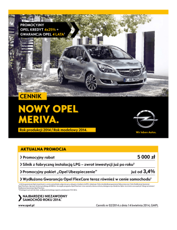 PROMOCYJNY OPEL KREDYT 4x25% + GWARANCJA OPEL 4 LATA1 CENNIK NOWY OPEL MERIVA. Rok produkcji 2014 / Rok modelowy 2014. AKTUALNA PROMOCJA 5 000 zł Promocyjny rabat Silnik z fabryczną instalacją LPG – zwrot inwestycji już po roku2 Promocyjny pakiet „Opel Ubezpieczenie” już od 3,4% Wydłużona Gwarancja Opel FlexCare teraz również w cenie samochodu1 1 4-letnia gwarancja Opel zawarta jest w cenie samochodu wyłącznie przy zakupie w kredycie 4x25% i obejmuje 2 lata standardowej gwarancji fabrycznej oraz 2 lata Wydłużonej Gwarancji Opel FlexCare z łącznym limitem przebiegu 60 000 km. Szczegóły programu Opel FlexCare i inne warianty okresu ochrony dostępne są u Dealerów Opla i na stronie www.opel.pl / Usługi serwisowe / Wydłużona Gwarancja Opel FlexCare. *W kategorii aut od 2 do 3 lat, według niemieckiego raportu usterkowości TÜV 2014. NAJBARDZIEJ NIEZAWODNY SAMOCHÓD ROKU 2014.* www.opel.pl Cennik nr 02/2014 z dnia 14 kwietnia 2014, GMPL Cennik – Nowy Opel Meriva Rok produkcji 2014, rok modelowy 2014 Ceny promocyjne* Essentia Enjoy Design Edition Cosmo 1.4 (100 KM) M5 49 950 53 150 55 350 59 700 1.4 Turbo (120 KM) M5 53 800 57 000 59 200 63 550 1.4 Turbo (120 KM) Start/Stop M5 55 000 58 200 60 400 64 750 1.4 Turbo (120 KM) M6 54 700 57 900 60 100 64 450 1.4 Turbo (120 KM) A6 – 63 900 66 100 70 450 M5 – 59 000 61 200 65 550 1.4 Turbo (140 KM) M6 – 61 000 63 200 67 550 1.4 Turbo (140 KM) A6 – 67 900 70 100 74 450 1.3 CDTI (75 KM) M5 56 750 59 950 62 150 66 500 1.3 CDTI (95 KM) ecoFLEX M5 61 150 64 350 66 550 70 900 1.3 CDTI (95 KM) ecoFLEX Start/Stop M5 62 350 65 550 67 750 72 100 1.6 CDTI (110 KM) Start/Stop M6 65 650 68 850 71 050 75 400 1.7 CDTI (110 KM) A6 – 71 450 73 650 78 000 1.6 CDTI (136 KM) Start/Stop M6 – 73 250 75 450 79 800 1.4 Turbo (120 KM) LPGTEC 2 * Dokładny opis całej oferty promocyjnej znajduje się na stronie www.opel.pl w sekcji promocje lub dostępny jest u Dealerów marki Opel. Ceny promocyjne dotyczą klientów indywidualnych (detalicznych). Klientów flotowych (firmy i przedsiębiorstwa prowadzące działalność gospodarczą bądź instytucje prowadzące działalność społeczną, zarejestrowane w Polsce i rejestrujące auto na terenie Polski) w sprawie zapytań ofertowych prosimy o kontakt z wybranym Dealerem marki Opel. 2 Zwrot kosztów instalacji fabrycznej w promocyjnej cenie 2 000 zł już po roku przy założeniach: roczny przebieg 20 000 km; średnie ceny detaliczne z dn. 26.03. 2014 r. (za www.e-petrol.pl): LPG 2,63 zł/l, Pb 95 5,58 zł/l; dla średniego spalania w cyklu mieszanym. Ceny katalogowe Essentia Enjoy Design Edition Cosmo 1.4 (100 KM) M5 54 950 58 150 60 350 64 700 1.4 Turbo (120 KM) M5 58 800 62 000 64 200 68 550 1.4 Turbo (120 KM) Start/Stop M5 60 000 63 200 65 400 69 750 1.4 Turbo (120 KM) M6 59 700 62 900 65 100 69 450 1.4 Turbo (120 KM) A6 – 68 900 71 100 75 450 1.4 Turbo (120 KM) LPGTEC M5 – 67 000 69 200 73 550 1.4 Turbo (140 KM) M6 – 66 000 68 200 72 550 1.4 Turbo (140 KM) A6 – 72 900 75 100 79 450 1.3 CDTI (75 KM) M5 61 750 64 950 67 150 71 500 1.3 CDTI (95 KM) ecoFLEX M5 66 150 69 350 71 550 75 900 1.3 CDTI (95 KM) ecoFLEX Start/Stop M5 67 350 70 550 72 750 77 100 1.6 CDTI (110 KM) Start/Stop M6 70 650 73 850 76 050 80 400 1.7 CDTI (110 KM) A6 – 76 450 78 650 83 000 1.6 CDTI (136 KM) Start/Stop M6 – 78 250 80 450 84 800 Cennik Nowego Opla Merivy, rok produkcji 2014, rok modelowy 2014, nr 02/2014 z dnia 14 kwietnia 2014 1/4 Essentia Enjoy Design Edition Cosmo AJ7 S S S S S S S S S S S/– –/S S S S S S S 950 S S S S S S S S S S – S S S S S S S S S S S S S S S S S S – – S S S S S S S – S S S – S S S S S – – S S S S S S S AY0 1 800/P S S S AJF U68 D7F UC3 K34 400 – – P – S S S S S S S S S S S S S S S – – S S S S S S 2 700 – – 700 – 1 500/P 1 400/P – – 750 500/P 850/P 400/P S S S S S S S – 1 500/P 1 400/P – – 750 500/P 850/P 400/P S S S S – – S S S S S S S S S S 1 950 – 2 950 3 200 700/P 4 200 5 700 – 300/P 1 000 1 950 500/P 2 950 3 200 – 1 500 3 000 3 500 300/P 1 000 1 950 – 2 950 3 200 – 1 500 3 000 3 500 300/P 1 000 Wyposażenie standardowe Tapicerka materiałowa czarna Układ stabilizacji toru jazdy ESP® z systemem Traction Control System Hill Start Assist - wspomaganie ruszania na pochyłościach Przednie poduszki powietrzne kierowcy i pasażera Klimatyzacja sterowana ręcznie z układem recyrkulacji Radioodtwarzacz CD/MP3 300, 4 głośniki Elektrycznie sterowane szyby przednie Elektrycznie sterowane i podgrzewane lusterka zewnętrzne Zdalnie sterowany centralny zamek Hamulec postojowy sterowany elektrycznie Stalowe obręcze kół 15” (niedostępne z 1.6 CDTI 110 KM) Stalowe obręcze kół 16” (w Essentia standard tylko z 1.6 CDTI 110 KM) Tylne fotele z systemem składania i przesuwania FlexSpace® Regulacja wysokości fotela kierowcy Kolumna kierownicy regulowana w pionie i poziomie Tylne drzwi FlexDoors® z elektroniczną blokadą otwarcia w czasie jazdy Uchwyty ISOFIX dla fotelików dziecięcych na tylnych zewnętrznych siedzeniach Zderzaki w kolorze nadwozia Boczne poduszki powietrzne kierowcy i pasażera Boczne poduszki powietrzne kierowcy i pasażera oraz kurtynowe poduszki powietrzne w obu rzędach siedzeń Aktywne zagłówki foteli przednich (w Essentii dostępne tylko z Pakietem Bezpieczeństwa) Komputer pokładowy (niedostępny z 1.4 Turbo LPG) Kieszenie z tyłu oparć foteli przednich Przyciski sterowania na kierownicy Tempomat Schowki pod przednimi fotelami oraz składane stoliki w oparciach foteli przednich (niedostępne z fotelem AGR) Kierownica trójramienna pokryta skórą Konsola środkowa FlexRail® z systemem szyn Gniazdko 12V w konsoli środkowej dla drugiego rzędu siedzeń Obręcze kół ze stopów lekkich 16” Przyciemniane klosze lamp tylnych Osłona chłodnicy z listwą w kolorze matowym czarnym Światła do jazdy dziennej w technologii LED Tapicerka materiałowa z elementami sztucznej skóry, cza