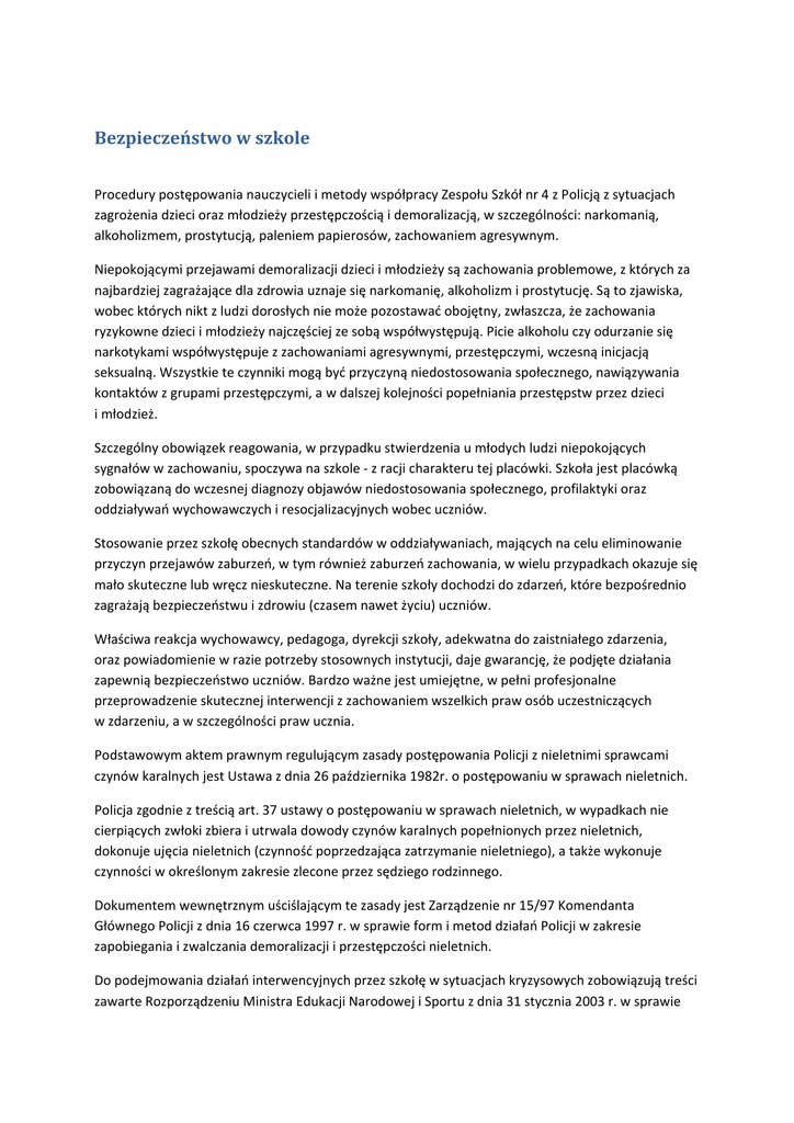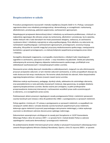 Bezpieczeństwo w szkole Procedury postępowania nauczycieli i metody współpracy Zespołu Szkół nr 4 z Policją z sytuacjach zagrożenia dzieci oraz młodzieży przestępczością i demoralizacją, w szczególności: narkomanią, alkoholizmem, prostytucją, paleniem papierosów, zachowaniem agresywnym. Niepokojącymi przejawami demoralizacji dzieci i młodzieży są zachowania problemowe, z których za najbardziej zagrażające dla zdrowia uznaje się narkomanię, alkoholizm i prostytucję. Są to zjawiska, wobec których nikt z ludzi dorosłych nie może pozostawać obojętny, zwłaszcza, że zachowania ryzykowne dzieci i młodzieży najczęściej ze sobą współwystępują. Picie alkoholu czy odurzanie się narkotykami współwystępuje z zachowaniami agresywnymi, przestępczymi, wczesną inicjacją seksualną. Wszystkie te czynniki mogą być przyczyną niedostosowania społecznego, nawiązywania kontaktów z grupami przestępczymi, a w dalszej kolejności popełniania przestępstw przez dzieci i młodzież. Szczególny obowiązek reagowania, w przypadku stwierdzenia u młodych ludzi niepokojących sygnałów w zachowaniu, spoczywa na szkole ‐ z racji charakteru tej placówki. Szkoła jest placówką zobowiązaną do wczesnej diagnozy objawów niedostosowania społecznego, profilaktyki oraz oddziaływań wychowawczych i resocjalizacyjnych wobec uczniów. Stosowanie przez szkołę obecnych standardów w oddziaływaniach, mających na celu eliminowanie przyczyn przejawów zaburzeń, w tym również zaburzeń zachowania, w wielu przypadkach okazuje się mało skuteczne lub wręcz nieskuteczne. Na terenie szkoły dochodzi do zdarzeń, które bezpośrednio zagrażają bezpieczeństwu i zdrowiu (czasem nawet życiu) uczniów. Właściwa reakcja wychowawcy, pedagoga, dyrekcji szkoły, adekwatna do zaistniałego zdarzenia, oraz powiadomienie w razie potrzeby stosownych instytucji, daje gwarancję, że podjęte działania zapewnią bezpieczeństwo uczniów. Bardzo ważne jest umiejętne, w pełni profesjonalne przeprowadzenie skutecznej interwencji z zachowaniem wszelkich praw osób uczestniczących w zdarzeniu, a w szczególności praw ucznia. Podstawowym aktem prawnym regulującym zasady postępowania Policji z nieletnimi sprawcami czynów karalnych jest Ustawa z dnia 26 października 1982r. o postępowaniu w sprawach nieletnich. Policja zgodnie z treścią art. 37 ustawy o postępowaniu w sprawach nieletnich, w wypadkach nie cierpiących zwłoki zbiera i utrwala dowody czynów karalnych popełnionych przez nieletnich, dokonuje ujęcia nieletnich (czynność poprzedzająca zatrzymanie nieletniego), a także wykonuje czynności w określonym zakresie zlecone przez sędziego rodzinnego. Dokumentem wewnętrznym uściślającym te zasady jest Zarządzenie nr 15/97 Komendanta Głównego Policji z dnia 16 czerwca 1997 r. w sprawie form i metod działań Policji w zakresie zapobiegania i zwalczania demoralizacji i przestępczości nieletnich. Do podejmowania działań interwencyjnych przez szkołę w sytuacjach kryzysowych zobowiązują treści zawarte Rozporządzeniu Ministra Edukacji Narodowej i Sportu z dnia 31 stycznia 2003 r. w sprawie szczegółowych form działalności wychowawczej i zapobiegawczej wśród dzieci i młodzieży zagrożonych uzależnieniem. Paragraf 9 rozporządzenia stanowi: “Szkoły i placówki podejmują działania interwencyjne polegające na powiadomieniu rodziców i Policji w sytuacjach kryzysowych w szczególności, gdy dzieci i młodzież używają, posiadają lub rozprowadzają środki, o których mowa w § 1 cytowanego rozporządzenia”. Treść § 10 zobowiązuje szkoły i placówki do opracowania, zgodnie ze statutem, strategii działań wychowawczych i zapobiegawczych oraz interwencyjnych, wobec dzieci i młodzieży zagrożonej uzależnieniem. Strategia uwzględnia w szczególności: w punkcie 4 ‐ procedury postępowania w sytuacjach szczególnych zagrożeń związanych ze środkami odurzającymi i substancjami psychotropowymi z uwzględnieniem zadań osób podejmujących interwencję. Procedury postępowania nauczycieli w sytuacjach zagrożenia dzieci i młodzieży demoralizacją. W przypadku uzyskania informacji, że uczeń, który nie ukończył 18 lat, używa alkoholu lub innych środków w celu wprowadzenia się w stan odurzenia, uprawia nierząd, bądź przejawia inne zachowania świadczące o jego demoralizacji (naruszanie zasad współżycia społecznego, popełnienie czynu zabronionego, systematyczne uchylanie się od spełniania obowiązku szkolnego lub obowiązku nauki, włóczęgostwo, udział w działalności grup przestępczych) nauczyciel powinien podjąć następujące kroki: 1. Przekazuje uzyskaną informację wychowawcy klasy. 2. Wychowawca informuje o fakcie pedagoga / psychologa szkolnego i dyrekcję szkoły. 3. Wychowawca wzywa do szkoły rodziców/prawnych opiekunów ucznia i przekazuje im uzyskaną informację. Przeprowadza rozmowę z rodzicami oraz, w ich obecności, z uczniem. W przypadku potwierdzenia uzyskanej informacji, zobowiązuje ucznia do zaniechania negatywnego postępowania, rodziców zaś bezwzględnie do szczególnego nadzoru nad dzieckiem. 4. Jeżeli rodzice odmawiają współpracy z kadrą pedagogiczną lub nie reagują na wezwanie do stawiennictwa w szkole, a nadal z wiarygodnych źródeł napływają informacje o wymienionych wyżej przejawach demoralizacji nieletniego, szkoła pisemnie powiadamia o zaistniałej sytuacji sąd rodzinny lub Policję (specjalistę ds. nieletnich). Podobnie w sytuacji, gdy szkoła wykorzysta wszystkie dostępne jej metody oddziaływań wychowawczych, (rozmowa z rodzicami, ostrzeżenie ucznia, spotkania z pedagogiem i psychologiem, itp.) i ich zastosowanie nie przynosi oczekiwanych rezultatów. Dalszy tok postępowania leży w kompetencji tych instytucji, zgodnie z warunkami określonymi w ustawie z dnia 26 października 1982 r. o postępowaniu w sprawach nieletnich. Jeżeli uczeń p