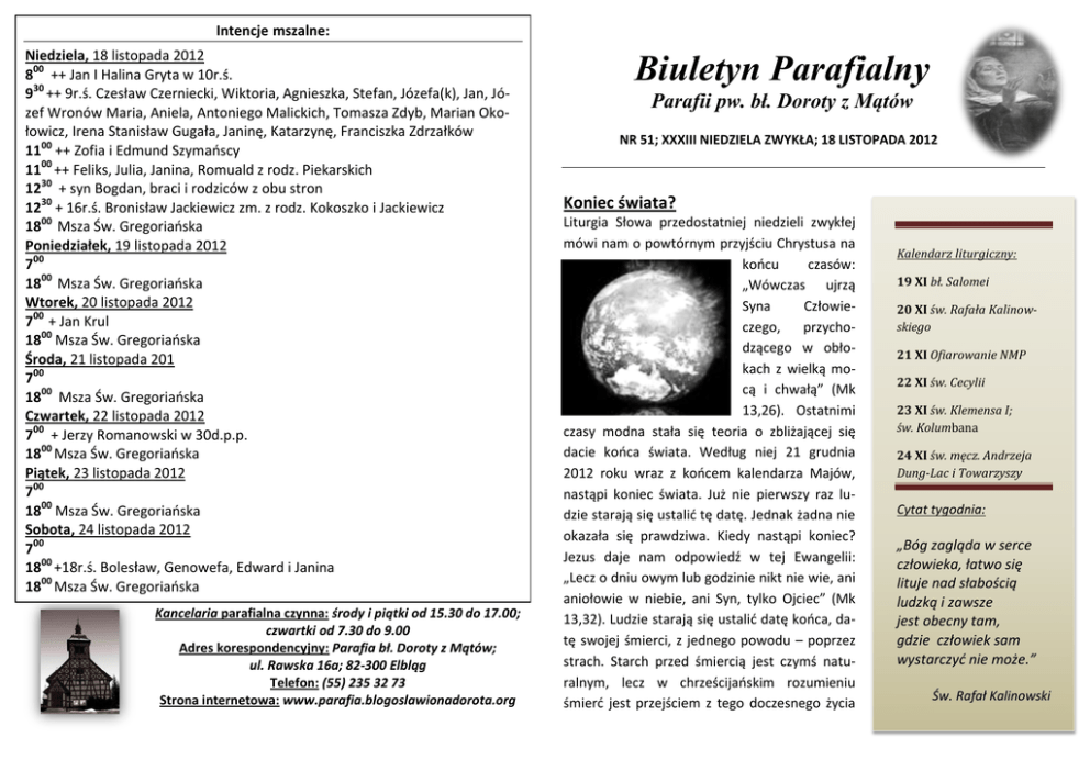 Intencje mszalne: Niedziela, 18 listopada 2012 800 ++ Jan I Halina Gryta w 10r.ś. 930 ++ 9r.ś. Czesław Czerniecki, Wiktoria, Agnieszka, Stefan, Józefa(k), Jan, Józef Wronów Maria, Aniela, Antoniego Malickich, Tomasza Zdyb, Marian Okołowicz, Irena Stanisław Gugała, Janinę, Katarzynę, Franciszka Zdrzałków 1100 ++ Zofia i Edmund Szymańscy 1100 ++ Feliks, Julia, Janina, Romuald z rodz. Piekarskich 1230 + syn Bogdan, braci i rodziców z obu stron 1230 + 16r.ś. Bronisław Jackiewicz zm. z rodz. Kokoszko i Jackiewicz 1800 Msza Św. Gregoriańska Poniedziałek, 19 listopada 2012 700 1800 Msza Św. Gregoriańska Wtorek, 20 listopada 2012 700 + Jan Krul 1800 Msza Św. Gregoriańska Środa, 21 listopada 201 700 1800 Msza Św. Gregoriańska Czwartek, 22 listopada 2012 700 + Jerzy Romanowski w 30d.p.p. 1800 Msza Św. Gregoriańska Piątek, 23 listopada 2012 700 1800 Msza Św. Gregoriańska Sobota, 24 listopada 2012 700 1800 +18r.ś. Bolesław, Genowefa, Edward i Janina 1800 Msza Św. Gregoriańska Kancelaria parafialna czynna: środy i piątki od 15.30 do 17.00; czwartki od 7.30 do 9.00 Adres korespondencyjny: Parafia bł. Doroty z Mątów; ul. Rawska 16a; 82-300 Elbląg Telefon: (55) 235 32 73 Strona internetowa: www.parafia.blogoslawionadorota.org Biuletyn Parafialny Parafii pw. bł. Doroty z Mątów NR 51; XXXIII NIEDZIELA ZWYKŁA; 18 LISTOPADA 2012 Koniec świata? Liturgia Słowa przedostatniej niedzieli zwykłej mówi nam o powtórnym przyjściu Chrystusa na końcu czasów: „Wówczas ujrzą Syna Człowieczego, przychodzącego w obłokach z wielką mocą i chwałą” (Mk 13,26). Ostatnimi czasy modna stała się teoria o zbliżającej się dacie końca świata. Według niej 21 grudnia 2012 roku wraz z końcem kalendarza Majów, nastąpi koniec świata. Już nie pierwszy raz ludzie starają się ustalić tę datę. Jednak żadna nie okazała się prawdziwa. Kiedy nastąpi koniec? Jezus daje nam odpowiedź w tej Ewangelii: „Lecz o dniu owym lub godzinie nikt nie wie, ani aniołowie w niebie, ani Syn, tylko Ojciec” (Mk 13,32). Ludzie starają się ustalić datę końca, datę swojej śmierci, z jednego powodu – poprzez strach. Starch przed śmiercią jest czymś naturalnym, lecz w chrześcijańskim rozumieniu śmierć jest przejściem z tego doczesnego życia Kalendarz liturgiczny: 19 XI bł. Salomei 20 XI św. Rafała Kalinowskiego 21 XI Ofiarowanie NMP 22 XI św. Cecylii 23 XI św. Klemensa I; św. Kolumbana 24 XI św. męcz. Andrzeja Dung-Lac i Towarzyszy Cytat tygodnia: „Bóg zagląda w serce człowieka, łatwo się lituje nad słabością ludzką i zawsze jest obecny tam, gdzie człowiek sam wystarczyć nie może.” Św. Rafał Kalinowski do życia wiecznego. Nadzieją na zbawienie jest sam Jezus Chrystus, który jest „Zmartwychwstaniem i Życiem”. Kto w Niego wierzy „żyć będzie”(por. J 11,2526). Myśląc o czasie poprzedzającym powtórne przyjście Chrystusa, nasuwają się obrazy kataklizmów, opisywanych przez Apokalipsę św. Jana. Jednak księga ta nie ma przesłania, które ma przerażać. Ukazuje, że czas, prędzej czy później, się dopełni, a my zawsze tak samo mamy być wierni Bogu i z nadzieją czekać na powtórne przyjście Pana: „Przyjdź, Panie Jezu” (Ap 22,20). Święci znani… i nie znani Św. Rafał Kalinowski Urodził się 1 września 1835 r. w Wilnie. Na chrzcie otrzymał imię Józef. Po ukończeniu z wyróżnieniem Instytutu Szlacheckiego w Wilnie (1843-1850), Józef podjął studia w Instytucie Agronomicznym w Hory-Horkach koło Orszy. Zrezygnował z nich po dwu latach. W 1855 r. przeniósł się do Mikołajewskiej Szkoły Inżynierii Wojskowej w Petersburgu, gdzie uzyskał tytuł inżyniera. Jednocześnie wstąpił do wojska. Wtedy właśnie przestał przystępować do sakramentów świętych, do kościoła chodził rzadko, przeżywał rozterki wewnętrzne, a także kłopoty związane ze swoją narodowością, służbą w wojsku rosyjskim i zdrowiem. Wciąż jednak stawiał sobie pytanie o sens życia. Po ukończeniu szkoły (1855) został adiunktem matematyki i mechaniki budowlanej oraz awansował do stopnia porucznika. Został członkiem Rządu Narodowego i objął stanowisko ministra wojny w rejonie Wilna. W końcu zdecydował się na wyjazd do Warszawy, gdzie chciał podjąć leczenie i miał nadzieje na znalezienie pracy. Z powodów zdrowotnych otrzymał zwolnienie z wojska w maju 1863 r. Jednocześnie, wspierany modlitwami matki i rodzeństwa, przeżywał nawrócenie religijne, m.in. pod wpływem lektury Wyznań św. Augustyna: nie tylko wrócił do praktyk religijnych, ale przejawiał w nich szczególną gorliwość. Gdy wybuchło powstanie styczniowe, mając świadomość jego daremności, ale zarazem nie chcąc stać na uboczu, przyłączył się do powstania. Sprzeciwiał się niepotrzebnemu rozprzestrzenianiu się walk. Po upadku powstania powrócił do Wilna, gdzie 24 marca 1864 r. został aresztowany i osadzony w więzieniu. W wyniku procesu skazano go na karę śmierci. Władze carskie zamieniły mu wyrok na dziesięcioletnią katorgę na Syberii. Przez pewien czas przebywał w Nerczyńsku, potem w Usole nad Anga, następnie w Irkucku i Smoleńsku. Podczas pobytu na Syberii oddziaływał na współtowarzyszy swoją głęboką religijnością, zadziwiał niezwykłą wprost mocą ducha, ujmował cierpliwością i delikatnością, wspierał dobrym słowem i modlitwą. Po ciężkich robotach Józef Kalinowski powrócił do kraju w 1874 r. Uzyskał paszport i wyjechał na Zachód jako wychowawca młodego księcia Augusta Czartoryskiego. Opiekował się nim przez trzy lata. W lipcu 1877 r., mając już 42 lata, Józef Kalinowski wstąpił do nowicjatu karmelitów w Grazu (Austria), przybierając zakonne imię Rafał od św. Józefa. Po studiach filozoficznych i teologicznych na Węgrzech, złożył śluby zakonne i otrzymał święcenia kapłańskie 15 stycznia 1882 r. w Czernej koło Krakowa. W kilka miesięcy póź