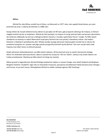 cc-bookings.com Mihau Michał Pec aka Mihau urodził się w Polsce, na Mazurach w 1977 roku, tam spędził dzieciństwo, po czym przeniósł się wraz z rodziną do Niemiec w 1988 roku. Swoją miłość do muzyki elektronicznej odkrył na początku lat 90-tych, gdy przyjaciel zabrał go do miejsca, w którym niegdyś mieścił się bar ze striptizem. Michał do dziś pamięta, że miejsce to wciąż pokryte było czerwonym aksamitem, ale wówczas odbywały się tam już undergroundowe imprezy z muzyką z gatunków House i Jungle. Po kilku latach chodzenia na imprezy w całych Niemczech kupił parę Technics'ów oraz prosty 2-kanałowy mikser i był stałym klientem u lokalnych sprzedawców płyt. Wtedy zaczęły się jego pierwsze imprezy gdzie wcielał się w rolę dj. Na przełomie tysiącleci on i prawie cała jego paczka przyjaciół przenieśli się do Berlina. Tam sam zaczął robić małe imprezy oraz after-hours na których grywał. Dzięki zebranym doświadczeniom, po kilku latach zabawy z dj`ką stworzył wraz ze swoim ówczesnym kolegą Oliver`Em Koletzkim pierwszy biznes. Była to wytwórnia muzyczna "Stil vor Talent", której w tej chwili nikomu nie trzeba przedstawiać. Niestety po kilku latach ich drogi się rozeszły. Mihau grywał w legendarnym dla berlińskiego podziemia miejscu o nazwie Hangar oraz takich klubach jak Berghain, Berghain Kantine i Studio54. Jego sety to mieszanka muzyczna, począwszy od dubowych deep housów przez chicago i acid house, aż po tech house. Niewątpliwie Michał to wielka nadzieja agencji C&C bookings. C&C BOOKINGS ul. Marchewkowa 7/15 Wrocław 52-311 Poland [email protected] +48 502 396 060 Rafał Cały +48 796 492 892 Marta Majer VAT-ID/NIP: PL8971704756 REGON: 021729064 Page 01
