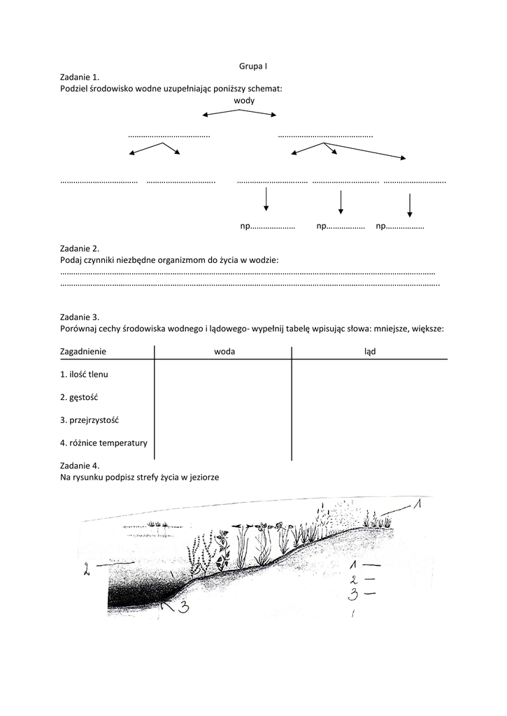 Grupa I Zadanie 1. Podziel środowisko wodne uzupełniając poniższy schemat: wody ……………………………….. …………………………………….. ……………………………… ………………………….. …………………………… …………………………. ……………………….. np………………… np……………… np……………… Zadanie 2. Podaj czynniki niezbędne organizmom do życia w wodzie: ………………………………………………………………………………………………………………………………………………………… ………………………………………………………………………………………………………………………………………………………….. Zadanie 3. Porównaj cechy środowiska wodnego i lądowego- wypełnij tabelę wpisując słowa: mniejsze, większe: Zagadnienie woda 1. ilość tlenu 2. gęstość 3. przejrzystość 4. różnice temperatury Zadanie 4. Na rysunku podpisz strefy życia w jeziorze ląd Grupa II Zadanie 1. Nazwij zaznaczone elementy komórki roślinnej i zwierzęcej, a następnie uzupełnij zdania: a) Komórki roślinne pod względem odżywiania są ………………………………………………….., bo zawierają ……………………………………. . Zachodzi w nich proces …………………………………………………. . W łańcuchu pokarmowym rośliny stanowią ogniwo zwane…………………………………………………………….. . b) Komórki zwierzęce nie posiadają ………………………………………….. i …………………………………………………. . Pod względem odżywiania są………………………………………………….. . Większość bakterii, grzyby i zwierzęta pobierają pokarm ze ……………………………………………………………. . Zadanie 2. Rozpoznaj poniższe zwierzęta i podpisz ich nazwy: Zadanie 3. Z poniższych organizmów ułóż łańcuch pokarmowy: płoć, plankton roślinny, szczupak, okoń …………………………………………………………………………………………………………………………………………….. Zadanie 4. Uzupełnij zdania: a) Pantofelek porusza się za pomocą……………………………………, ameba-…………………………………., a stułbia przyczepia się do podłoża …………………………………………………………. . b) Pantofelek, ameba i stułbia oddychają ……………………………………………………………………………………… . c) Stułbia rozmnaża się przez …………………………………… lub …………………………………………. a pantofelek – przez……………………………………….. lub ……………………………………………….. . d) Ciało stułbi ma zdolność odtwarzania utraconych części ciała czyli ………………………………………………. . e) Stułbia ma na ramionach komórki …………………………………………………… służące do obrony i zdobywania pokarmu. Grupa III Zadanie 1. Rozpoznaj poniższe organizmy i podpisz je: Zadanie 2. Podkreśl zdania opisujące rozwielitkę i oczlika: - Są to zwierzęta planktonowe. -Nie wchodzą w skład planktonu. -Oddychają skrzelami. -Oddychają całą powierzchnią ciała. -Poruszają się za pomocą czułek. -Poruszają się za pomocą rzęsek. Zadanie 3. Uzupełnij zdania o raku wpisując odpowiednie wyrazy: Ciało raka jest zbudowane z …………………………………………. I ……………………………………………, pokryte jest …………………………………………………………………………………………. . Oddycha ………………… tlenem rozpuszczonym w wodzie. Co pewien czas …………………………………………………. czyli zrzuca pancerz chitynowy. W tym okresie rak bardzo szybko rośnie, a ten wzrost nazywa się …………………………………………………………… . Rak ma ……………….. par odnóży krocznych. Pierwsza para ………………………………….. służą do obrony i zdobywania pokarmu. W razie utraty mogą ulec ………………. czyli ponownemu odrośnięciu. Rak występuje w ……………………………….. wodach – jest więc wskaźnikiem czystości wód. Zadanie 4. Spośród podanych gatunków ryb wypisz tylko słodkowodne a gatunki chronione podkreśl zielonym kolorem: makrela, płoć, szczupak, rekin, śledź, karp, okoń, strzebla przekopowi, ciosa, lin , sum, jesiotr zachodni …………………………………………………………………………………………………………………………………………………… Grupa IV Zadanie 1. Nazwij zaznaczone na rysunku części ciała żaby: Zadanie 2. Wpisz do odpowiednich rubryk tabelki cechy płazów: oddychanie workowatymi płucami i skórą, długie tylne kończyny spięte błoną pławną, nozdrza zamykane klapkami, pierzaste skrzela kijanki, opływowy kształt ciała, śluz zmniejszający tarcie, chwytne kończyny przednie, ubarwienie maskujące cechy ułatwiające życie na lądzie cechy ułatwiające życie w wodzie Zadanie 3. Wyjaśnij, dlaczego płazy są pod ochroną prawną: ……………………………………………………………………………………………………………………………………………….. Zadanie 4. Schemat przedstawia podział płazów. Rozpoznaj gatunki zwierząt należących do poszczególnych grup i podpisz je: Płazy bezogonowe ogoniaste Grupa V Zadanie 1. Poniższe zdania mówią o rozmnażaniu i rozwoju płazów. Skreśl błędne wyrazy lub dopisz inne, aby powstały zdania prawdziwe: - Płazy to zwierzęta wodno – lądowe, bo rozmnaż