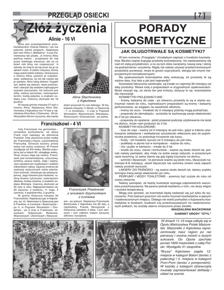 PRZEGLĄD OSIECKI ZłóŜ Ŝyczenia Alinie - 16 VI Alina jest prawdopodobnie przekształceniem imienia Helena i nie ma patronki wśród świętych. Najbliższa jest nam Alina z „Balladyny”. Łucja Danielewska tak pisała: „w imieniu Aliny pachną maliny - przypisane do niej przez wielkiego wieszcza, ale na co dzień nikt Aliny nie rozpieszcza”. A szkoda, bo imię to aż się prosi, by je na rękach nosić. A zatem wszyscy, którzy mają wokół siebie kobiety i dziewczyny o imieniu Alina, powinni je rozpieszczać, zwłaszcza, że nie tak często się je spotyka. Aliny lubią dobrze i bogato żyć, ładnie się ubierać, wiele podróżować i otaczać się osobami zajmującymi wysokie stanowiska. Ich kolorem jest żółty, rośliną żarnowiec, zwierzęciem termin, liczbą jedynka, a znakiem zodiaku Lew. Imieniny obchodzi też 16 grudnia. W naszej gminie mieszka 27 pań o imieniu Alina. Najstarsza Alina Stachowska z Kąkolewa ma 74 lata a najmłodsza Alina Boś z Osiecznej - 20 lat. Wszystkim Alinom życzymy, aby każdy PORADY KOSMETYCZNE JAK DŁUGOTRWAŁE SĄ KOSMETYKI? Alina Stachowska z Kąkolewa dzień przynosił im coś dobrego. W Kąkolewie mieszka 11 Alinek, w Osiecznej - 7, w Grodzisku - 4 oraz w Popowie Wonieskim, Wojnowicach, Witosławiu, Świerczynie i Drzeczkowie - po jednej. Franciszkowi - 4 VI Imię Franciszek ma germańsko romańskie pochodzenie, od słowa Frank czyli należący do plemienia Franków. Imię utworzone przez matkę św. Franciszka z Asyżu, z pochodzenia Francuzkę. Oznacza szczery, prosty wolny lub wolno urodzony. W Polsce występuje od XIII wieku. Bardzo popularny był w latach 30. ubiegłego wieku. Teraz znowu staje się modny. Franciszek jest konserwatywny, uczuciowy, ambitny, pewny siebie, stały i lojalny. Jest niezależnym myślicielem i wielkim miłośnikiem natury. Uparcie zmierza do realizacji wytyczonych sobie planów. Ceni wolność, interesuje się wiedzą tajemną. Jego kolorem jest niebieski, rośliną drzewo cytrynowe, zwierzęciem albatros, liczbą czwórka, a znakiem zodiaku Bliźnięta. Imieniny obchodzi aż 35 razy w roku. Najpopularniejsze są: 25 stycznia, 2 kwietnia, 11 maja, 4 czerwca, 4 października, 3 grudnia. W gminie Osieczna mieszka 35 Franciszków. Najwięcej żyje w Kąkolewie, bo 10. Natomiast w Osiecznej jest 6 Franków, w Łoniewie i Świerczynie po 4, w Popowie Wonieskim i Grodzisku - po 2 oraz w Frankowie, Jeziorkach, Dobramyśli, Wolkowie, Wojnowicach i Ziemnicach i Kleszcze- [7] Franciszek Pawłowski z wnukiem Szymonkiem z Łoniewa wie - po jednym. Najstarszy Franciszek Bartkowiak z Kąkolewa ma 92 lata, a najmłodszy Franek Skrzypczak z Osiecznej zaledwie 4 latka. I tym starszym i tym całkiem małym życzymy zdrowia i szczęścia. W tym numerze „Przeglądu” chciałabym napisać o trwałości kosmetyków. Bardzo często kupując produkty kosmetyczne, nie zastanawiamy się nad ich datą przydatności, a co za tym idzie narażamy naszą cerę i skórę na podrażnienia i uczulenia. Nigdy nie należy używać przeterminowanych produktów ponieważ, może to grozić wypryskami, alergią lub innymi nieprzyjemnymi konsekwencjami. Na opakowaniach kosmetyków daty wskazują, że produkty te są ważne dwa, trzy lata a jak jest naprawdę? Kosmetyki fabrycznie zamknięte, są trwałe co najmniej 30 miesięcy od daty produkcji. Mowa tutaj o preparatach w oryginalnych opakowaniach. Może okazać się, że okres ten jest krótszy, dotyczy to np. kosmetyków dla niemowląt. KOSMETYKI PIELĘGNACYJNE: - kremy, balsamy do ciała - po otwarciu produkty te są w stanie wytrzymać nawet do roku, najtrwalszymi preparatami są kremy i balsamy perfumowane, ze względu na zawartość alkoholu, - kremy do oczu - trwałość do 3 miesięcy później mogą podrażniać, - preparaty do demakijażu - produkty te zachowują swoje właściwości do 2 lat po otwarciu, - preparaty do opalania - jeżeli preparat podczas użytkowania nie leżał na słońcu, może nam posłużyć do 2 lat, KOSMETYKI KOLOROWE: - tusz do rzęs - ważny od 3 miesięcy do pół roku, gdyż w trakcie użytkowania (wkładania i wykładania) szczoteczki wtłaczane jest do pojemniczka powietrze, co powoduje kruszenie się tuszu, - fluidy - ich trwałość wynosi od 3 miesięcy do pół roku, - podkłady w płynie lub w kompakcie - ważne do roku, - róż i puder w kamieniu - trwałe do 2 lat - kredki do oczu, cienie i konturówki - ważne są około dwóch lat, jednak należy pamiętać, aby miały na sobie swoje zatyczki, w przeciwnym razie wyschną, to samo stanie się gdy będą trzymane na słońcu, - szminki i błyszczyki - te pierwsze ważne są około roku, błyszczyki natomiast 6-8 miesięcy. Jeżeli błyszczyk lub szminka zmieni swój zapach należy produkt wyrzucić, LAKIERY DO PAZNOKCI - są ważne około dwóch lat, lakiery szybko schnące tracą swoje właściwości po roku, PERFUMY I WODY TOALETOWE - powinny być zużyte do roku od czasu otwarcia. Należy pamiętać, że każdy kosmetyk wymaga odpowiednich warunków przechowywania. Na pewno jednak każdemu z nich, nie służy wilgoć i wysoka temperatura. Mogą one sprawić, że kosmetyki będą nadawać się już tylko do wyrzucenia. Pod żadnym pozorem nie wolno trzymać kosmetyków w jasnym i nasłonecznionym miejscu. Dlatego nie warto pomyśleć o kupowaniu kosmetyków w kioskach, budkach czy przechowywanych na nasłonecznionych półkach, bo zostały dawno zniszczone przez światło. MAGDALENA MAĆKOWIAK GABINET URODY "STYL" W dniach 11-13 maja odbyły się w Opolu Mistrzostwa Polski Mażoretek. Mażoretki z Kąkolewa reprezentowały nasz region po raz pierwszy i można mówić o dużym sukcesie. Do Opola zjechało ponad 1600 mażoretek z całej Polski. Wystąpiło 41 zespołów. "Bryza" Kąkolewo zajęła 12. miejsce w kategori Baton (taniec z pałeczką) i 5. miejsce w kategorii Pom-Pom (taniec z pomponami). W każdej z kategorii dziewczęta musiały zaprezentować defiladę i układ na scenie.