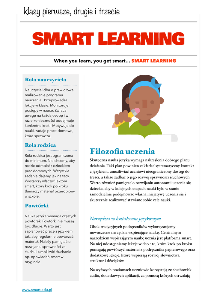 klasy pierwsze, drugie i trzecie ! When you learn, you get smart… SMART LEARNING Rola nauczyciela Nauczyciel dba o prawidłowe realizowanie programu nauczania. Przeprowadza lekcje w klasie. Monitoruje postępy w nauce. Zwraca uwagę na każdą osobę i w razie konieczności podejmuje konkretne kroki. Motywuje do nauki, zadaje prace domowe, które sprawdza. Rola rodzica Rola rodzica jest ograniczona do minimum. Nie chcemy, aby rodzic odrabiał z dzieckiem prac domowych. Wszystkie zadania dajemy jak na tacy. Wystarczy włączyć lektora smart, który krok po kroku tłumaczy materiał przerobiony w szkole. Powtórki Nauka języka wymaga częstych powtórek. Powtórki nie muszą być długie. Warto jest zaplanować pracę z językiem tak, aby regularnie powtarzać materiał. Należy pamiętać o rozwijaniu sprawności ze słuchu i umożliwić słuchanie np. opowiadań smart w oryginale. Filozofia uczenia Skuteczna nauka języka wymaga nakreślenia dobrego planu działania. Taki plan powinien zakładać systematyczny kontakt z językiem, umożliwiać uczniowi nieograniczony dostęp do treści, a także zadbać o jego rozwój sprawności słuchowych. Warto również pamiętać o rozwijaniu autonomii uczenia się dziecka, aby w kolejnych etapach nauki było w stanie samodzielnie podejmować własną inicjatywę uczenia się i skutecznie realizować stawiane sobie cele nauki.' ! Narzędzia w kształceniu językowym# Obok tradycyjnych podręczników wykorzystujemy nowoczesne narzędzia wspierające naukę. Centralnym narzędziem wspierającym naukę ucznia jest platforma smart. Na niej udostępniamy lekcje wideo - te, które krok po kroku pomagają powtórzyć materiał z podręcznika papierowego oraz dodatkowe lekcje, które wspierają rozwój słownictwa, struktur i dźwięków.' Na wyższych poziomach uczniowie korzystają ze słuchowisk audio, dodatkowych aplikacji, za pomocą których utrwalają www.smart.edu.pl Podręczniki słownictwo oraz opanowują wybrane struktury językowe.' ! Jak motywujemy# Uczniowie pracują również w domu. Odrabiają lekcje, które zawsze sprawdzamy w szkole. Ich pracę doceniamy i wynagradzamy punktami smart.' ! W Smart Learning uczniowie korzystają z naszych podręczników. Podręczniki Smart Learner napisane są pod kątem nauczania dwutorowego. Dlaczego warto uczyć się z naszego podręcznika: • zawiera szeroki zasób słów, zwrotów • każda lekcja w książce jest nagrana w formie wideo • pomaga skutecznie rozwinąć sprawność mówienia • uczy samodzielności ! Programy cenowe W roku szkolnym 2016/17 umożliwiamy specjalne niższe ceny. Aktualne informacje dot. zniżek i dofinansowania na stronie szkoły www.smart.edu.pl. www.smart.edu.pl Wyniki uczniów# Wyniki uczniów dzielimy pod względem kompetencji językowych oraz samodzielności uczenia się. W przypadku kompetencji językowych, chcemy, aby uczeń po trzecim etapie rozumiał podstawowy język mówiony, nie bał się używać poznanych słów i zwrotów oraz potrafił je wykorzystywać w różnych kontekstach. Dodatkowo chcemy, aby uczeń umiał samodzielnie uczyć się, planować i realizować stawiane sobie cele.' ! Organizacja kursu# Kurs realizowany jest w szkole w wymiarze dwóch godzin w tygodniu. Nauka przewiduje prace domowe, które uczeń odrabia przy wsparciu platformy smart, bez angażowania rodzica. Kurs rozpoczyna się w październiku i kończy w czerwcu. Aby zapisać dziecko na kurs językowy smart wystarczy wejść na www.smart.edu.pl i skontaktować się z nami.