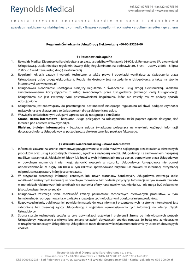 Regulamin Świadczenia Usług Drogą Elektroniczną - 00-00-23202-00 1. 2. 3. 4. 5. 1. 2. 3. 4. 5. §1 Postanowienia ogólne Reynolds Medical Diagnostyka Kardiologiczna sp. z o.o. z siedzibą w Warszawie 01-905, ul. Renesansowa 5A, zwany dalej Usługodawcą, ustala niniejszy regulamin (zwany dalej Regulaminem), na podstawie art. 8 ust. 1 ustawy z dnia 18 lipca 2002 r. o świadczeniu usług drogą elektroniczną. Regulamin określa zasady i warunki techniczne, a także prawa i obowiązki wynikające ze świadczenia przez Usługodawcę usług drogą elektroniczną. Regulamin dostępny jest na żądanie u Usługobiorcy, a także na stronie internetowej www.reymed.pl. Usługodawca nieodpłatnie udostępnia niniejszy Regulamin o świadczenie usług drogą elektroniczną, każdemu zainteresowanemu korzystającemu z usług świadczonych przez Usługodawcę (zwanego dalej Usługobiorcą). Usługobiorca nie jest związany tymi postanowieniami Regulaminu, które nie zostały mu w podany sposób udostępnione. Usługobiorca jest zobowiązany do przestrzegania postanowień niniejszego regulaminu od chwili podjęcia czynności mających na celu skorzystanie ze świadczonych drogą elektroniczną usług. W związku ze świadczonymi usługami wprowadza się następujące określenia: Strona, strona internetowa - bezpłatna usługa polegająca na udostępnieniu treści poprzez ogólnie dostępną sieć Internet, pod adresem www.reymed.pl. Biuletyn, biuletyn informacyjny - bezpłatna usługa świadczona polegająca na wysyłaniu ogólnych informacji dotyczących oferty Usługodawcy, w postaci poczty elektronicznej lub przekazu faksowego. §2 Warunki świadczenia usług - strona internetowa Informacje zawarte na stronie internetowej przygotowane są w celu możliwie najlepszego przedstawienia oferowanych produktów oraz usług i pozostałych informacji, zgodnie z najlepszą wiedzą Usługodawcy i z zachowaniem najlepszej możliwej staranności. Jakiekolwiek błędy lub braki w tych informacjach mogą zostać poprawione przez Usługodawcę w dowolnym momencie i nie mogą stanowić roszczeń w stosunku Usługodawcy. Usługodawca nie ponosi odpowiedzialności za błędy lub braki w tym zakresie, spowodowane błędami lub brakami w informacji otrzymanej od producenta aparatury której jest sprzedawcą. W przypadku prezentacji informacji cenowych lub innych warunków handlowych, Usługodawca zastrzega sobie możliwość zmiany tych informacji w dowolnym momencie bez podania przyczyny. Informacje w tym zakresie zawarte w materiałach reklamowych lub cennikach nie stanowią oferty handlowej w rozumieniu k.c. i nie mogą być traktowane jako zobowiązanie do sprzedaży. Usługodawca zastrzega sobie możliwość zmiany parametrów technicznych oferowanych produktów, w tym funkcjonalności oprogramowania, w związku z rozwojem technologicznym i udoskonalaniem produktów. Rozpowszechnianie, publikowanie i powielanie materiałów oraz informacji prezentowanych na stronie internetowej, jest zabronione bez pisemnej zgody Usługodawcy, z wyjątkiem wykorzystywania tych informacji na własny użytek Usługobiorcy. Strona stosuje technologię cookies w celu optymalizacji ustawień i preferencji Strony do indywidualnych potrzeb Usługobiorcy. Korzystanie z witryny bez zmiany ustawień dotyczących cookies oznacza, że będą one zamieszczane w urządzeniu końcowym Usługobiorcy. Usługobiorca może dokonać w każdym momencie zmiany ustawień dotyczących cookies. 1. 1. 2. 3. 4. 5. 6. 7. 8. 9. 10. 11. 12. 13. 14. 15. §3 Warunki świadczenia usług - biuletyn informacyjny Regulamin działania usługi Biuletynu informacyjnego określa Regulamin Biuletynu Informacyjnego dostępny na żądanie oraz na www.reymed.pl §4 Polityka prywatności Usług Strona realizuje funkcje pozyskiwania informacji o użytkownikach i ich zachowaniu w następujący sposób: poprzez dobrowolnie wprowadzone w formularzach informacje. poprzez zapisywanie w urządzeniach końcowych pliki cookie (tzw. "ciasteczka"). poprzez gromadzenie logów serwera www przez operatora hostingowego Inforpol NET, funkcjonującego pod adresem www.ndc.pl Informacje w formularzach. serwis zbiera informacje podane dobrowolnie przez Usługobiorcę. serwis może zapisać ponadto informacje o parametrach połączenia (oznaczenie czasu, adres IP) Dane w formularzu nie są udostępniane podmiotom trzecim inaczej, niż za zgodą Usługobiorcy. Dane podane w formularzu mogą stanowić zbiór potencjalnych klientów, zarejestrowany przez Operatora Serwisu w rejestrze prowadzonym przez Generalnego Inspektora Ochrony Danych Osobowych. Dane podane w formularzu są przetwarzane w celu wynikającym z funkcji konkretnego formularza, np w celu dokonania procesu obsługi zgłoszenia serwisowego lub kontaktu handlowego. Dane podane w formularzach mogą być przekazane podmiotom technicznie realizującym niektóre usługi – w szczególności dotyczy to przekazywania informacji o posiadaczu rejestrowanej domeny do podmiotów będących operatorami domen internetowych (przede wszystkim Naukowa i Akademicka Sieć Komputerowa j.b.r – NASK), serwisów obsługujących płatności lub też innych podmiotów, z którymi Usługodawca w tym zakresie współpracuje. Pliki cookies (tzw. „ciasteczka”) stanowią dane informatyczne, w szczególności pliki tekstowe, które przechowywane są w urządzeniu końcowym Usługobiorcę i przeznaczone są do korzystania ze Strony. Cookies zazwyczaj zawierają nazwę strony internetowej, z której pochodzą, czas przechowywania ich na urządzeniu końcowym oraz unikalny numer. Podmiotem zamieszczającym na urządzeniu końcowym Usługobiorcy pliki cookies oraz uzyskującym do nich dostęp jest Usługodawca. Pliki cookies wykorzystywane są w następujących celach: tworzenia statystyk, które pomagają zrozumieć, w jaki sposób Usługobiorcy korzystają ze stron internetowych, co umożliwia ulepszanie ich struktury i zawartości; utrzymanie sesji Usłu