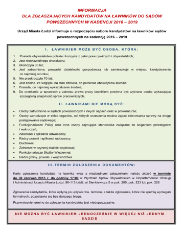 INFORMACJA DLA ZGŁASZAJĄCYCH KANDYDATÓW NA ŁAWNIKÓW DO SĄDÓW POWSZECHNYCH W KADENCJI 2016 – 2019 Urząd Miasta Łodzi informuje o rozpoczęciu naboru kandydatów na ławników sądów powszechnych na kadencję 2016 – 2019 I. ŁAWNIKIEM MOŻE BYĆ OSOBA, KTÓRA: 1. Posiada obywatelstwo polskie i korzysta z pełni praw cywilnych i obywatelskich; 2. Jest nieskazitelnego charakteru; 3. Ukończyła 30 lat; 4. Jest zatrudniona, prowadzi działalność gospodarczą lub zamieszkuje w miejscu kandydowania co najmniej od roku; 5. Nie przekroczyła 70 lat; 6. Jest zdolna, ze względu na stan zdrowia, do pełnienia obowiązków ławnika; 7. Posiada, co najmniej wykształcenie średnie; 8. Do orzekania w sprawach z zakresu prawa pracy ławnikiem powinna być wybrana osoba wykazująca szczególną znajomość spraw pracowniczych. II. ŁAWNIKAMI NIE MOGĄ BYĆ: • Osoby zatrudnione w sądach powszechnych i innych sądach oraz w prokuraturze; • Osoby wchodzące w skład organów, od których orzeczenia można żądać skierowania sprawy na drogę postępowania sądowego; • Funkcjonariusze Policji oraz inne osoby zajmujące stanowiska związane ze ściganiem przestępstw i wykroczeń; • Adwokaci i aplikanci adwokaccy; • Radcy prawni i aplikanci radcowscy; • Duchowni; • Żołnierze w czynnej służbie wojskowej; • Funkcjonariusze Służby Więziennej; • Radni gminy, powiatu i województwa. III. TERMIN ZGŁOSZENIA DOKUMENTÓW: Karty zgłoszenia kandydata na ławnika wraz z niezbędnymi załącznikami należy złożyć w terminie do 30 czerwca 2015 r. do godziny 17:00 w Wydziale Spraw Obywatelskich w Departamencie Obsługi i Administracji Urzędu Miasta Łodzi, 90-113 Łódź, ul Sienkiewicza 5 w pok. 205, pok. 223 lub pok. 226 Zgłoszenia kandydatów, które wpłyną po upływie ww. terminu, a także zgłoszenia, które nie spełnią wymagań formalnych, pozostawia się bez dalszego biegu. Przywrócenie terminu do zgłoszenia kandydatów jest niedopuszczalne. NIE MOŻNA BYĆ ŁAWNIKIEM JEDNOCZEŚNIE W WIĘCEJ NIŻ JEDNYM SĄDZIE IV. KANDYDATÓW NA ŁAWNIKÓW DO SĄDÓW REJONOWYCH I SĄDÓW OKRĘGOWYCH ZGŁASZAĆ MOGĄ RADOM GMIN W TERMINIE DO DNIA 30 CZERWCA 2015 R.: • Prezesi właściwych sądów; • Stowarzyszenia; • Inne organizacje społeczne i zawodowe, zarejestrowane na podstawie przepisów prawa, z wyłączeniem partii politycznych; • Co najmniej 50 obywateli mających czynne prawo wyborcze, zamieszkujących stale na terenie gminy dokonującej wyboru. V. DO ZGŁOSZENIA KANDYDATA NA ŁAWNIKA DOŁĄCZA SIĘ NASTĘPUJĄCE DOKUMENTY: 1. Informację z Krajowego Rejestru Karnego dotyczącą zgłaszanej osoby (koszt opłaty za wydanie informacji z KRK ponosi kandydat na ławnika). Dokument powinien być opatrzony datą nie wcześniejszą niż 30 dni przed dniem zgłoszenia; 2. Oświadczenie kandydata, że nie jest prowadzone przeciwko niemu postępowanie o przestępstwo ścigane z oskarżenia publicznego lub przestępstwo skarbowe. Dokument powinien być opatrzony datą nie wcześniejszą niż 30 dni przed dniem zgłoszenia; 3. Oświadczenie kandydata, że nie jest lub nie był pozbawiony władzy rodzicielskiej, a także, że władza rodzicielska nie została mu ograniczona ani zawieszona. Dokument powinien być opatrzony datą nie wcześniejszą niż 30 dni przed dniem zgłoszenia; 4. Zaświadczenie lekarskie o stanie zdrowia, wystawione przez lekarza, o którym mowa w art. 55 ust. 2a* ustawy z dnia 27 sierpnia 2004 r. o świadczeniach opieki zdrowotnej finansowanych ze środków publicznych (Dz. U. z 2008 r. Nr 164, poz. 1027 z późn. zm.) - stwierdzające brak przeciwwskazań do wykonywania funkcji ławnika (koszt opłaty za wystawienie zaświadczenia lekarskiego ponosi kandydat na ławnika). Dokument powinien być opatrzony datą nie wcześniejszą niż 30 dni przed dniem zgłoszenia; 5. dwa zdjęcia zgodne z wymogami stosowanymi przy składaniu wniosku o wydanie dowodu osobistego;** *art. 55 ust. 2a - Świadczeń z zakresu podstawowej opieki zdrowotnej może udzielać lekarz, z którym Fundusz zawarł umowę o udzielanie świadczeń opieki zdrowotnej albo który jest zatrudniony lub wykonuje zawód u świadczeniodawcy, z którym Fundusz zawarł umowę o udzielanie świadczeń podstawowej opieki zdrowotnej: 1) posiadający tytuł specjalisty w dziedzinie medycyny rodzinnej lub 2) odbywający szkolenie specjalizacyjne w dziedzinie medycyny rodzinnej, lub 3) posiadający specjalizację II stopnia w dziedzinie medycyny ogólnej, lub 4) posiadający specjalizację I stopnia w dziedzinie medycyny ogólnej, lub 5) posiadający specjalizację I lub II stopnia lub tytuł specjalisty w dziedzinie chorób wewnętrznych, lub 6) posiadający specjalizację I lub II stopnia lub tytuł specjalisty w dziedzinie pediatrii w zakresie swoich kwalifikacji potwierdzonych odpowiednimi dokumentami, z zastrzeżeniem art. 14 ustawy z dnia 24 sierpnia 2007 r. o zmianie ustawy o świadczeniach opieki zdrowotnej finansowanych ze środków publicznych oraz niektórych innych ustaw (Dz. U. Nr 166, poz. 1172), zwany dalej „lekarzem podstawowej opieki zdrowotnej”. ** zdjęcie powinno być kolorowe o wymiarach 35 x 45 mm odzwierciedlające, w sposób niebudzący uzasadnionych wątpliwości, wizerunek twarzy osoby przedstawiające ją w pozycji frontalnej bez nakrycia głowy i okularów. GDY KANDYDATA NA ŁAWNIKA ZGŁASZA, CO NAJMNIEJ 50 OBYWATELI DO ZGŁOSZENIA NALEŻY DOŁĄCZYĆ: 6. Listę osób, zawierająca imię (imiona), nazwisko, numer ewidencyjny PESEL, miejsce stałego zamieszkania i własnoręczny podpis każdej z pięćdziesięciu osób zgłaszających kandydata (osobą uprawnioną do składania wyjaśnień w sprawie zgłoszenia kandydata na ławnika przez obywateli jest pierwsza osoba umieszczona na liście). GDY KANDYDATA NA ŁAWNIKA ZGŁASZA STOWARZYSZENIE, INNA ORGANIZACJA SPOŁECZNA LUB ZAWODOWA ZAREJESTROWANA NA PODSTAWIE PRZEPISÓW PRAWA DO ZGŁOSZENIA NALEŻY DOŁĄCZYĆ: 7. 