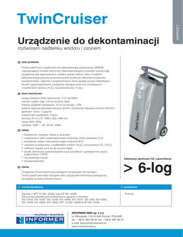 TwinCruiser Urządzenie do dekontaminacji roztworem nadtlenku wodoru i ozonem opis produktu TwinCruiser® jest urządzeniem do dekontaminacji pomieszczeń (WRDS) rozpraszającym środek chemiczny (dekontaminacyjny) w postaci suchej mgły. Urządzenie jest wyposażone w unikalny system dyfuzji, który umożliwia dekontaminację poprzez przemieszczanie środka po dekontaminowanych powierzchniach, włącznie z powierzchniami, które wydają się być niedostępne. W pełni zautomatyzowane urządzenie używane może być w połączeniu z nadtlenkiem wodoru (H2O2) lub peroxone (O3+H2O2). dane techniczne zasięg działania (metr sześcienny): 3 m3 do 200m3 rozmiar cząstki mgły: 5-8 µm (sucha mgła) średnia szybkość dozowania: 10 ml na minutę ±10% średnie stężenie dekontaminacyjne: 8ml/m3 (możliwość regulacji od 8 do 10ml/m3) generator ozonu: 5 g/godz. maksymalna wydajność: 3 ppm wymiary W x S x G: 1090 x 420 x 460 mm waga netto: 40kg zasilanie: 230V ~ 3A, 50 Hz, 700W zalety • bezpieczne, wydajne i łatwe w obsłudze • urządzenie w pełni zautomatyzowane (kolorowy ekran dotykowy PLC) • zewnętrzny system sterowania dzięki modułowi Wi-Fi • używane w połączeniu z nadtlenkiem wodoru (H2O2) lub peroxone (O3+H2O2) • wielkość cząstek od 5 do 8µ (sucha mgła) • środki chemiczne przechowywane są w szczelnych i gotowych do użycia pojemnikach z RFID. • nie powoduje korozji • biodegradowalne oferta Urządzenie TwinCruiser® jest dostępne na sprzedaż lub wynajem. TwinCruiser® jest także dostępne jako usługa dekontaminacji biologicznej. normy Szczegóły na www.informermed.eu numer katalogowy Deklaracja zgodności CE i specyfikacje > 6-log normy/dyrektywy producent Zgodne z NFT 72-281 (2009) oraz NF EN 14348 Dane przeciwbakteryjne potwierdzone zgodnie z normami: EN 13704, EN 14347, EN 14348, EN 14563, EN 13727, EN 1040, EN 14561, EN 14476, EN 13624, EN 14562, NFT 72-281 (2009) & NF EN 14348 Francja Rozwiązania dla sterylizacji i dezynfekcji INFORMER MED sp. z o.o. ul. Winogrady 118, 61-626 Poznań, POLAND tel.: +48 61 664 38 00, fax: +48 61 664 38 19 e-mail: [email protected] www.informermed.eu przeznaczenie Urządzenie do dekontaminacji przeznaczone dla pomieszczeń o wysokim zagrożeniu: bloki operacyjne, oddziały chorób zakaźnych, OIOM, laboratoria, pomieszczenia do przygotowywania żywności, strefy kwarantanny. dane chemiczne • nadtlenek wodoru: stężenie 7,5% (od 7 do 8% udziału wagowego - dla przedziału) • okres trwałości: nie mniej niż 24 miesiące • okres trwałości po załadunku: 3 miesiące, nie przekraczając okresu trwałości • opakowanie: 2 x 2,5 l / pojemnik (pojemnik z zabezpieczeniem pokrywy) bezpieczeństwo Systemy zabezpieczeń zapobiegające przed przypadkowym uruchomieniem urządzenia. W przypadku wykrycia ruchu urządzenie przestaje działać i uruchamia alarm. System samotestujący zapewnia, że urządzenie jest sprawne. Pięciostopniowe hasło użytkownika zapewnia, że tylko osoby upoważnione mogą obsługiwać urządzenie i uzyskać dostęp do określonych danych (użytkownik, użytkownik wykwalifikowany do pracy z ozonem, nadzorca, konserwator i producent). Brak zbiornika buforowego. Brak ryzyka wycieku lub przypadkowego rozlania. Zamknięte pojemniki RFID eliminują bezpośredni kontakt ze środkiem dekontaminacyjnym. Moduły RFID zapewniają użycie tylko dopuszczonych/zatwierdzonych pojemników. Jaskrawa sygnalizacja świetlna informująca o przygotowaniu dekontaminacji, rozpoczęciu i zakończeniu cyklu. Skalibrowany czujnik temperatury i wilgotności podaje informacje o warunkach otoczenia. Zawiadomienie o niezgodności (dźwiękowe oraz wizualne). Automatyczne wyłączanie. identyfikowalność • Parametry cyklu są rejestrowane. Istnieje możliwość przeglądania historii w celu przekazania szczegółów dotyczących określonych informacji np. numer cykli, użytkownicy, pomieszczenia, wielkości, warunki w pomieszczeniu, alarmy, itp. • Dzięki Com-Pack, z każdego urządzenia można zdalnie pobierać dane niezależnie od miejsca, w którym się znajduje. komunikacja i bezpieczeństwo Standardowy dostęp przewodowy Ethernet: Modem/router posiada port kablowy Ethernet służący do wyświetlania i eksportu danych dotyczących rejestracji procesu. Standardowa konfiguracja Wi-Fi: tryb połączenia bezpośredniego Wi-Fi. W tym trybie, każde urządzenie TwinCruiser działa jako punkt dostępu Wi-Fi (w tym port Ethernet). Komputer, tablet lub smartfon może połączyć się z urządzeniem TwinCruiser z Wi-Fi za pomocą standardowej procedury nawiązywania połączeń DHCP. Bezprzewodowy dostęp do Internetu za pomocą sieci (tryb repeater jako dodatkowa opcja: W tym trybie, bezprzewodowy modem/router jest ustawiony w trybie repeater w istniejącej sieci WIFI (w tym port Ethernet). deklaracja zgodności CE (oceniona i zatwierdzona przez jednostkę notyfikowaną COFRAC) • badania zgodności elektromagnetycznej • wymagania bezpieczeństwa • sprawozdanie z badania zgodności elektromagnetycznej • sprawozdanie z badania zgodności elektromagnetycznej • sprawozdanie z badania drogą radiową EN 61326-1, EN 301 489-3, EN 301 489-17 EN 61010-1:2010 IEC 61010-1:2010 + dev. CENELEC EN 61010-1:2010 EN 50364 EN 62479 EN 300 328 V 1.7.1 (2006-10) EN 300 330-1 V 1.7.1 (2010-02) EN 300 330-2 V 1.5.1 (2010-02) kontrola procesu • ciągłe elektroniczne monitorowanie stężenia czynnika biobójczego w pomieszczeniu podczas procesu i po procesie • redukcja potwierdzona testem biologicznym dla procesu • redukcja potwierdzona wskaźnikiem chemicznym dla procesu Rozwiązania dla sterylizacji i dezynfekcji INFORMER MED sp. z o.o. ul. Winogrady 118, 61-626 Poznań, POLAND tel.: +48 61 664 38 00, fax: +48 61 664 38 19 e-mail: [email protected] www.informermed.eu obszary wykorzystania (lista przykładowa) ŚRODOWISKA O ZNACZENIU KRYTYCZNYM: < 6-LOG Nadtlenek wodoru (H2O2): Nadtlenek wodoru (H2O2) jest rozpylany pr