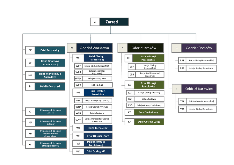 Z W BP Dział Personalny Oddział Warszawa WP BF BM BI Dział Finansów i Administracji Dział Marketingu i Sprzedaży Dział Informatyki Pełnomocnik do spraw Jakości XO Pełnomocnik do spraw Ochrony XB Pełnomocnik do spraw Bezpieczeństwa Operacyjnego XS Pełnomocnik do spraw Strategii i Rozwoju Dział Obsługi Pasażerskiej WPP Sekcja Obsługi Pasażerskiej WPR Sekcja Reklamacji Bagażowej WPM Sekcja Obsługi PRM WPK Sekcja Kas WS Dział Obsługi Samolotów WSK XJ Zarząd Sekcja Koordynacji Operacji Oddział Kraków K Dział Obsługi Pasażerskiej RPP Sekcja Obsługi Pasażerskiej KPP Sekcja Obsługi Pasażerskiej RSR Sekcja Obsługi Samolotów KPR Sekcja Kas i Reklamacji Bagażowej KP KS Dział Obsługi Samolotów KSP Sekcja Obsługi Płytowej KSS Sekcja Sortowni KSO Sekcja Obsługi Pokładowej WSP Sekcja Obsługi Płytowej WSS Sekcja Sortowni KT Dział Techniczny WST Sekcja Transportu i Obsługi Pokładowej KF Dział Obsługi Cargo WT Dział Techniczny WF Dział Obsługi Cargo WI Dział Informacji Lotniskowej WA Dział Obsługi GA Oddział Rzeszów R Oddział Katowice T TPP Sekcja Obsługi Pasażerskiej TSR Sekcja Obsługi Samolotów Zarząd Z G Oddział Gdańsk Dział Obsługi Pasażerskiej GP Oddział Poznań P PP Dział Obsługi Pasażerskiej GPP Sekcja Obsługi Pasażerskiej PPP Sekcja Obsługi Pasażerskiej GPR Sekcja Reklamacji Bagażowej PPR Sekcja Reklamacji Bagażowej GPM Sekcja Obsługi PRM PPA Sekcja Obsługi GA i VIP GPA Sekcja Obsługi GA i VIP PS Dział Obsługi Samolotów Dział Obsługi Samolotów GS GSP Sekcja Obsługi Płytowej GSK Sekcja Koordynacji Operacji GSS Sekcja Sortowni GSO Sekcja Obsługi Pokładowej GST Sekcja Obsługi Technicznej PSP Sekcja Obsługi Płytowej PSK Sekcja Koordynacji Operacji PSS PSO Sekcja Sortowni Sekcja Obsługi Pokładowej Oddział Szczecin S SPP Sekcja Obsługi Pasażerskiej SSR Sekcja Obsługi Samolotów