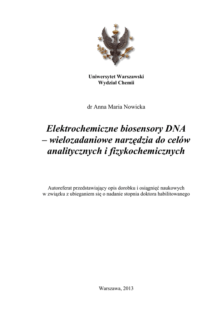 Uniwersytet Warszawski Wydział Chemii dr Anna Maria Nowicka Elektrochemiczne biosensory DNA – wielozadaniowe narzędzia do celów analitycznych i fizykochemicznych Autoreferat przedstawiający opis dorobku i osiągnięć naukowych w związku z ubieganiem się o nadanie stopnia doktora habilitowanego Warszawa, 2013 Spis treści 1. DANE PERSONALNE ...................................................................................... 5 2. INFORMACJE O POSIADANYCH DYPLOMACH I UZYSKANYCH STOPNIACH NAUKOWYCH ......................................................................... 5 3. INFORMACJE O DOTYCHCZASOWYM ZATRUDNIENIU W JEDNOSTKACH NAUKOWYCH .............................................................. 5 4. WSKAZANIE OSIĄGNIĘCIA WYNIKAJĄCEGO Z ART. 16 UST. 2 USTAWY Z DNIA 14 MARCA 2003 R. O STOPNIACH NAUKOWYCH I TYTULE NAUKOWYM ORAZ O STOPNIACH I TYTULE W ZAKRESIE SZTUKI (DZ. U. NR 65, POZ. 595 ZE ZM.) STANOWIĄCEGO PODSTAWĘ POSTĘPOWANIA HABILITACYJNEGO ...................................................................................... 6 4.1. Tytuł osiągnięcia naukowego ...................................................................... 6 4.2. Publikacje tworzące jednotematyczny cykl publikacji, opublikowane w czasopismach z bazy Journal Citation Reports ....................................... 6 4.3. Omówienie celu naukowego przedłożonych publikacji oraz najważniejszych wyników .................................................................. 8 4.4. Podsumowanie............................................................................................. 9 5. OMÓWIENIE POZOSTAŁYCH OSIĄGNIĘĆ NAUKOWO – BADAWCZYCH .............................................................................................. 10 5.1. Podsumowanie dorobku naukowego ......................................................... 10 5.2. Publikacje stanowiące dorobek naukowy (poza cyklem publikacji wymienionym w punkcie 4) przed uzyskaniem stopnia doktora, opublikowane w czasopismach z bazy Journal Citation Reports .............. 10 5.3. Publikacje stanowiące dorobek naukowy (poza cyklem publikacji wymienionym w punkcie 4) po uzyskaniu stopnia doktora, opublikowane w czasopismach z bazy Journal Citation Reports .............. 12 5.4. Podsumowanie działalności naukowej (odnośniki dotyczą listy z podpunktu 5.3.) ....................................................................................... 17 6. INNE INFORMACJE ...................................................................................... 20 3 6.1. Prowadzone zajęcia dydaktyczne .............................................................. 20 6.2. Opieka naukowa nad studentami i doktorantami ....................................... 21 6.3. Realizowane projekty badawcze ................................................................ 22 6.4. Odbyte staże w zagranicznych i krajowych ośrodkach naukowych lub akademickich ....................................................................................... 23 6.5. Nagrody uzyskane za działalność naukową ............................................... 23 6.6. Udział w krajowych i międzynarodowych konferencjach naukowych ..... 24 6.7. Recenzowanie projektów międzynarodowych lub krajowych oraz publikacji w czasopismach międzynarodowych i krajowych ............ 29 4 1. DANE PERSONALNE Imiona i Nazwisko: Anna Maria Nowicka Data i miejsce urodzenia: 08.12.1976 r., Maków Mazowiecki Miejsce pracy: Wydział Chemii, Uniwersytet Warszawski 02-093 Warszawa, ul. Pasteura 1 Stopień naukowy: doktor nauk chemicznych Telefon służbowy: 22-822-02-11 wew. 287 E-mail: [email protected] Narodowość: Polska 2. INFORMACJE O POSIADANYCH DYPLOMACH I UZYSKANYCH STOPNIACH NAUKOWYCH Doktor nauk chemicznych; Warszawa, 08.06.2005 r. Tytuł rozprawy doktorskiej: „Pochodne metalocenów jako modelowe związki do badania transportu dyfuzyjno-migracyjno-konwekcyjnego”; obroniona z wyróżnieniem Promotor: prof. dr hab. Zbigniew Stojek Magister chemii; Warszawa, 20.05.2000 r. Tytuł pracy magisterskiej: „Transport dyfuzyjno-migracyjny monopodstawionych pochodnych ferrocenu”; obroniona z wyróżnieniem Kierownik: prof. dr hab. Zbigniew Stojek 3. INFORMACJE O DOTYCHCZASOWYM ZATRUDNIENIU W JEDNOSTKACH NAUKOWYCH od 2005 r. adiunkt, Pracownia Teorii i Zastosowań Elektrod, Zakład Chemii Nieorganicznej i Analitycznej, Wydział Chemii, Uniwersytet Warszawski 5 4. WSKAZANIE OSIĄGNIĘCIA WYNIKAJĄCEGO Z ART. 16 UST. 2 USTAWY Z DNIA 14 MARCA 2003 R. O STOPNIACH NAUKOWYCH I TYTULE NAUKOWYM ORAZ O STOPNIACH I TYTULE W ZAKRESIE SZTUKI (DZ. U. NR 65, POZ. 595 ZE ZM.) 4.1. Tytuł osiągnięcia naukowego Elektrochemiczne biosensory DNA– wielozadaniowe narzędzia do celów analitycznych i fizykochemicznych 4.2. Publikacje tworzące jednotematyczny cykl publikacji, opublikowane w czasopismach z bazy Journal Citation Reports (* – autorstwo korespondencyjne habilitantki) H1. A.M. Nowicka, A. Kowalczyk, Z. Stojek, M. Hepel; „Nanogravimetric and voltammetric DNA-hybridization biosensors for studies of DNA damage by common toxicants and pollutants.” Biophys. Chem. 146 (2010) 42-53. IF = 2.283 Udział własny: 55 %; zaplanowanie i nadzorowanie badań dotyczących biosensora DNA z detekcją grawimetryczną i elektrochemiczną oraz wpływu różnych form chromu na jego pracę; przeprowadzenie syntezy próbnika redoks (ferrocen zmodyfikowany streptawidyną), napisanie wstępnej wersji publikacji, redagowanie odpowiedzi na sugestie i uwagi recenzentów. H2. A. Kowalczyk, A.M. Nowicka, R. Jurczakowski, P. Niedzialkowski, T. Ossowski, Z. Stojek; „New anthraquinone derivatives as electrochemical redox indicators for the visualization of the DNA hybridization process.” Electroanalysis 22 (2010) 49-59. IF = 2.721 Udział własny: 40 %; zaplanowanie i nadzorowanie badań dotyczących funkcjonalności wybranych nowo zsyntezowanych pochodnych antrachinonowych jako wizualizatorów procesu hybrydyzacji,