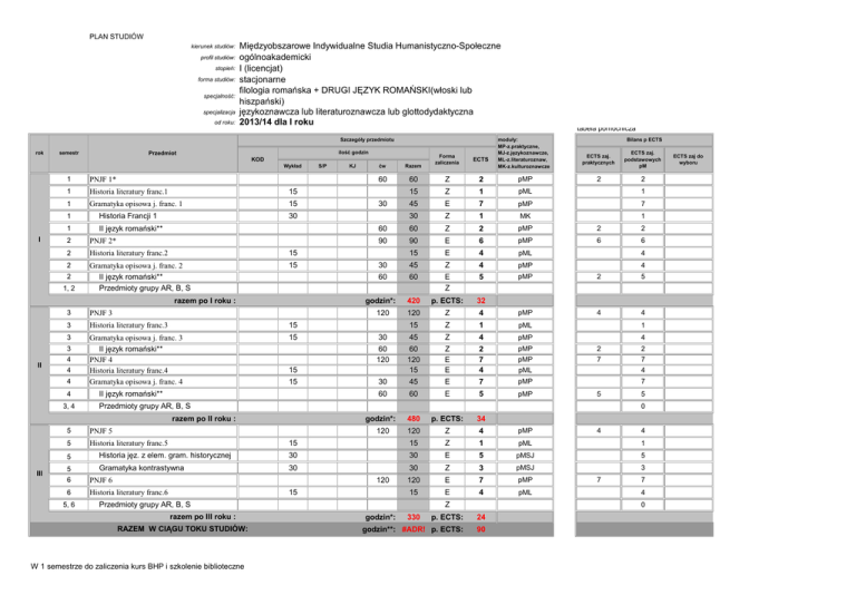 PLAN STUDIÓW kierunek studiów: profil studiów: stopień: forma studiów: specjalność: specjalizacja od roku: Międzyobszarowe Indywidualne Studia Humanistyczno-Społeczne ogólnoakademicki I (licencjat) stacjonarne filologia romańska + DRUGI JĘZYK ROMAŃSKI(włoski lub hiszpański) językoznawcza lub literaturoznawcza lub glottodydaktyczna 2013/14 dla I roku Szczegóły przedmiotu rok ilość godzin Przedmiot semestr I 1 PNJF 1* 1 Historia literatury franc.1 15 1 Gramatyka opisowa j. franc. 1 15 1 Historia Francji 1 1 II język romański** PNJF 2* 2 Historia literatury franc.2 15 Gramatyka opisowa j. franc. 2 II język romański** Przedmioty grupy AR, B, S 15 2 1, 2 razem po I roku : II 3 PNJF 3 3 Historia literatury franc.3 15 3 Gramatyka opisowa j. franc. 3 II język romański** PNJF 4 Historia literatury franc.4 Gramatyka opisowa j. franc. 4 15 3 4 4 4 4 3, 4 15 15 II język romański** ECTS zaj. praktycznych ECTS zaj. podstawowych pM 2 2 ECTS 60 Z 2 pMP 15 Z 1 pML 1 45 E 7 pMP 7 30 Z 1 MK 60 60 Z 2 pMP 2 2 90 90 E 6 pMP 6 6 15 E 4 pML 30 60 45 60 Z E Z 4 5 pMP godzin*: 420 p. ECTS: 32 120 120 Z 15 Z 30 45 60 120 15 45 60 ćw Razem 60 30 1 4 4 pMP 2 5 4 pMP 4 4 1 pML Z Z E E E 4 2 7 4 7 pMP 60 E 5 pMP godzin*: 480 p. ECTS: 34 120 30 60 120 pMP pMP 1 4 2 7 pML 2 7 4 pMP 7 5 Przedmioty grupy AR, B, S 5 0 razem po II roku : III KJ 30 2 2 S/P Bilans p ECTS Forma zaliczenia KOD Wykład tabela pomocnicza moduły: MP-z.praktyczne, MJ-z.językoznawcze, ML-z.literaturoznaw, MK-z.kulturoznawcze 120 Z 4 pMP 15 15 Z 1 pML 1 5 Historia jęz. z elem. gram. historycznej 30 30 E 5 pMSJ 5 5 Gramatyka kontrastywna 30 30 Z 3 pMSJ 120 E 7 pMP 15 E 4 pML 5 PNJF 5 5 Historia literatury franc.5 120 6 PNJF 6 6 Historia literatury franc.6 5, 6 15 Przedmioty grupy AR, B, S razem po III roku : RAZEM W CIĄGU TOKU STUDIÓW: W 1 semestrze do zaliczenia kurs BHP i szkolenie biblioteczne Z godzin*: 330 4 4 3 7 7 4 0 p. ECTS: 24 godzin**: #ADR! p. ECTS: 90 ECTS zaj do wyboru Semestr na którym można realizować przedmiot (zaznaczony jest sem preferowany) Szczegóły przedmiotu Przedmioty ruchome grupy OBOWIĄZKOWEJ (AR) do zaliczenia na dowolnym kierunku studiów Bilans p ECTS ilość godzin KOD Wykład S/P KJ ćw Forma zaliczenia ECTS moduły: MP-z.praktyczne, MJ-z.językoznawcze, ML-z.literaturoznaw, MK-z.kulturoznawcze ECTS zaj. praktycznych ECTS zaj. podstawowych Historia literatury francuskiej 30 30 Z 4 pML 4 1,2 Wstęp do językoznawstwa 30 30 Z 3 pMJ 4 1,2 Wstęp do literaturoznawstwa 30 30 Z 3 pML 4 30 Z 2 MU 1,2,3,4,5,6 30 1,2,3,4,5,6 Historia filozofii 1,2,3,4,5,6 Łacina 1 30 30 Z 2 pMP 2 1,2,3,4,5,6 Łacina 2 30 30 E 5 pMP 5 1,2,3,4,5,6 WF 30 30 Z 1 pMP 2 1 0 RAZEM W CIĄGU TOKU STUDIÓW: godzin: Przedmioty modułu specjalizacyjnego (MSJ): Semestr na specjalizacja którym można JĘZYKOZNAWCZA/LITERATUROZNAWCZA/GLOT realizować przedmiot TODYDAKTYCZNA (S) (zaznaczony jest sem (Wszystkie przedmioty są wymagane do zakończenia preferowany) 210 p. ECTS: KOD KJ ćw 0 Bilans p ECTS ilość godzin S/P 1 20 Szczegóły przedmiotu Wykład ECTS zaj do wyboru Razem Forma zaliczenia ECTS moduły: MSm.specjalizacyjne: J-z.językoznawcze ECTS zaj. praktycznych ECTS zaj. podstawowych ECTS zaj do wyboru Razem studiów) 5 Seminarium dyplomowe 1 30 30 Z 2 pMSJ 2 2 6 Seminarium dyplomowe 2 30 30 Z 2 pMSJ 2 2 6 Egzamin licencjacki 0 E 6 pMSJ 6 6 60 p. ECTS: 10 RAZEM W CIĄGU TOKU STUDIÓW: godzin: