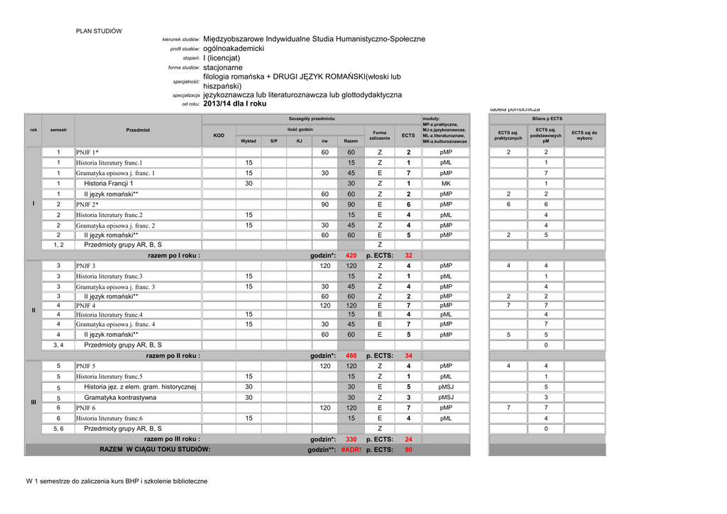 Filologia romańska I stopnia (obowiązuje od r. ak. 2013/14)
