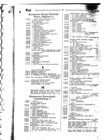 Kuratorium Okręgu Szkolnego Warsz., Bagatela 12 8 50 31 — kurator okręgu szkolnego warszaw. (dod.) sekretariat kuratora Biuro Personalne 9 38 68 — naczelnik biura persona!. — (dod.) referenci 8 29 57 — referenci Wydział Ogólny 8 52 29 — naczelnik wydz. — — (dod.) referenci 8 55 93 — wizytaterka wychowania fizycznego 8 50 23 — instruktorzy wychów, fizycznego 7 08 70 — wizytator higieny szkolnej 8 87 82 -r- wizytator przysposobienia wojskowego 8 52 17 — kierownik kancelarii — — (dod.) informacje 7 1147 *- intendent (mieszkanie) 8 29 31 - kierownik rachuby —: — — (dod.) referenci rachunkowi 8 26 86 , — referenci rachunkowi 8 30 94 ' •— do rozmów międzymiastowych 9 48 63 — szofer, Hoża SS ', Wydział Szkół Powszechnych • . . 8 4120 — naczelnik wydz. • . * 8 45 74 — wizytatorzy — „ — — (dod.) referenci Wydział Szkół średnich Ogóinokształc. i Zakła dów Kształcenia Nauczycieli 8 32 04 — naczelnik wydz. g 76 44 • — wizytatorzy ~" 8 55 87 — referenci Wydział Szkół Zawodowych 8 90 26 — naczeinik wydz. 9 73 13 — wizytatorzy 8 6125 — wizytatorzy 9 18 11 ' — referenci Oddział Oświaty Pozaszkolnej 8 35 54 — kierownik — — — (dod.) instruktorzy oświaty pozaszkolnej 9 8 9 8 9 08 70 08 11 50 DEPARTAMENT DRóO K O Ł O W Y r i u ^ ^ 08 • r e f . mostów drogowych ••fe****V 45 ref. maszyn drogowych - lljp~~-/ 07 ref. samochodów państw *' *• 89 06 * u M t t M n ? 8 80 846 2 15 12 65 44 30 42 17 8 8120 1108 32 LICEA PAŃSTWOWE MĘSKIE Budowlane, Wspólna 81 Miernicze, Wspólna 81 Prawosławne Teologiczne, Kopernika 13 . V i Gimnazjum im. ks. J. Poniatowskiego, pokój naucz., ks. Felińskiego 15 V I I i Gimnazjum . im. Stan. Staszica, Noakow skiego 6 LICEA PAŃSTWOWE ŻEŃSKIE Pedagogiczne, Nowolipki 11 Lombard Miejski, zob. Zarząd Miejski Loteria Państw., zob. Monopole Meteorologicz. Państw. Instytut, zob. Państwowy Miar Główny Urząd, zob. Min. Przem. i Handlu Miar Wa.sz. Okr. Urząd, zob. Min. P. i H. Miar Miejscowy Urząd, zob. Min. Przem. i Han. Ministerstwo Komunikacji, Chałubińskiego 4 7 56 00 9 44 81 — centrala — referat prasowy DEPARTAMENT OGÓLNY 8 70 17 — dyrektor ~ 9 07 06 — referent ustawodawczy DEPARTAMENT FINANSOWY 9 15 05 — dyrektor — , , — — (dod.) sekretariat . . 9 06 01 — Wydz. Budżetowy, nacz. 9 38 77 — referat kolei prywatnych 9 10 27 — Wydz. Rozchodów Kolejowych, nacz. 8 53 24 — Oddz. Rachunkowy, nacz. 9 15 38 — Państw. Fundusz Drogowy DEPARTAMENT HAŃDLO WO-TARYFOWY 8 22 52 — dyrektor . . . 7 09 51 — wydz. taryf towar, wewn., nacz. 8 26 28 — administracja wydawnictw Min.. Kom. ... ' DEPARTAMENT MECH. i ZASOBÓW KOLEJ. 9 09 04 — dyrektor DEPARTAMENT DRÓG KOŁOWYCH 9 08 04 • — dyrekror. 9 08 05 — wydz. ruchu drogowego, nacz. • 8 23 15 — wydz. üud. i utrzymania dróg koło w., nacz. 9 05 02 — ref. bud. ulepszonych nawierzchni dróc 82236 — „ „ .„... . „* 9 74 58 9 55 80 9 10 06 9 14 Op i E P — — — — r- 7 27 29 3 24 85 — 3 24 3 24 3 24 210 — — ~- 78 87 80 52 Ä E N T L O T N , C T ^?Äoo (dod.) sekretariat • wydział ogólny •- . .** * (dod:) referenci .•: •* P. W. Lotnicze ..... wydz. techniczny, kier. (dud.) referenci' > referat eksploat., kier. * wydz. inwestycyjny, Jerozolimska t t (dod.) referenci „ referenci • wydz. techniczny, referenci,. Jerozolimska «3 CYWILNY PORT LOTNICZY, OKĘCIE " — centrala • -. .• dod. 31. zawiadowca portu • • * . "» 26. radio »y 27. meteorologia * *^ » ,, 28. mieszk. zawiadowcy portu 8 02 00 Polskie Linie Lotnicze „Lot" — — Franc. Tow. Żeglugi Powietrzni „Ałr France^* — „ — Kontrola cyw. statków powietrznych: • - - T' — — Policja, Urząd Celny ' '. / — • — Restauracja p o r t u ' ' yIKr-' 4 05 56 — radiostacja na Służewcu. -:* : N O W Y Ś W I A T 14 . ;*V/ 7 57 00 — centrala •''% DEPARTAMENT RUCHU KOLEJOWEGO r — ^ r r — wydż. pasażerski X'Jl: 9 22 47 9 55 01 — wydz. towarowy BIURO DRóe W0DNYCH ,"~ " T~ 9 09 02 — dyrektor • — (dod.) 1 sekretariat " • ; 7 31 49 — referat ogólno-administracyjny 7 16 54 — referat regulacji i konserwacji dróg woda. — referat zbiornikowy ••• 9 09 03 9 06 02 — referat żeglugi 8 17 19 — referat budowli sztucznych INSTYTUT HYDROGRAFICZNY 9 41 44 — kierownik, fJK.owy Świat 14 9 05 46 5 30 15 — sygnalizacja stanów wody na rzek., N. świat 14 2 29 26 — oddz. hydrografii statyst., kier., Chmielna 71b ref. „'• • „ 2 29 06 — „ — ,p *>» »• >» t» . . . . tt 9 06 13 WYŻSZĄ KOMISJA DYSCYPLINARNA — przewodniczący GŁÓWNA INSPEKCJA KOMUNIKACJI 9 15 08 — gł. inspektor komunik. 7 01 21 — zast. gł. insp. komunik. 8IUK0 ELEKTRYFIKACJI WĘZŁA KOLEJOWE GO WARSZ. 9 45 94 — naczelnik — (dod.) sekretariat '' ./ 6 22 92 BIURO POMIAROWE, Jerozolimska 91 —, kierownik 2 06 33 2 06.33 — zast. kierownika — referat pomiarów kolejowych i ref. pomiar. ; 2 63 60 triangulac'' 2 63 99 ,, dla celów drogow. i wodn. TT. .» . organ Iz. i personalny — ,,admin.-budżetowy 2 63 13 — kancelaria .. t , — referat niwelacyjny . — ,, - astronomiczny — ogólny 9 10 05 WYDZIAŁ TURYSTYKI, Noakowskiego 18 . -— naczelnik 8 33 96 —- (dod.) sekretariat • 8 17 00 — referat propagandowy 8 34 75 — referat o.'ganlzacji i turystyki. .'. * 7 07 83 — referat turystyczno-komunikacl 8 35 32. ~ ' M »• tt --..-*^i— -3 48 41 — kancelaria — magazyn, Widok 8 . 6 16 09 MUZEUM KOMUNIKACJI, Nowy Zjazd 1 " 2 90 77 — kustosz — kancelaria •-**.. Centr. Biuro Zaopatrzenia Materiał., zob. Koleje Państw.Centr. Biuro Obrach. Wagon., zob. Kol. Państw. Ćentr. Biuro Statystyki Przew. „ „ „ . Centr. ßluro Projek. ł Studiów „ „ „ . Biuro Komunikacji Samochód. „ „ „ D.O.K.P. w Warszawie * „ „ „ Państw, instytut Meteorologiczny, zob. Państwo-. wy ' Wydz Dróg Wodnych, zob.' Wojewódz. Urząd Państw.