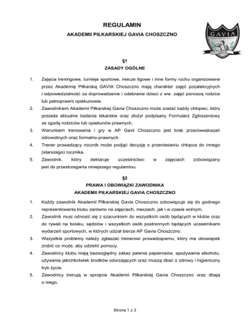 REGULAMIN AKADEMII PIŁKARSKIEJ GAVIA CHOSZCZNO §1 ZASADY OGÓLNE 1. Zajęcia treningowe, turnieje sportowe, mecze ligowe i inne formy ruchu organizowane przez Akademię Piłkarską GAVIA Choszczno mają charakter zajęć pozalekcyjnych i odpowiedzialność za doprowadzenie i odebranie dzieci z ww. zajęć ponoszą rodzice 2. 3. 4. 5. lub pełnoprawni opiekunowie. Zawodnikiem Akademii Piłkarskiej Gavia Choszczno może zostać każdy chłopiec, który posiada aktualne badania lekarskie oraz złożył podpisany Formularz Zgłoszeniowy ze zgodą rodziców lub opiekunów prawnych. Warunkiem trenowania i gry w AP Gavii Choszczno jest brak przeciwwskazań zdrowotnych oraz formalno-prawnych. Trener prowadzący rocznik może podjąć decyzję o przeniesieniu chłopca do innego (starszego) rocznika. Zawodnik, który deklaruje uczestnictwo jest do przestrzegania niniejszego regulaminu. w zajęciach zobowiązany §2 PRAWA I OBOWIĄZKI ZAWODNIKA 1. 2. 3. 4. 5. AKADEMII PIŁKARSKIEJ GAVIA CHOSZCZNO Każdy zawodnik Akademii Piłkarskiej Gavia Choszczno zobowiązuje się do godnego reprezentowania klubu zarówno na zajęciach, meczach, jak i w czasie wolnym. Zawodnik musi odnosić się z szacunkiem do wszystkich osób będących w klubie oraz do rywali na boisku, sędziów i wszystkich osób postronnych będących uczestnikami wydarzeń sportowych, w których udział bierze AP Gavia Choszczno. Wszystkie problemy należy zgłaszać trenerowi prowadzącemu, który ma obowiązek zrobić co może, aby udzielić pomocy. Zawodnicy klubu mają bezwzględny zakaz palenia papierosów, spożywania alkoholu, używania jakichkolwiek środków odurzających oraz muszą dbać o zdrowy i higieniczny tryb życia. Zawodnicy trenują w sprzęcie Akademii Piłkarskiej Gavia Choszczno oraz dbają o niego. Strona 1 z 3 6. 7. 8. 9. Zawodnik dba o punktualność na treningi i mecze. Trener prowadzący nie będzie zwlekał z wyjazdem na mecz lub turniej i czekał na spóźnialskich. Zawodnik podczas treningów, meczów i turniejów wykonuje wszystkie polecenie trenera prowadzącego. Zawodnik po treningu nie zostawia żadnych śmieci po sobie (puste butelki, reklamówki, itp.). Wszelkie dolegliwości zdrowotne podczas treningu zawodnik musi bezzwłocznie zgłaszać trenerowi. §3 PRAWA I OBOWIĄZKI RODZICÓW / OPIEKUNÓW PRAWNYCH 1. Rodzice / opiekunowie zobowiązują się do terminowego opłacania składek członkowskich w wysokości 70 zł (drugie i kolejne dziecko 50 zł), do końca każdego miesiąca. Akademia Piłkarska Gavia Choszczno nie zwraca pieniędzy za nieobecność syna na treningach. Składkę należy wpłacać TYLKO na konto bankowe klubu: GBS Choszczno nr 25 8359 0005 0034 1536 2004 001. W tytule przelewu za składkę członkowską miesięczną należy wpisać: "Imię i Nazwisko zawodnika, rocznik, oraz miesiąc, za który dokonywana jest wpłata" (np.: Jan Kowalski, 2009, 09/2016). Składa członkowska nie jest odpłatnością za zajęcia treningowe, a jest dopełnieniem całości budżetu Akademii, który przeznaczony jest na opłaty związane z prowadzeniem zajęć sportowych (tj: wynajęcie hal sportowych w okresie zimowym, opłaty za usługi transportowe, 2. 3. itp.) i aktualizowana jest Składka członkowska obowiązuje we wszystkie miesiące w roku. raz w roku. Zapisanie dziecka do klubu wiąże się z akceptacją regulaminu i stosowaniem się do jego ustaleń. W uzasadnionych przypadkach na podstawie wniosku rodzica / opiekuna istnieje możliwość przesunięcia terminu wpłacenia składki po wcześniejszym uzgodnieniu z Zarządem Akademii. Ze składki członkowskiej są zwolnieni zawodnicy, którzy wystąpią w oficjalnym (ligowym lub pucharowym) meczu I drużyny Gavii Choszczno lub 4. ukończą 16 rok życia. W uzasadnionych przypadkach, na wniosek Rodzica / Opiekuna, Zarząd Akademii może obniżyć wysokość składki do 50 zł. Każdy rodzic / opiekun ma obowiązek zapoznać się z regulaminem Akademii Piłkarskiej Gavia Choszczno dostępnym na stronie www.gaviachoszczno.pl oraz przekazać trenerowi prowadzącemu podpisany formularz zgłoszeniowy (do pobrania 5. na stronie Akademii) w dniu zapisania do klubu. Do szatni (z wyjątkiem rodziców / opiekunów najmłodszej grupy) oraz na boisko mogą wchodzić TYLKO zawodnicy, trener oraz kierownik. Strona 2 z 3 6. Podczas zajęć treningowych oraz spotkań rodzice / opiekunowie odnoszą się z szacunkiem do: trenera prowadzącego (nie podważają jego autorytetu), innych zawodników, rywali i sędziów. Oraz dbają o jak najlepszą atmosferę podczas 7. 8. 9. kibicowania. W czasie trwania zawodów rodzice / opiekunowie i inne osoby niezwiązane z klubem przebywają na trybunach obiektu, na którym rozgrywane są mecze. Rodzice / opiekunowie podczas zajęć nie powinni kontaktować się z synem. Ma to negatywny wpływ na jego koncentrację. Obowiązkiem jest powiadomienie trenera o nieobecności syna na treningu lub zawodach, a Zarząd Akademii pisemnie o rezygnacji lub zawieszeniu treningów. §4 POSTANOWIENIA KOŃCOWE 1. 2. 3. 4. Akademia Piłkarska zastrzega sobie prawo do wprowadzenia zmian w regulaminie. Nieprzestrzeganie lub rażące naruszenie któregokolwiek z punktów regulaminu może być podstawą do wydalenia z Akademii Piłkarskiej Gavia. Wszystkie pozostałe sprawy, których nie określa niniejszy regulamin ma prawo i obowiązek rozstrzygać trener prowadzący zajęcia lub Zarząd Akademii Piłkarskiej Gavia Choszczno. Regulamin wchodzi w życie z dniem 1 sierpnia 2016 roku. podpis opiekunów prawnych podpis zawodnika Strona 3 z 3