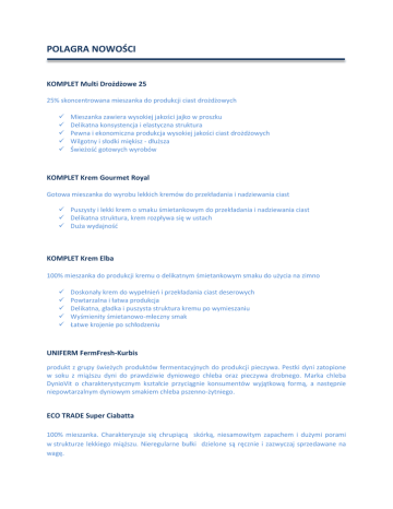 POLAGRA NOWOŚCI KOMPLET Multi Drożdżowe 25 25% skoncentrowana mieszanka do produkcji ciast drożdżowych Mieszanka zawiera wysokiej jakości jajko w proszku Delikatna konsystencja i elastyczna struktura Pewna i ekonomiczna produkcja wysokiej jakości ciast drożdżowych Wilgotny i słodki miękisz - dłuższa Świeżość gotowych wyrobów KOMPLET Krem Gourmet Royal Gotowa mieszanka do wyrobu lekkich kremów do przekładania i nadziewania ciast Puszysty i lekki krem o smaku śmietankowym do przekładania i nadziewania ciast Delikatna struktura, krem rozpływa się w ustach Duża wydajność KOMPLET Krem Elba 100% mieszanka do produkcji kremu o delikatnym śmietankowym smaku do użycia na zimno Doskonały krem do wypełnień i przekładania ciast deserowych Powtarzalna i łatwa produkcja Delikatna, gładka i puszysta struktura kremu po wymieszaniu Wyśmienity śmietanowo-mleczny smak Łatwe krojenie po schłodzeniu UNIFERM FermFresh-Kurbis produkt z grupy świeżych produktów fermentacyjnych do produkcji pieczywa. Pestki dyni zatopione w soku z miąższu dyni do prawdziwie dyniowego chleba oraz pieczywa drobnego. Marka chleba DynioVit o charakterystycznym kształcie przyciągnie konsumentów wyjątkową formą, a następnie niepowtarzalnym dyniowym smakiem chleba pszenno-żytniego. ECO TRADE Super Ciabatta 100% mieszanka. Charakteryzuje się chrupiącą skórką, niesamowitym zapachem i dużymi porami w strukturze lekkiego miąższu. Nieregularne bułki dzielone są ręcznie i zazwyczaj sprzedawane na wagę. ECO TRADE Chleb Bosman 50% mieszanka zawiera mąkę jęczmienną i płatki jęczmienne. Dodatek płatków ziemniaczanych wydłuża świeżość, a czarnuszka ma wpływ na aromatyczny zapach. Pieczywo w swoim składzie zawiera również słody jęczmienne, słonecznik i szczyptę kminku. ECO TRADE Chleb Dynowski Wyjątkowo bogata 83% mieszanka zawierająca 50% ziaren i tartą marchewkę. Nie zawiera polepszaczy. Wypieczone pieczywo jest źródłem błonnika pokarmowego oraz zawiera dużą dawkę wapnia. Do mieszanki użyto naturalnych komponentów. ECO TRADE Chleb Wójta z pomidorami 50% mieszanka z dodatkiem suszonych pomidorów i bazylii ma niesamowity aromat i smak. Dodatek płatków ziemniaczanych przedłuża utrzymanie świeżości. Ma charakterystyczny, równomierny miękisz. Zawiera naturalny kwas żytni. ECO TRADE Biszkopt kakaowy 100% koncentrat ciasta do produkcji kakaowych blatów biszkoptowych pod torty i ciasta. Ciasto łatwo się wyrabia i wyrasta równomiernie. Jest pachnące i puszyste. ECO TRADE Mak Cake 100% koncentrat ciasta makowego. Dodatek dużej ilości niebieskiego maku (33%) nadaje mu oryginalny wygląd i bogaty smak. Jest wilgotne, smakowite i atrakcyjnie wygląda, więc może być stosowane bez żadnych dodatków. Wspaniale smakuje z owocami, bitą śmietaną oraz kremami. ECO TRADE Roll-Scones 100% mieszanka do produkcji szerokiego asortymentu rolad, strucli, wianków i warkoczy. Dzięki odpowiedniej konsystencji ciasta i składników wysokiej jakości produkcja jest prosta i w pełni powtarzalna. Wypieczone produkty są aromatyczne i wspaniale wyglądają. ECO TRADE Arktik Krem śmietanowy swój smak zawdzięcza mleku, serwatce i maślance - nie zawiera aromatów. Błyskawicznie uzyskuje dużą objętość i jest bardzo stabilny. Wspaniale smakuje i można go łączyć ze stabilizatorami do śmietany, kremami budyniowymi owocami i alkoholem. Jest odporny na zamrażanie. ECO TRADE Super Elita bez cukru Krem do ubijania na bazie tłuszczu roślinnego (29%) - alternatywa dla śmietan pochodzenia zwierzęcego. Płynna postać ułatwia i tym samym skraca proces produkcji. Doskonale miesza się ze stabilizatorami do śmietany. Cechuje go duży przyrost objętości. Wyroby są estetyczne, mają wysoką jakość i trwałość. ECO TRADE Stabilizatory do śmietany BRZOSKWINIA-MARAKUJA doz. 200g/1l śmietany/250g wody NEUTRALNY BEZ CUKRU doz. 200g/1l śmietany/250g wody TRUSKAWKOWY STANDARD doz. 200g/1l śmietany/250g wody Kremy śmietanowe powstałe przy użyciu stabilizatorów są smaczne, bardziej wydajne i można je poddawać procesowi mrożenia. ECO TRADE ciasteczka żytnie razowe ze słonecznikiem, ciasteczka żytnie razowe z orzechem Pyszne i chrupiące ciasteczka żytnie razowe w dwóch wariantach smakowych - ze słonecznikiem i z orzechem. Mieszanki dostosowane do maszyn przemysłowych, urządzeń typu Multidrop, maszyn wałkowych, ciągów technologicznych. ECO TRADE posypka ze słonecznikiem, posypka z dynią Wspaniałe posypki do ciasteczek na linię przemysłową i nie tylko – duże ziarna, przemyślana kompozycja. ECO TRADE linia dodatków do wypieku odroczonego Proponujemy szeroki asortyment produktów do odroczonego wypieku. Gotowe kęsy można wypiekać w czasie dogodnym dla piekarni w zależności od potrzeb. Opóźniony rozrost pozwala na uzyskanie pieczywa o wyjątkowo wysokiej jakości, co skutkuje uzyskaniem delikatnego miękiszu i dłuższej świeżości pieczywa. BUŁKA ŚNIADANIOWA – 3% dodatek wypiekowy KAJZERKA – 2% dodatek wypiekowy BAZA DO CHLEBA MIESZANEGO – 10% mieszanka BUŁKA GRAHAMKA – 40% mieszanka BUŁKA DYNIOWA – 30% mieszanka BUŁKA JĘCZMIENNA – 35% mieszanka BUŁKA KAROCA – 50% mieszanka BUŁKA KUKURYDZIANA – 40% mieszanka BUŁKA SŁONECZNIKOWA – 30% mieszanka PIZZA ZIOŁOWA – 50% mieszanka ZAPIEKANKA – 10% mieszanka W celu uzyskania dalszych informacji na temat wymienionych produktów, prosimy o kontakt z naszymi przedstawicielami.