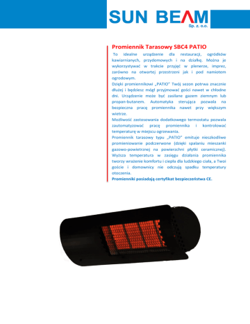 Promiennik Tarasowy SBC4 PATIO To idealne urządzenie dla restauracji, ogródków kawiarnianych, przydomowych i na działkę. Można je wykorzystywać w trakcie przyjęć w plenerze, imprez, zarówno na otwartej przestrzeni jak i pod namiotem ogrodowym. Dzięki promiennikowi „PATIO” Twój sezon potrwa znacznie dłużej i będziesz mógł przyjmować gości nawet w chłodne dni. Urządzenie może być zasilane gazem ziemnym lub propan-butanem. Automatyka sterująca pozwala na bezpieczna pracę promiennika nawet przy większym wietrze. Możliwość zastosowania dodatkowego termostatu pozwala zautomatyzować pracę promiennika i kontrolować temperaturę w miejscu ogrzewania. Promiennik tarasowy typu „PATIO” emituje nieszkodliwe promieniowanie podczerwone (dzięki spalaniu mieszanki gazowo-powietrznej na powierzchni płytki ceramicznej). Wyższa temperatura w zasięgu działania promiennika tworzy wrażenie komfortu i ciepła dla ludzkiego ciała, a Twoi goście i domownicy nie odczują spadku temperatury otoczenia. Promienniki posiadają certyfikat bezpieczeństwa CE. Zalety promiennika tarasowego SBC4 PATIO: Oszczędność energii 30-60% Wysoki poziom bezpieczeństwa Brak ruchów powietrza, pyłów i kurzu w ogrzewanym pomieszczeniu Ciepło skoncentrowane na poziomie podłogi, w strefie przebywania ludzi Szybki czas rozruchu i natychmiastowy efekt cieplny Automatyczna regulacja Możliwość ogrzewania i sterowania strefowego Niskie nakłady inwestycyjne Prosta obsługa Łatwa i szybka instalacja A [mm] 400 B [mm] 230 C [mm] 250 D [mm] 160 Liczba płytek: 4 Dane techniczne Wymiary SBC 4 Pow. Ogrzewana: 15 – 20 m2 Moc: 5,7 kW Zużycie gazu: 0,72 m3/h 0,5 kg/h Zasilanie elektryczne: 230V-50Hz-25VA