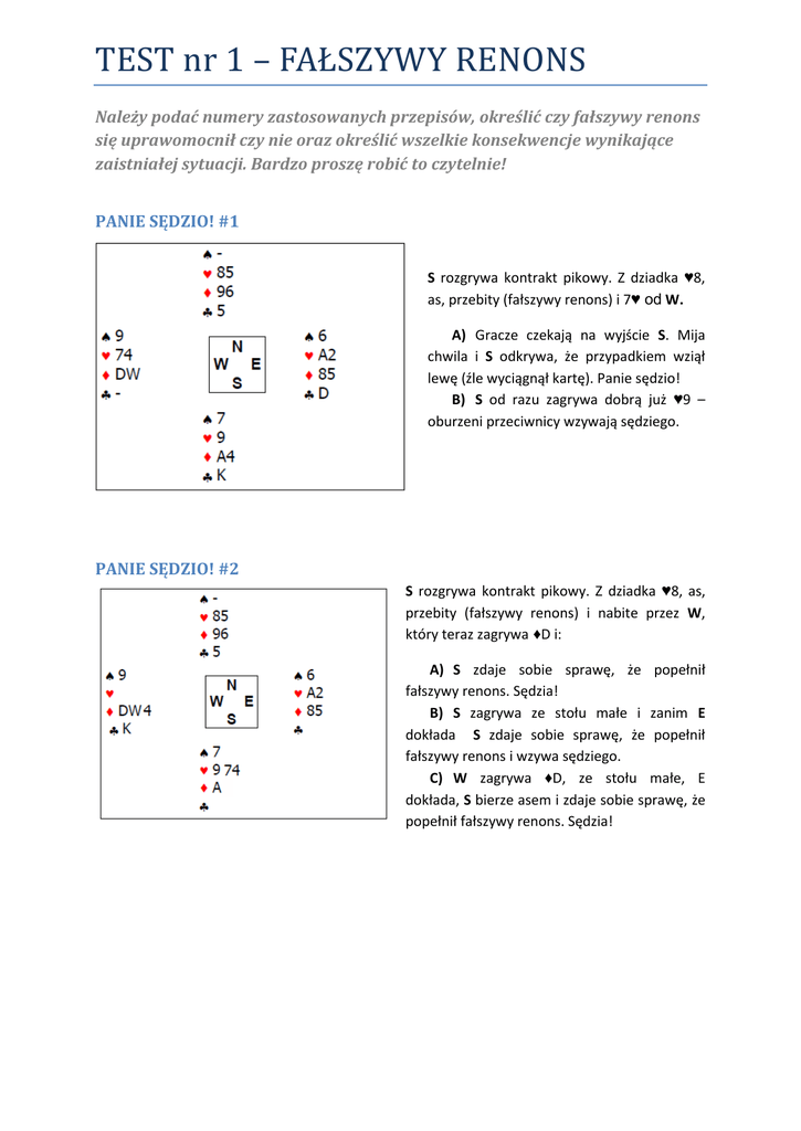 TEST nr 1 – FAŁSZYWY RENONS Należy podać numery zastosowanych przepisów, określić czy fałszywy renons się uprawomocnił czy nie oraz określić wszelkie konsekwencje wynikające zaistniałej sytuacji. Bardzo proszę robić to czytelnie! PANIE SĘDZIO! #1 S rozgrywa kontrakt pikowy. Z dziadka ♥8, as, przebity (fałszywy renons) i 7♥ od W. A) Gracze czekają na wyjście S. Mija chwila i S odkrywa, że przypadkiem wziął lewę (źle wyciągnął kartę). Panie sędzio! B) S od razu zagrywa dobrą już ♥9 – oburzeni przeciwnicy wzywają sędziego. PANIE SĘDZIO! #2 S rozgrywa kontrakt pikowy. Z dziadka ♥8, as, przebity (fałszywy renons) i nabite przez W, który teraz zagrywa ♦D i: A) S zdaje sobie sprawę, że popełnił fałszywy renons. Sędzia! B) S zagrywa ze stołu małe i zanim E dokłada S zdaje sobie sprawę, że popełnił fałszywy renons i wzywa sędziego. C) W zagrywa ♦D, ze stołu małe, E dokłada, S bierze asem i zdaje sobie sprawę, że popełnił fałszywy renons. Sędzia!