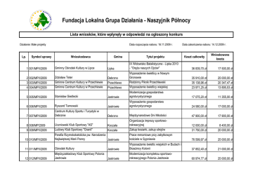 Fundacja Lokalna Grupa Działania - Naszyjnik Północy Lista wniosków, które wpłynęły w odpowiedzi na ogłoszony konkurs Działanie: Małe projekty Lp. Symbol sprawy Data rozpoczęcia naboru: 16.11.2009 r. Wnioskodawca 1 001/MP/I/2009 Gminny Ośrodek Kultury w Lipce 2 002/MP/I/2009 3 003/MP/I/2009 4 004/MP/I/2009 Zdzisław Teter Gminne Centrum Kultury w Przechlewie Gminne Centrum Kultury w Przechlewie 5 005/MP/I/2009 Stanisław Siedlecki Gmina Tytuł projektu Data zakończenia naboru: 14.12.2009 r. Koszt całkowity Wnioskowana kwota Lipka IX Widowisko Batalistyczne - Lipka 2010 - "Oręża naszych Ojców" 36 839,70 zł 17 500,00 zł Debrzno Przechlewo Przechlewo Wyposażenie świetlicy w Nowym Gronowie Rodzinny Piknik Przechlewski Wyposażenie świetlicy wiejskiej 35 910,00 zł 35 138,96 zł 23 971,25 zł 25 000,00 zł 20 347,47 zł 13 895,53 zł Jastrowie Modernizacja gospodarstwa agroturystycznego 17 075,20 zł 11 355,00 zł 24 580,00 zł 17 000,00 zł 6 006/MP/I/2009 Ryszard Tarnowski Jastrowie Wyposażenie gospodarstwa agroturystycznego 7 007/MP/I/2009 Centrum Kultury Sportu i Turystyki w Debrznie Debrzno Międzynarodowe Dni Młodości 47 900,00 zł 17 900,00 zł Koczała Koczała Organizacja imprezy sportoworekreacyjnej Zakup kosiarki, zakup strojów 12 000,00 zł 31 750,00 zł 8 400,00 zł 20 000,00 zł Parafia Rzymskokatolicka pw. Narodzenia Najświętszej Marii Panny Jastrowie Prace remontowe przy zabytkowym kościele w Sypniewie 76 599,97 zł 25 000,00 zł 11 011/MP/I/2009 Ośrodek Kultury Jastrowie Wyposażenie świetlic wiejskich w Budach i Brzeźnicy Kolonii 37 852,40 zł 21 000,00 zł 12 012/MP/I/2009 Międzyzakładowy Klub Sportowy Polonia Jastrowie Jastrowie Modernizacja kompleksu sportoworekreacyjnego Polonia Jastrowie 60 974,77 zł 25 000,00 zł 8 008/MP/2009 9 009/MP/I/2009 10 010/MP/I/2009 Uczniowski Klub Sportowy "AS" Ludowy Klub Sportowy "Granit" Fundacja Lokalna Grupa Działania - Naszyjnik Północy Lista wniosków, które wpłynęły w odpowiedzi na ogłoszony konkurs Działanie: Małe projekty Lp. Symbol sprawy 13 013/MP/I/2009 Data rozpoczęcia naboru: 16.11.2009 r. Wnioskodawca Ceramika Stare Gronowo Anna Mikulska 14 014/MP/I/2009 Ochotnicza Straż Pożarna w Łąkie 15 015/MP/I/2009 16 016/MP/I/2009 Ochotnicza Straż Pożarna w Lipce Ochotnicza Straż Pożarna w Lotyniu 17 017/MP/I/2009 Międzyzakładowy Klub Sportowy "Włókniarz" w Okonku 18 018/MP/I/2009 Centrum Kultury Sportu i Turystyki w Debrznie 19 019/MP/I/.2009 Kornelia Meyer Gmina Tytuł projektu Data zakończenia naboru: 14.12.2009 r. Koszt całkowity Wnioskowana kwota Debrzno Ceramika na szlaku rowerowym GreenwayNaszyjnik Północy 28 458,72 zł 18 004,46 zł Lipka Rozwijanie aktywności społeczności lokalnej poprzez promocję lokalnej twórczości kulturalnej z wykorzystaniem lokalnego dziedzictwa - Harcerskiego Zespołu Mandolinowego FRYGI - 51 Drużyna Harcerska im. Podp. Emilii Gierczek Hufiec Złotów Chorągiew Wielkopolska poprzez koncertowanie na obszarze Lokalnej Grupy Działania Naszyjnik Północy 13 332,29 zł 7 002,03 zł Lipka Okonek Remont i wyposażenie świetlicy w remizie OSP Lipka Młodzi strażacy naszą przyszłością 40 548,87 zł 19 398,89 zł 20 000,00 zł 13 579,22 zł Okonek Piłka pokaże, co idzie w parze?... Czyli sport i dobra zabawa! 24 454,52 zł 17 000,00 zł Debrzno W mieście i gminie Debrzno żyć zdrowo, to żyć na sportowo! 22 470,00 zł 15 700,00 zł Człuchów Odbudowa małej infrastruktury turystycznej i miejsc wypoczynkowych w miejscowości Czarnoszyce 32 711,00 zł 22 897,00 zł Fundacja Lokalna Grupa Działania - Naszyjnik Północy Lista wniosków, które wpłynęły w odpowiedzi na ogłoszony konkurs Działanie: Małe projekty Lp. Symbol sprawy Data rozpoczęcia naboru: 16.11.2009 r. Wnioskodawca Gmina Tytuł projektu Data zakończenia naboru: 14.12.2009 r. Koszt całkowity Wnioskowana kwota 20 020/MP/I/2009 Miejsko-Gminny Ośrodek Kultury Kamień Krajeński 21 021/MP/I/2009 Miejsko-Gminna Biblioteka Publiczna Kamień Krajeński Multimedialna czytelnia w Kamieniu Krajeńskim 16 850,00 zł 11 795,00 zł 22 022/MP/I/2009 Małgorzata Sikora Debrzno Dbając o swoją kondycję poznasz piękno życia 35 714,14 zł 25 000,00 zł 23 023/MP/I/2009 Gmina Kamień Krajeński Kamień Krajeński Gminny turniej sołectw razem, zdrowo na sportowo 15 073,10 zł 8 963,50 zł 24 024/MP/I/2009 Gmina Rzeczenica Rzeczenica Remont i wyposażenie zaplecza świetlicy wiejskiej w Gwieździnie 50 000,00 zł 17 999,00 zł Rzeczenica Rzeczenica Organizacja imprez kulturoworozrywkowych z okazji obchodów "Dni Rzeczenicy 2010" Integracja przez działanie 39 400,00 zł 12 700,00 zł 17 999,00 zł 8 890,00 zł Koczała Otwieramy marzeń bramy i w wielu językach śpiewamy, czyli konkurs piosenki europejskiej: "Wieża Babel" 26 881,39 zł 15 800,00 zł Koczała Na ludowo, z tradycjami lato w Koczale witamy 24 204,39 zł 15 100,00 zł 25 025/MP/I/2009 26 026/MP/I/2009 27 027/MP/I/2009 28 028/MP/I/2009 Gminne Centrum Kultury, Sportu, Turystyki i Rekreacji w Rzeczenicy Sylwia Burczyk Gminny Ośrodek Kultury w Koczale Gminny Ośrodek Kultury w Koczale Noc Świętojańska na Krajnie 23 900,00 zł 16 730,00 zł Fundacja Lokalna Grupa Działania - Naszyjnik Północy Lista wniosków, które wpłynęły w odpowiedzi na ogłoszony konkurs Działanie: Małe projekty Lp. Symbol sprawy 29 029/MP/I/2009 30 030/MP/I/2009 31 031/MP/I/2009 32 032/MP/I/2009 33 033/MP/I/2009 34 034/MP/I/2009 Data rozpoczęcia naboru: 16.11.2009 r. Wnioskodawca Gmina Tytuł projektu Data zakończenia naboru: 14.12.2009 r. Koszt całkowity Wnioskowana kwota Zakup nowych kajaków, kamizelek/ kapoków/ asekuracyjnych i akcesoriów do wypożyczalni "Mała Przystań" w Starej Brdzie Pilskiej 33 022,00 zł 17 800,00 zł Stowarzyszenie Przyjaciół Gminy Koczała Koczała Marsz po zdrowie! - organizacja warsztatów i rajdu pieszo-rowerowego podnoszących świadomość zdrowotną mieszkańców gminy Koczała 13 547,60 z