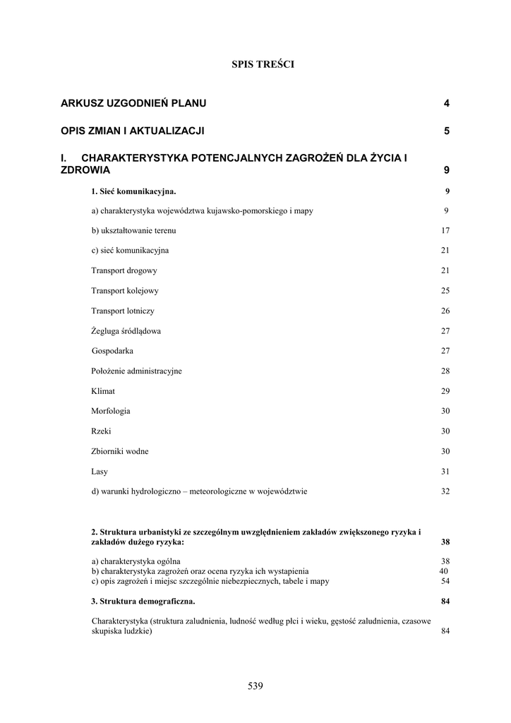 SPIS TREŚCI ARKUSZ UZGODNIEŃ PLANU 4 OPIS ZMIAN I AKTUALIZACJI 5 I. CHARAKTERYSTYKA POTENCJALNYCH ZAGROŻEŃ DLA ŻYCIA I ZDROWIA 9 1. Sieć komunikacyjna. 9 a) charakterystyka województwa kujawsko-pomorskiego i mapy 9 b) ukształtowanie terenu 17 c) sieć komunikacyjna 21 Transport drogowy 21 Transport kolejowy 25 Transport lotniczy 26 Żegluga śródlądowa 27 Gospodarka 27 Położenie administracyjne 28 Klimat 29 Morfologia 30 Rzeki 30 Zbiorniki wodne 30 Lasy 31 d) warunki hydrologiczno – meteorologiczne w województwie 32 2. Struktura urbanistyki ze szczególnym uwzględnieniem zakładów zwiększonego ryzyka i zakładów dużego ryzyka: 38 a) charakterystyka ogólna b) charakterystyka zagrożeń oraz ocena ryzyka ich wystapienia c) opis zagrożeń i miejsc szczególnie niebezpiecznych, tabele i mapy 38 40 54 3. Struktura demograficzna. 84 Charakterystyka (struktura zaludnienia, ludność według płci i wieku, gęstość zaludnienia, czasowe skupiska ludzkie) 84 539 4. Liczba wyjazdów zespołów ratownictwa medycznego na obszarze województwa 88 5. Liczba wylotów zespołów ratownictwa medycznego na obszarze województwa 116 a) krótka charakterystyka 116 czas dyżurów lotniczy transport sanitarny jak zlecić lotniczy transport sanitarny? zlecenie na lotniczy transport sanitarny - druk koszty lotniczego transportu sanitarnego zabezpieczenie medyczne pacjenta na transport transport neonatologiczny charakterystyka zespołu - lotniczy transport sanitarny ograniczenia lotniczego transportu sanitarnego dyskwalifikacja zleceń i odwoływanie się strefy niebezpieczne przy śmigłowcu 120 122 125 126 126 127 128 128 129 129 129 6. Hospitalizacja osób w stanach nagłego zagrożenia zdrowotnego 133 a) krótka charakterystyka – hospitalizacja b) krótka charakterystyka – izby przyjęć 133 136 7. Inne zagrożenia 142 a) charakterystyka potencjalnych zagrożeń dla życia lub zdrowia mogących wystąpić na obszarze województwa kujawsko – pomorskiego – choroby zakaźne 142 b) sytuacja epidemiologiczna chorób zakaźnych i zakażeń w województwie kujawskopomorskim w 2014 r. 145 c) analiza i ocena ryzyka wystąpienia zakażeń i chorób zakaźnych u ludzi z uwzględnieniem chorób szczególnie niebezpiecznych i wysoce zakaźnych 150 II. INFORMACJE O LICZBIE I ROZMIESZCZENIU NA OBSZARZE WOJEWÓDZTWA JEDNOSTEK SYSTEMU ORAZ CENTRÓW URAZOWYCH, JEDNOSTEK ORGANIZACYJNYCH SZPITALI WYSPECJALIZOWANYCH W ZAKRESIE UDZIELANIA ŚWIADCZEŃ ZDROWOTNYCH NIEZBĘDNYCH DLA RATOWNICTWA MEDYCZNEGO (STAN NA DZIEŃ – 01.03.2016 R) 156 1. Zespoły ratownictwa medycznego - liczba, rodzaje, rejony operacyjne, obszary działania, dysponenci. 157 2. Szpitalne oddziały ratunkowe (SOR) – liczba, rozmieszczenie, struktura organizacyjna 199 3. Centrum Urazowe – rozmieszczenie, struktura organizacyjna 206 4. Jednostki organizacyjne szpitali wyspecjalizowanych w zakresie udzielania świadczeń zdrowotnych niezbędnych dla ratownictwa medycznego – liczba, rozmieszczenie, ze wskazaniem liczby łóżek 210 5. Liczba i rozmieszczenie szpitali w poszczególnych powiatach, wraz z profilem oddziałów oraz liczbą łóżek stałych i gotowych do rozwinięcia. 223 6. Organizacja systemu powiadamiania o stanach nagłego zagrożenia zdrowotnego, w szczególności. 235 7. Współpraca wojewody i dysponentów jednostek systemu, o których mowa w art. 32 ust. 1 ustawy , z organami administracji publicznej oraz jednostkami systemu z innych województw 447 540 Jednostki systemu ws\zdłuż granic województwa kujawsko-pomorskiego 450 8. Współpraca z organami administracji publicznej oraz jednostkami współpracującymi z systemem, o których mowa w art. 15 ustawy z dnia 8 września 2006 r. o Państwowym Ratownictwie Medycznym z organami administracjipublicznej i jednostkami systemu innych województw 455 8.a Procedury współpracy 455 8.b Organizacja wspólnych ćwiczeń oraz analiza działań ratowniczych, dysponowania i koordynowania działań ratowniczych w przypadku zdarzeń powodujących stan nagłego zagrożenia zdrowotnego znacznej liczby osób 457 8.c Kompetencje i tryb podejmowania działań oraz procedury współpracy 459 8.d Obieg i wymiana informacji 462 8.e liczba i rozmieszczenie jednostek systemu wzdłuż wojewódzkich granic administracyjnych ze wskazaniem danych kontaktowych stanowisk dyspozytorów medycznych i lekarzy koordynatorów ratownictwa medycznego 463 9. Jednostki współpracujące z systemem, o którym mowa w art. 15 ustawy z dnia 8 września 2006 r. o Państwowym Ratownictwie Medycznym – wskazanie właściwego rejestru wojewody 475 10. informacje na temat zatwierdzonych przez Wojewodę kursów w zakresie kwalifikowanej pierwszej pomocy, w szczególności wskazanie danych identyfikujących podmiot prowadzący kurs kwalifikowanej pierwszej pomocy. 511 11. Informacja na temat personelu pracującego w jednostkach systemu, bez względu na formę zatrudnienia 515 III KALKULACJA KOSZTÓW DZIAŁALNOŚCI ZESPOŁÓW RATOWNICTWA MEDYCZNEGO 520 IV PLANOWANE NA LATA 2011 – 2015 NOWE JEDNOSTKI SYSTEMU PAŃSTWOWE RATOWNICTWO MEDYCZNE 541 526 WYKAZ TABEL Tabela 1. Dane dotyczące powiatów według stanu z 1 stycznia 2015 r. ................................. 14 Tabela 2 Wykaz dróg wojewódzkich ....................................................................................... 23 Tabela 3. Klasyfikacja stopni zagrożeń groźnych zjawisk meteorologicznych ....................... 35 Tabela 4 Charakterystyka zagrożeń i ocena ryzyka ich zagrożeń ............................................ 40 Tabela 5 Stan ewidencyjny urządzeń melioracji wodnych podstawowych w województwie . 42 Tabela 6. Grupa zakładów z dużym ryzykiem powstania awarii przemysłowej ..................... 50 Tabela 7. Grupa zakładów zwiększonego ryzyka powstania awarii przemysłowej ................ 52 Tabela 8. Miejsca produkcji, przechowywania lub przetwarzania materiałów niebezpiecznych, które powodują duże ry