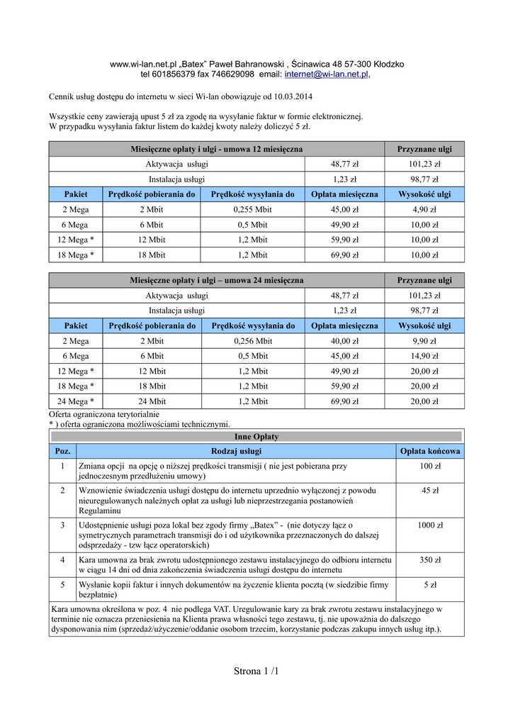 www.wi-lan.net.pl „Batex” Paweł Bahranowski , Ścinawica 48 57-300 Kłodzko tel 601856379 fax 746629098 email: [email protected], Cennik usług dostępu do internetu w sieci Wi-lan obowiązuje od 10.03.2014 Wszystkie ceny zawierają upust 5 zł za zgodę na wysyłanie faktur w formie elektronicznej. W przypadku wysyłania faktur listem do każdej kwoty należy doliczyć 5 zł. Miesięczne opłaty i ulgi - umowa 12 miesięczna Przyznane ulgi Aktywacja usługi 48,77 zł 101,23 zł Instalacja usługi 1,23 zł 98,77 zł Pakiet Prędkość pobierania do Prędkość wysyłania do Opłata miesięczna Wysokość ulgi 2 Mega 2 Mbit 0,255 Mbit 45,00 zł 4,90 zł 6 Mega 6 Mbit 0,5 Mbit 49,90 zł 10,00 zł 12 Mega * 12 Mbit 1,2 Mbit 59,90 zł 10,00 zł 18 Mega * 18 Mbit 1,2 Mbit 69,90 zł 10,00 zł Miesięczne opłaty i ulgi – umowa 24 miesięczna Przyznane ulgi Aktywacja usługi 48,77 zł 101,23 zł Instalacja usługi 1,23 zł 98,77 zł Pakiet Prędkość pobierania do Prędkość wysyłania do Opłata miesięczna Wysokość ulgi 2 Mega 2 Mbit 0,256 Mbit 40,00 zł 9,90 zł 6 Mega 6 Mbit 0,5 Mbit 45,00 zł 14,90 zł 12 Mega * 12 Mbit 1,2 Mbit 49,90 zł 20,00 zł 18 Mega * 18 Mbit 1,2 Mbit 59,90 zł 20,00 zł 69,90 zł 20,00 zł 24 Mega * 24 Mbit 1,2 Mbit Oferta ograniczona terytorialnie * ) oferta ograniczona możliwościami technicznymi. Inne Opłaty Poz. Rodzaj usługi Opłata końcowa 1 Zmiana opcji na opcję o niższej prędkości transmisji ( nie jest pobierana przy jednoczesnym przedłużeniu umowy) 100 zł 2 Wznowienie świadczenia usługi dostępu do internetu uprzednio wyłączonej z powodu nieuregulowanych należnych opłat za usługi lub nieprzestrzegania postanowień Regulaminu 45 zł 3 Udostępnienie usługi poza lokal bez zgody firmy „Batex” - (nie dotyczy łącz o symetrycznych parametrach transmisji do i od użytkownika przeznaczonych do dalszej odsprzedaży - tzw łącz operatorskich) 1000 zł 4 Kara umowna za brak zwrotu udostępnionego zestawu instalacyjnego do odbioru internetu w ciągu 14 dni od dnia zakończenia świadczenia usługi dostępu do internetu 350 zł 5 Wysłanie kopii faktur i innych dokumentów na życzenie klienta pocztą (w siedzibie firmy bezpłatnie) 5 zł Kara umowna określona w poz. 4 nie podlega VAT. Uregulowanie kary za brak zwrotu zestawu instalacyjnego w terminie nie oznacza przeniesienia na Klienta prawa własności tego zestawu, tj. nie upoważnia do dalszego dysponowania nim (sprzedaż/użyczenie/oddanie osobom trzecim, korzystanie podczas zakupu innych usług itp.). Strona 1 /1