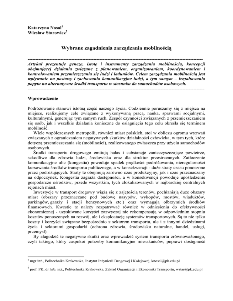 Katarzyna Nosal1 Wiesław Starowicz2 Wybrane zagadnienia zarządzania mobilnością ---------------------------------------------------------------------------------------------------------------Artykuł prezentuje genezę, istotę i instrumenty zarządzania mobilnością, koncepcji obejmującej działania związane z planowaniem, organizowaniem, koordynowaniem i kontrolowaniem przemieszczania się ludzi i ładunków. Celem zarządzania mobilnością jest wpływanie na postawy i zachowania komunikacyjne ludzi, a tym samym – kształtowania popytu na alternatywne środki transportu w stosunku do samochodów osobowych. ----------------------------------------------------------------------------------------------------------------Wprowadzenie Podróżowanie stanowi istotną część naszego życia. Codziennie poruszamy się z miejsca na miejsce, realizujemy cele związane z wykonywaną pracą, nauka, sprawami socjalnymi, kulturalnymi, generując tym samym ruch. Zespół czynności związanych z przemieszczaniem się osób, jak i wszelkie działania konieczne do osiągnięcia tego celu określa się terminem mobilność. Wiele współczesnych metropolii, również miast polskich, stoi w obliczu ogromu wyzwań związanych z ograniczaniem negatywnych skutków działalności człowieka, w tym tych, które dotyczą przemieszczania się (mobilności), realizowanego zwłaszcza przy użyciu samochodów osobowych. Środki transportu drogowego emitują hałas i substancje zanieczyszczające powietrze, szkodliwe dla zdrowia ludzi, środowiska oraz dla struktur przestrzennych. Zatłoczenie komunikacyjne ulic (kongestia) powoduje spadek prędkości podróżowania, nieregularności kursowania środków transportu publicznego, a w konsekwencji - duże straty czasu ponoszone przez podróżujących. Straty te obejmują zarówno czas produkcyjny, jak i czas przeznaczany na odpoczynek. Kongestia zagraża dostępności, a w konsekwencji powoduje upośledzenie gospodarcze ośrodków, przede wszystkim, tych zlokalizowanych w najbardziej centralnych rejonach miast. Inwestycje w transport drogowy wiążą się z zajętością terenów, pochłaniają duże obszary miast (obszary przeznaczane pod budowę nasypów, wykopów, mostów, wiaduktów, parkingów, garaży i stacji benzynowych etc.) oraz wymagają olbrzymich środków finansowych. Kwestie te należy rozpatrywać również w odniesieniu do efektywności ekonomicznej - uzyskiwane korzyści zazwyczaj nie rekompensują w odpowiednim stopniu kosztów ponoszonych na rozwój, ale i eksploatację systemów transportowych. Są to nie tylko koszty i korzyści związane bezpośrednio z sektorem transportu, ale i z innymi dziedzinami życia i sektorami gospodarki (ochrona zdrowia, środowisko naturalne, handel, usługi, przemysł). By złagodzić te negatywne skutki oraz wprowadzić system transportu zrównoważonego, czyli takiego, który zaspokoi potrzeby komunikacyjne mieszkańców, poprawi dostępność 1 mgr inż., Politechnika Krakowska, Instytut Inżynierii Drogowej i Kolejowej, [email protected] . 2 prof. PK, dr hab. inż., Politechnika Krakowska, Zakład Organizacji i Ekonomiki Transportu, [email protected] komunikacyjną obszarów, a jednocześnie spełni kryteria ochrony środowiska, efektywności ekonomicznej i równego dostępu dla społeczeństwa, miasta podejmują szereg działań. Jedną z koncepcji jest zachęcanie mieszkańców do korzystania z samochodów prywatnych w mniejszym stopniu niż do tej pory, promowanie transportu publicznego, podróży pieszych oraz rowerowe. Nie chodzi tu jednak o całkowite wyeliminowanie podróży wykonywanych samochodem osobowym, ale o bardziej racjonalne wykorzystywanie tego środka lokomocji, np. korzystanie z samochodu w przypadku braku możliwości wyboru innego środka transportu lub wspólne użytkowanie jednego samochodu przez kilka osób (podróżowanie w tzw. systemach carpooling3 czy carsharing4) [12]. Pozostawia się użytkownikom swobodę wyboru środka transportu, a jednocześnie wprowadza się ograniczenia w ruchu samochodów osobowych i zapewnia dogodne warunki dla transportu publicznego, komunikacji rowerowej i pieszej. Takie zabiegi sprawiają, że proekologiczne środki transportu stają się bardziej konkurencyjne w stosunku do pojazdów indywidualnych. Służy temu szereg różnorodnych instrumentów, środków i strategii, nowatorskiego w Polsce, lecz stosowanego na szeroką skalę za granicą, tzw. zarządzania mobilnością. Geneza zarządzania mobilnością W ostatnich latach to właśnie zarządzania mobilnością, związane z zachęcaniem do zmiany zachowań komunikacyjnych oraz promowaniem, alternatywnych w stosunku do samochodów, środków transportu, zyskało wielka wagę i popularność m.in. w Europie, USA i Kandzie. Zwłaszcza w obszarach metropolitarnych podejście to wydaje się być odpowiednie dla wzmacniania efektywności działań sterowania ruchem ulicznym. Do lat dziewięćdziesiątych ubiegłego stulecia, głównym podejściem dotyczącym zmniejszenia negatywnych skutków transportu, przede wszystkim kongestii komunikacyjnej, było tworzenie kolejnych, zakrojonych na szeroka skalę, inwestycji infrastrukturalnych [15]. Koncentracja na budowie i utrzymaniu dróg wynikała z przekonania, ze zapotrzebowaniu na transport musi odpowiadać konstrukcja niezbędnej infrastruktury. Pod koniec XX wieku, wciąż powstającym inwestycjom towarzyszył ustawiczny wzrost popytu, który w efekcie doprowadził do przeciążenia miejskich systemów transportowych [5]. Naukowcy i inżynierowie z zakresu planowania transportu doszli do wniosku, że wysokobudżetowe i zorientowane na podaż podejście nie przynosi pozytywnych rezultatów, a wręcz odwrotne do zamierzonych – popyt dotyczący podróży realizowanych samochodem, ciągle wzrastał. Jednocześnie sektor publiczny, z powodu pogłębiającego się deficytu budżetowego odczuwał potrzebę ograniczenia wydatków na infrastrukturę trans