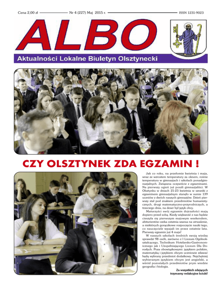 Cena 2,00 zł Nr 4 (227) Maj 2015 r. ISSN 1231-9023 CZY OLSZTYNEK ZDA EGZAMIN ! Jak co roku, na przełomie kwietnia i maja, wraz ze wzrostem temperatury za oknem, rośnie temperatura w gimnazjach i szkołach ponadgimnazjalnych. Związana oczywiście z egzaminami. Na pierwszy ogień już poszli gimnazjaliści. W Olsztynku w dniach 21-23 kwietnia w szranki z egzaminem gimnazjalnym stanęło w sumie 139 uczniów z dwóch naszych gimnazjów. Dzień pierwszy stał pod znakiem przedmiotów humanistycznych, drugi matematyczno-przyrodniczych, a trzeciego dnia, na deser był język obcy. Maturzyści swój egzamin dojrzałości mają dopiero przed sobą. Kiedy większość z nas będzie cieszyła się pierwszym majowym weekendem, abiturientów czeka ostatnia szansa na utrwalenie, a niektórych gorączkowe rozpoczęcie nauki tego, co nauczyciele wpajali im przez ostatnie lata. Pierwszy egzamin już 4 maja! W naszych szkołach średnich swoją wiedzę sprawdzi 98 osób, zarówno z I Liceum Ogólnokształcącego, Technikum Hotelarsko-Gastronomicznego jak i Uzupełniającego Liceum Dla Dorosłych. Poza obowiązkowymi: językiem polskim, matematyką i językiem obcym uczniowie zdawać będą wybrany przedmiot dodatkowy. Najchętniej wybieranym językiem obcym jest angielski, a wśród pozostałych przedmiotów prym wiedzie geografia i biologia. Za wszystkich zdających trzymamy redakcyjne kciuki! USŁUGI DŹWIGOWE I PODNOŚNIKOWE oferujemy: - dźwig 28T, - podnośnik koszowy - 18m Cieśla Robert tel. 791-363-525 Strona 2 ALBO 4 (227) Maj 2015 r. WIEŚCI Z MAGISTRATU BURMISTRZ OLSZTYNKA INFORMUJE Gmina Olsztynek realizuje projekt „Przyjazne e-urzędy na Warmii i Mazurach”, który ma na celu zwiększenie zaawansowania usług e-administracji w gminach objętych projektem poprzez zwiększenie ilości spraw załatwianych drogą elektroniczną oraz popularyzację tych rozwiązań wśród mieszkańców gminy. W ramach projektu został otworzony Punkt Potwierdzania Profilu Zaufanego Siedziba: Urząd Miejski w Olsztynku, pok. nr 2 (parter), 11-015 Olsztynek. Co to jest profil zaufany? Profil zaufany jest bezpłatną metodą potwierdzania tożsamości obywatela w systemach elektronicznej administracji – to odpowiednik bezpiecznego podpisu elektronicznego, weryfikowanego certyfikatem kwalifikowanym. Wykorzystując profil zaufany obywatel może załatwić sprawy administracyjne (np. wnoszenie podań, odwołań, skarg) drogą elektroniczną bez konieczności osobistego udania się do urzędu. W jaki sposób można założyć profil zaufany? Dzięki prostej procedurze założenia konta na platformie ePUAP oraz potwierdzenia profilu zaufanego będą mieli Państwo możliwość załatwiania części spraw urzędowych bez wychodzenia z domu. Do założenia profilu potrzebny jest tylko dowód osobisty. Załóż konto na www.epuap.gov.pl • złóż i wyślij wniosek o profil zaufany • udaj się z dowodem do punktu potwierdzającego w gminie • uzyskaj profil zaufany - nie ma potrzeby instalacji dodatkowego oprogramowania do obsługi podpisu elektronicznego, - jest bezpłatny, - pozwala na załatwienie wielu spraw administracyjnych, - umożliwia składanie oświadczeń woli. Co to jest ePUAP? Elektroniczna Platforma Usług Administracji Publicznej (www.epuap.gov.pl) to system informatyczny służący udostępnianiu obywatelom oraz instytucjom publicznym usług administracyjnych drogą elektroniczną. To alternatywa dla papierowej administracji. System ePUAP daje możliwość załatwienia wielu spraw urzędowych przez internet. Z ePUAPem można kontaktować się z dowolnego miejsca (dom, praca, podróż) i w dowolnym czasie (weekend, noc, wakacje) – sprawy urzędowe można załatwiać przebywając nawet poza granicami Polski. Co będziesz mógł załatwić przez ePUAP? - nadanie numeru adresowego nieruchomości - złożysz informację w sprawie podatków: rolnego, leśnego i od nieruchomości - deklarację na podatek : leśny, rolny od nieruchomości - deklarację na podatek od środków transportowych - zezwolenie na wycinkę drzew i krzewów - zaświadczenie o przeznaczeniu nieruchomości w miejscowym planie - deklarację o wysokości opłaty za gospodarowanie odpadami komunalnymi - i wiele innych spraw. Sprawdź sam! W ramach projektu zostanie także utworzony portal e-usług budżetowych, który będzie umożliwiał m.in.: - wgląd w stan rozliczeń podatnika (bieżąca aktualizacja danych), - rozliczanie wszelkich podatków i opłat na rzecz gminy Olsztynek, - dostęp do danych 24 h na dobę, siedem dni w tygodniu, - dokonywanie płatności przez Internet (e-płatności). BURMISTRZ OLSZTYNKA ZAPRASZA I ZACHĘCA DO ZAKŁADANIA I POTWIERDZANIA PROFILU ZAUFANEGO ORAZ DO AKTYWNEGO KORZYSTANIA Z USŁUG E-ADMINISTRACJI Gdzie wykorzystasz profil zaufany? Jakie są korzyści z korzystania z profilu zaufanego? - nie wymaga dodatkowego urządzenia ani karty kryptograficznej, jak w przypadku bezpiecznego podpisu elektronicznego, ALBO 4 (227) Maj 2015 r Partnerami projektu są: Miasto Ełk, Miasto Górowo Iławeckie, Gmina Morąg, Gmina Miłakowo, Gmina Łukta, Gmina Kętrzyn. Projekt „Przyjazne e-urzędy na Warmii i Mazurach” w ramach Priorytetu V, Działanie 5.2, Poddziałanie 5.2.1 Programu Operacyjnego Kapitał Ludzki współfinansowany ze środków Unii Europejskiej w ramach Europejskiego Funduszu Społecznego. Strona 3 WIEŚCI Z MAGISTRATU 26 marca Urząd Miejski gościł 3 uczniów Zespołu Szkół w Olsztynku. Miało to związek z 12 edycją Dnia Przedsiębiorczości. Praktyki odbywały się min. w administracji publicznej, samorządowej, służbach mundurowych, ośrodkach kultury, kancelariach itp. 12 edycja Dnia Przedsiębiorczości w Polsce 18 marca odbyło się spotkanie Polskiej Krajowej Sieci Miast Cittaslow. Sieć zrzesza w tej chwili już piętnaście miejscowości z terenu województwa warmińsko-mazurskiego oraz cztery spoza województwa. Członkiem wspierającym Polskiej Krajowej Sieci Miast Cit