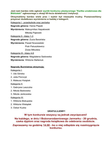 Jest nam bardzo miło ogłosić wyniki konkursu plastycznego "Kartka urodzinowa dla Biblioteki" ogłoszonego z okazji 65-lecia działalności instytucji. Otrzymaliśmy bardzo wiele prac i wybór był niezwykle trudny. Postanowiliśmy przyznać dodatkowo wyróżnienia w każdej z kategorii. Kategoria I - przedszkole oraz zerówka Nagroda główna: Hania Pląsek Wyróżnienia: Maksymilian Napałowski Mikołaj Pajewski Kategoria II - klasy 1-3 Nagroda główna: Zuzia Barańska Wyróżnienia: Paweł Nowosielski Piotr Paluszkiewicz Zosia Mikulska Kategoria III - klasy 4-6 Nagroda główna: Magdalena Sadowska Wyróżnienie: Wiktoria Stefaniuk Nagrody Burmistrza otrzymują: Kategoria I: 1. Ula Górska 2. Julia Florczyk 3. Mateusz Książek Kategoria II: 1. Gabrysia Laszczka 2. Nikola Badowska 3. Nikola Jankowska Kategoria III: 1. Wiktoria Biskupska 2. Wiktoria Wielądek 3. Oskar Kuzka GRATULUJEMY! W tym konkursie wszyscy są jednak zwycięzcami! Na każdego, w dniu I Bożonarodzeniowego Jarmarku - 20 grudnia, czeka dyplom oraz nagroda książkowa do odebrania osobiście. Zapraszamy na godzinę 14.00 - bo o niej odbędzie się rozstrzygnięcie konkursu.