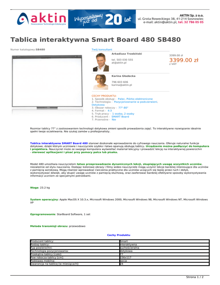 Tablica interaktywna Smart Board 480 SB480 Numer katalogowy:SB480 Twój konsultant NOWOŚĆ W OFERCIE Arkadiusz Trzebiński tel. 503 030 555 [email protected] 3399.00 zł 3399.00 zł z VAT Karina Gładecka 796 603 606 [email protected] CECHY PRODUKTU: 1. Sposób obsługi - Palec, Piórko elektroniczne 2. Technologia - Pozycjonownanie w podczerwieni, Dotykowa 3. Obszar roboczy - 77"-80" 4. Format - 4:3 5. Tryb pracy - 1 osoba, 2 osoby 6. Producent - SMART Board 7. Przenośne - Nie Rozmiar tablicy 77" z zastosowaniem technologii dotykowa zmieni sposób prowadzenia zajęć. To interaktywne rozwiązanie idealnie spełni twoje oczekiwania. Nie szukaj zamów u profesjonalisty. Tablica interaktywna SMART Board 480 stanowi doskonałe wprowadzenie do cyfrowego nauczania. Oferuje naturalne funkcje dotykowe, dzięki którym uczniowie i nauczyciele szybko i łatwo opanują obsługę tablicy. Urządzenie można podłączyć do komputera i projektora. Nauczyciel może ze swojego komputera wyświetlać materiał lekcyjny i prowadzić lekcję na interaktywnej powierzchni - sterować aplikacjami i pisać przy pomocy palca lub pisaka. Model 480 umożliwia nauczycielom łatwe przeprowadzanie dynamicznych lekcji, skupiających uwagę wszystkich uczniów, niezależnie od stylu nauczania. Dodając kolorowe obrazy i filmy wideo nauczyciele mogą uczynić lekcje bardziej interesujące dla uczniów z pamięcią wzrokową. Mogą również wprowadzać ćwiczenia praktyczne dla uczniów uczących się lepiej przez ruch i dotyk, wykorzystywać dźwięk, aby skupić uwagę uczniów z pamięcią słuchową, oraz zaoferować bardziej efektywne sposoby wykorzystywania informacji uczniom ze specjalnymi potrzebami. Waga: 23.2 kg System operacyjny: Apple MacOS X 10.3.x, Microsoft Windows 2000, Microsoft Windows 98, Microsoft Windows NT, Microsoft Windows XP Oprogramowanie: StarBoard Software, 1 set Metoda transmisji obrazu: przewodowo Cechy Produktu Producent tablicy: Rodzaj tablicy: Typ powierzchni: Technologia pozycjonowania: Przekątna tablicy [cale]: Pow robocza tablicy [cm]: Podstawa mobilna: Gwarancja na tablicę [w miesiącach]: Smart interaktywna suchościeralna dotykowa 77 156x117 opcja 24 Strona 1 / 2 Strona 2 / 2 Powered by TCPDF (www.tcpdf.org)