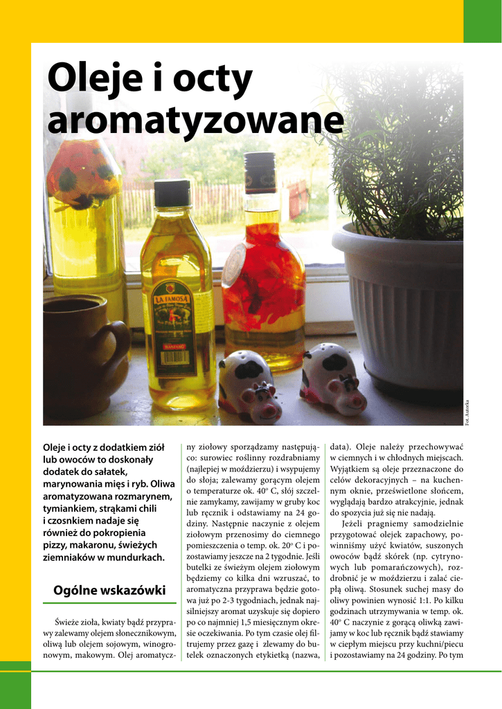 Fot. Autorka Oleje i octy aromatyzowane Oleje i octy z dodatkiem ziół lub owoców to doskonały dodatek do sałatek, marynowania mięs i ryb. Oliwa aromatyzowana rozmarynem, tymiankiem, strąkami chili i czosnkiem nadaje się również do pokropienia pizzy, makaronu, świeżych ziemniaków w mundurkach. Ogólne wskazówki Świeże zioła, kwiaty bądź przyprawy zalewamy olejem słonecznikowym, oliwą lub olejem sojowym, winogronowym, makowym. Olej aromatycz- ny ziołowy sporządzamy następująco: surowiec roślinny rozdrabniamy (najlepiej w moździerzu) i wsypujemy do słoja; zalewamy gorącym olejem o temperaturze ok. 40o C, słój szczelnie zamykamy, zawijamy w gruby koc lub ręcznik i odstawiamy na 24 godziny. Następnie naczynie z olejem ziołowym przenosimy do ciemnego pomieszczenia o temp. ok. 20o C i pozostawiamy jeszcze na 2 tygodnie. Jeśli butelki ze świeżym olejem ziołowym będziemy co kilka dni wzruszać, to aromatyczna przyprawa będzie gotowa już po 2-3 tygodniach, jednak najsilniejszy aromat uzyskuje się dopiero po co najmniej 1,5 miesięcznym okresie oczekiwania. Po tym czasie olej filtrujemy przez gazę i zlewamy do butelek oznaczonych etykietką (nazwa, data). Oleje należy przechowywać w ciemnych i w chłodnych miejscach. Wyjątkiem są oleje przeznaczone do celów dekoracyjnych – na kuchennym oknie, prześwietlone słońcem, wyglądają bardzo atrakcyjnie, jednak do spozycia już się nie nadają. Jeżeli pragniemy samodzielnie przygotować olejek zapachowy, powinniśmy użyć kwiatów, suszonych owoców bądź skórek (np. cytrynowych lub pomarańczowych), rozdrobnić je w moździerzu i zalać ciepłą oliwą. Stosunek suchej masy do oliwy powinien wynosić 1:1. Po kilku godzinach utrzymywania w temp. ok. 40o C naczynie z gorącą oliwką zawijamy w koc lub ręcznik bądź stawiamy w ciepłym miejscu przy kuchni/piecu i pozostawiamy na 24 godziny. Po tym Oleje i octy kwiatowe Do aromatyzowania olejów i octów możemy używać właściwie wszystkich kwiatów jadalnych: nagietka, nasturcji, bratka, róży, ogórecznika, stokrotek, rumianku czy mniszka lekarskiego bądź bzu czarnego – jest ich mnóstwo i nie będziemy tutaj wszystkich wyliczać. Informacji na temat jadalnych kwiatów można poszukać w internecie, np. na stronie Macieja Kuronia: www.kuron.com.pl. Główki kwiatowe należy zerwać przed południem, kiedy obeschną z porannej rosy. Garść kwiatów wsypujemy do naczynia i zalewamy ciepłym olejem lub oliwą z oliwek. Olej taki posłuży nam głównie do sałatek, raczej nie nadaje się do smażenia na nim, znakomicie też będzie wyglądał jako element dekoracyjny w kuchni – jednak wówczas już po krótkim czasie nie będzie nadawał się do spożycia. Balsam lawendowy z oliwy Bierzemy 25 g świeżych kwiatów lawendy zmieszanych ze świeżym zielem rozmarynu. Wkładamy zioła do garnuszka, który umieszczamy w dobrze ciepłej kapieli wodnej. Zalewamy Fot. Autorka czasie studzimy i zlewamy do ciemnych butelek. Oleje ziołowe mogą być używane do kąpieli, do nacierań, do okładów oraz do celów spożywczych. Zawierają w swym składzie nie tylko olejki eteryczne, ale także składniki balastowe rozpuszczalne w tłuszczach, np. chlorofil, karoteny, ksantofile, enzymy, witaminy rozpuszczalne w tłuszczach (A,D,E,K,F), żywice, woski, kwasy tłuszczowe, alkaloidy i in., mające również dużą wartość leczniczą. Zestawy mieszanek ziołowych i innych przeznaczonych do aromatyzowania naszych olejów, oliwek i octów zależą właściwie wyłącznie od naszych upodobań smakowych. Podam tutaj przykładowe zestawy ziół, przypraw i kwiatów, które mogą służyć nam swoimi aromatami. zioła 3/4 l ciepłej oliwy lub oleju słonecznikowego. Podgrzewamy w temp. ok. 50oC przez dwie godziny. Po tym czasie pozwalamy oliwie wystygnąć i starannie przecedzamy ją przez gęste sitko lub gazę. Rozlewamy do wyparzonych butelek, najlepiej z ciemnego szkła i zamykamy. najdłużej zachowała walory smakowe, należy ją przechowywać w lodówce. Oliwę chili stosujemy jako ostrą przyprawę, nie należy na niej smażyć i gotować, ponieważ jest zbyt ostra dla większości ludzi. Danie skrapiamy jedynie oliwą lub dodajemy jej do dipów sałatkowych. Ocet fiołkowy Wkładamy do butelki kwiaty fiołków lub bratków. Zalewamy lekko letnim octem i odstawiamy w nasłonecznione miejsce na parapecie. Po kilku dniach zlewamy i przecedzamy. Podobnie przygotowujemy aromatyzowane octy z każdym innym dodatkiem:ziołami, czosnkiem, owocami. Oliwa ziołowa Dowolną mieszankę ziół (oregano, rozmaryn, majeranek, kolendrę, bazylię, tymianek, jałowiec) w ilości 2 łyżki stołowe na 500 ml oliwy wsypujemy do naczynia. Dodajemy oliwę i dobrze mieszamy składniki. Naczynie szczelnie zamykamy i umieszczamy w ciemnym miejscu. Odstawiamy na 3 tygodnie, a w tym czasie, co 2 dni, wstrząsamy butelką, tak, aby zioła nie osadzały się na ściankach, a substancje zapachowo-smakowe migrowały swobodnie. Po tym czasie przecedzamy przez sitko lub gazę. Przenosimy naczynie do lodówki i używamy w kuchni. Olej ziołowy bardzo dobrze współgra z daniami delikatnymi, warzywnymi i warzywno-mięsnymi. Bardzo dobrze smakuje jako dodatek do spaghetti. Oleje i octy przyprawowe Oliwa chili Suszone papryczki chilli (4-6 sztuk na 500 ml oleju) w całości wkładamy do naczynia z oliwą. Zamykamy i odstawiamy w ciemne miejsce. Po dwóch tygodniach oliwa nadaje się już do spożycia. Gotowa oliwa nabierze jasnoczerwonej barwy i będzie posiadała intensywnie ostry smak. Aby jak Suszone pomidory w oleju Pomidory przekrawamy na połówki, usuwamy pestki i gniazda nasienne i kładziemy na blachę wyłożoną papierem do pieczenia. Wstawiamy je na ok. 8 godzin do piekarnika nastawionego na 90o C. Po około 4 godzinach dokładamy do pomidorów ząbki czosnku (w łupinach) i podgrzewamy dalej. Kiedy osiągną ćwierć swojej pierwotnej objętości, wkładamy je do wyparzonyc