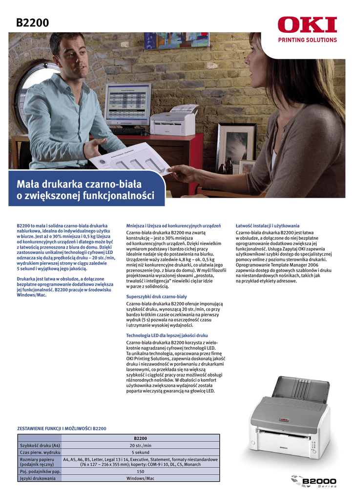 B2200 Mała drukarka czarno-biała o zwiększonej funkcjonalności B2200 to mała i solidna czarno-biała drukarka nabiurkowa, idealna do indywidualnego użytku w biurze. Jest aż o 30% mniejsza i 0,5 kg lżejsza od konkurencyjnych urządzeń i dlatego może być z łatwością przenoszona z biura do domu. Dzięki zastosowaniu unikalnej technologii cyfrowej LED odznacza się dużą prędkością druku – 20 str./min, wydrukiem pierwszej strony w ciągu zaledwie 5 sekund i wyjątkową jego jakością. Drukarka jest łatwa w obsłudze, a dołączone bezpłatne oprogramowanie dodatkowo zwiększa jej funkcjonalność. B2200 pracuje w środowisku Windows/Mac. Mniejsza i lżejsza od konkurencyjnych urządzeń Czarno-biała drukarka B2200 ma zwartą konstrukcję – jest o 30% mniejsza od konkurencyjnych urządzeń. Dzięki niewielkim wymiarom podstawy i bardzo cichej pracy idealnie nadaje się do postawienia na biurku. Urządzenie waży zaledwie 4,8 kg – ok. 0,5 kg mniej niż konkurencyjne drukarki, co ułatwia jego przenoszenie (np. z biura do domu). W myśl filozofii projektowania wyrażonej słowami „prostota, trwałość i inteligencja” niewielki ciężar idzie w parze z solidnością. Łatwość instalacji i użytkowania Czarno-biała drukarka B2200 jest łatwa w obsłudze, a dołączone do niej bezpłatne oprogramowanie dodatkowo zwiększa jej funkcjonalność. Usługa Zapytaj OKI zapewnia użytkownikowi szybki dostęp do specjalistycznej pomocy online z poziomu sterownika drukarki. Oprogramowanie Template Manager 2006 zapewnia dostęp do gotowych szablonów i druku na niestandardowych nośnikach, takich jak na przykład etykiety adresowe. Superszybki druk czarno-biały Czarno-biała drukarka B2200 oferuje imponującą szybkość druku, wynoszącą 20 str./min, co przy bardzo krótkim czasie oczekiwania na pierwszy wydruk (5 s) pozwala na oszczędność czasu i utrzymanie wysokiej wydajności. Technologia LED dla lepszej jakości druku Czarno-biała drukarka B2200 korzysta z wielokrotnie nagradzanej cyfrowej technologii LED. Ta unikalna technologia, opracowana przez firmę OKI Printing Solutions, zapewnia doskonałą jakość druku i niezawodność w porównaniu z drukarkami laserowymi, co przekłada się na większą szybkość i ciągłość pracy oraz możliwość obsługi różnorodnych nośników. W dbałości o komfort użytkownika zwiększona wydajność została poparta wieczystą gwarancją na głowicę LED. ZESTAWIENIE FUNKCJI I MOŻLIWOŚCI B2200 B2200 Szybkość druku (A4) Czas pierw. wydruku Rozmiary papieru (podajnik ręczny) Poj. podajników pap. Języki drukowania 20 str./min 5 sekund A4, A5, A6, B5, Letter, Legal 13 i 14, Executive, Statement, formaty niestandardowe (76 x 127 – 216 x 355 mm); koperty: COM-9 i 10, DL, C5, Monarch 150 Windows/Mac S e r i e s Drukarka czarno-biała B2200 Kod produktu Szybkość i wydajność 43641706 Szybkość druku A4 20 str./min Czas pierwszego wydruku 5 sekund Do 25 sekund od momentu włączenia zasilania Czas nagrzewania Procesor Jakość druku Rozdzielczość Zgodność Języki drukowania 266 MHz 1 200 x 600 dpi Windows/Mac Interfejsy USB 2.0 (full speed) Zgodność z systemami operacyjnymi Windows 2000 / XP / Server 2003 / Vista / Mac OS 8.1 lub nowszy / Mac OS X PowerPC 10.1 lub nowszy1 Oprogramowanie Pamięć Template Manager 2006, Status Monitor2 RAM 8 MB Maks. RAM Podawanie papieru 8 MB Pojemność podajnika 1 150 arkuszy 80 g/m2. Formaty papieru: A4, Letter, Legal 13 i 14. Podajnik ręczny Formaty papieru: A4, A5, A6, B5, Letter, Legal 13 i 14. Executive, Statement, formaty niestandardowe (90 x 148 – 216 x 355 mm) Koperty: COM-9, COM-10, DL, C5, Monarch. Dopuszczalne gramatury dla podajnika standardowego 60 – 105 g/m2 Dopuszczalne gramatury dla podajnika ręcznego 60 – 120 g/m2 Taca odbiorcza Środowisko pracy Wymagane zasilanie 30 arkuszy stroną zadrukowaną do góry Temperatura/wilgotność (praca) 10 – 32°C, wilgotność względna 20 – 80% bez kondensacji Temperatura/wilgotność (przechowywanie) -10 – 43°C, wilgotność względna 10 – 90% bez kondensacji Zasilanie 230 V +/- 10%, 50 lub 60 Hz +/- 2% Zużycie energii elektrycznej Głośność Typowe: 360 W, maksymalne: 660 W, w trybie gotowości: 60 W (średnio), w trybie oszczędzania energii: < 10 W Podczas pracy: maks. 52 dB(A), w trybie gotowości: prawie bezgłośnie, w trybie oszczędzania energii: prawie bezgłośnie Wymiary (wys. x szer. x gł.) 181 mm x 321 mm x 204 mm (bez podajnika papieru) Waga Obciążalność Około 4,8 kg (ze wszystkimi materiałami eksploatacyjnymi) Obciążalność maksymalna 15 000 stron/miesiąc Obciążalność średnia 500 – 2 500 stron/miesiąc Gwarancja 1 2 24 miesiące w serwisie, 72-godzinny czas naprawy Informacje na temat najnowszych wersji sterowników znajdują się na stronie OKI Printing Solutions: www.oki.pl Informacje na temat zgodności z systemami operacyjnymi znajdują się na stronie OKI Printing Solutions: www.oki.pl Informacje dot. materiałów eksploatacyjnych: aby zagwarantować niezawodną pracę drukarki oraz jej pełną funkcjonalność, zaprojektowano ją w taki sposób, aby działała tylko z oryginalnymi materiałami eksploatacyjnymi firmy OKI Printing Solutions. Można je rozpoznać po znaku firmowym OKI. Inne materiały eksploatacyjne mogą nie współpracować prawidłowo z drukarką, nawet jeśli oznaczone są jako „zgodne” z danym modelem. Jeśli toner nie współpracuje prawidłowo z drukarką, może spowodować pogorszenie wydajności drukarki i jakości wydruków. Opis Wydajność* (liczba stron) Toner czarny 2 000 43640302 Bęben światłoczuły 15 000 43650302 Kod produktu * Wszystkie tonery: dla stron A4, zgodnie z normą ISO/IEC 19752. Tonery dostarczane z drukarką: 1 000 stron, zgodnie z normą ISO/IEC 19752. Wszystkie bębny: wydruk ciągły. © 2007 Oki Europe Ltd. OKI Printing Solutions to zastrzeżona nazwa towarowa Oki Europe Ltd. Wersja 1.0 08/2007. Specyfikacje 