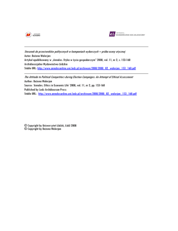 Stosunek do przeciwników politycznych w kampaniach wyborczych – próba oceny etycznej Autor: Bożena Walerjan Artykuł opublikowany w „Annales. Etyka w życiu gospodarczym” 2008, vol. 11, nr 2, s. 153-160 Archidiecezjalne Wydawnictwo Łódzkie Stable URL: http://www.annalesonline.uni.lodz.pl/archiwum/2008/2008_02_walerjan_153_160.pdf The Attitude to Political Competitors during Election Campaigns: An Attempt of Ethical Assessment Author: Bożena Walerjan Source: ‘Annales. Ethics in Economic Life’ 2008, vol. 11, nr 2, pp. 153-160 Published by Lodz Archdiocesan Press Stable URL: http://www.annalesonline.uni.lodz.pl/archiwum/2008/2008_02_walerjan_153_160.pdf © Copyright by Uniwersytet Łódzki, Łódź 2008 © Copyright by Bożena Walerjan Bożena Walerjan Uniwersytet Medyczny w Łodzi e-mail: [email protected] Stosunek do przeciwników politycznych w kampaniach wyborczych – próba oceny etycznej 1. Wstęp Jednym z nieodłącznych aspektów polityki jest rywalizacja indywidualna oraz zbiorowa. Występuje ona zarówno podczas kampanii wyborczych jak i w okresach pomiędzy wyborami, kiedy to możemy obserwować walkę przeciwników politycznych podporządkowaną rozmaitym strategiom mającym na celu zdobycie bądź utrzymanie władzy. Partie i politycy w dążeniu do zwycięstwa i przeforsowania swoich poglądów nie wahają się przed zwalczaniem rywali metodami nieetycznymi, dążą do umniejszenia roli i znaczenia swoich oponentów, co dodatkowo zniechęca wyborców do uczestnictwa w życiu politycznym. Uprawianie gier politycznych dominuje nad sporami programowymi, z których to przecież powinny wynikać decyzje wyborców odnośnie głosowania w wyborach. W swoim referacie zamierzam dokonać wstępnej analizy stosunku do przeciwników politycznych w oparciu o kilka przypadków zwalczania się konkurentów, które miały miejsce podczas wyborów w Polsce po 1989 r. Postaram się ukazać to zagadnienie z punktu widzenia etyki i moralności, które sugerują określony styl rywalizacji politycznej w państwie demokratycznym. Jednocześnie pragnę zaznaczyć, iż referat ten przedstawia tylko w zarysie wybrane zagadnienie i powinien być traktowany jako wstęp do rozważań nad daną problematyką zachęcający do pogłębienia refleksji w tym obszarze. 2. Stosunek do przeciwników politycznych w kontekście kampanii negatywnej i socjotechniki Wydaje się, iż u podstaw przejawiania negatywnego stosunku do przeciwników politycznych znajdują się pytania, które większość polityków startujących w wyścigu wyborczym musi sobie zadawać, a które zgrabnie formułuje Mirosław Karwat: „Jak wygrać nie będąc najlepszym? Jak wygrać nie tyle dzięki własnym atutom i zasobom, ile dzięki cudzym słabościom, błędom; nie tyle dzięki skuteczności własnego popisu, ile dzięki skuteczności zniechęceniu do rywali?”1. Szczególną rolę w postawach politycznych odgrywa komponent 1 M. Karwat, Makiaweliczne taktyki walki politycznej, „Studia Politologiczne” 2004, nr 9, s. 50. 153 emocjonalny, dlatego znacznie skuteczniejsze bywa przemawianie do uczuć wyborców niż argumentowanie logiczne. Ponadto gdy umiejętności i program schodzą we współzawodnictwie wyborczym na drugi plan, otwiera się pole do działań rywalizacyjnych, zwłaszcza wtedy, gdy nie ma się wyborcom nic innego do zaoferowania. Jak słusznie po raz kolejny zauważa Karwat: „wystarczy zastąpić ofertę programu, kwalifikacji i rzeczywistej własnej sprawności igrzyskami dyskredytacyjnymi, a w myśleniu wyborców – zastąpić racjonalny namysł i wybór porywami emocji i inercją wzbudzonych uprzedzeń pozytywnych lub negatywnych”2. Tego rodzaju praktyki mieszczą się w pojęciu taktyk makiawelicznych, które odzwierciedlają się najpełniej właśnie podczas kampanii wyborczych w stosunkach między przeciwnikami politycznymi. Refleksję na temat stosunku do przeciwników politycznych należy łączyć z zagadnieniami dotyczącymi marketingu politycznego, a konkretnie stosowania strategii wyborczej opartej na reklamie negatywnej. Coraz częściej w polskiej polityce możemy zaobserwować sytuacje, w których podanie nawet niesprawdzonych informacji na temat rywala, czy choćby zasugerowanie popełnienia czynu niemoralnego bądź niezgodnego z prawem, na dobre eliminuje kandydata z walki o wyborcze cele. Wykonawcami tego typu strategii bywają obecnie przede wszystkim tzw. „czarne charaktery” w sztabach wyborczych kandydatów, czyli osoby, które ryzykują swoją reputację, aby tylko osiągnąć zamierzony skutek czyli zaszkodzić politycznemu przeciwnikowi. Takie działania miały miejsce dwukrotnie w trakcie kampanii prezydenckiej i parlamentarnej 2005 r., kiedy najpierw pojawiły się oskarżenia podające w wątpliwość prawdomówność Włodzimierza Cimoszewicza, który miał zataić w swoich zeznaniach podatkowych dochody z obrotu akcjami spółki PKN Orlen. W aferę została zamieszana była asystentka Cimoszewicza, Anna Jarucka. Pomimo, iż prokuratura w krótkim czasie uznała, że niewątpliwa niezgodność z prawdą zeznań Cimoszewicza nie nosi znamion przestępstwa, oraz pomimo postawienia Jaruckiej zarzutów – m.in. fałszerstwa – notowania Cimoszewicza w sondażach przedwyborczych tak dramatycznie spadły, że zdecydował on o wycofaniu się z ubiegania się o urząd prezydenta państwa. Drugi przykład miał miejsce w przypadku Donalda Tuska i posądzenia jego dziadka o służbę w niemieckiej armii podczas II wojny światowej. Okazało się to w krótkim czasie nieprawdą, bowiem dziadek Tuska został wcielony do Wehrmachtu pod przymusem. Donald Tusk co prawda nie wycofał się z wyborów, ale w drugiej turze przegrał walkę o prezydenturę z Lechem Kaczyńskim. Te konkretne zdarzenia w sposób oczywisty dowodzą „opłacalności” stosowania strategii polegającej na dyskredytowaniu, oczernianiu i etykietyzowaniu przeciwnika, bowiem „zwycięża ten kto spra
