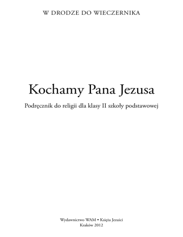 W DRODZE DO WIECZERNIKA Kochamy Pana Jezusa Podręcznik do religii dla klasy II szkoły podstawowej Wydawnictwo WAM • Księża Jezuici Kraków 2012 Spis treści I. Słuchamy słów Boga. Mów, Panie! ..............................................................................5 1. Słuchamy ludzi i Boga .................................................................................................6 2. Bóg mówi do nas w pięknie stworzonego świata ..........................................................8 3. Bóg mówi do nas w Piśmie Świętym..........................................................................10 4. Bóg mówi do nas przez Jezusa Chrystusa ...................................................................12 5. Bóg mówi do nas przez ludzi .....................................................................................14 6. Bóg mówi do nas w głosie sumienia...........................................................................16 7. Bóg wzywa, byśmy słuchali Pana Jezusa .....................................................................18 8. Maryja uczy nas słuchać Pana Jezusa. Modlitwa różańcowa .......................................20 9. Wypełniamy słowa Pana Jezusa ..................................................................................22 II. Odpowiadamy Bogu. Oto ja, poślij mnie ................................................................25 10. Jezus zaprasza nas do rozmowy ................................................................................26 11. Przyjmujemy słowo Boże .........................................................................................28 12. Dobre serca świętych. Uroczystość Wszystkich Świętych ..........................................30 13. Chcemy być blisko Boga jak w raju .........................................................................32 14. Chcemy ufać Bogu jak Abraham .............................................................................34 15. Chcemy wypełniać polecenia Boga jak Mojżesz .......................................................36 16. Chcemy słuchać Boga jak Samuel ............................................................................38 17. Kochający Władca naszych serc. Jezusa Chrystusa, Króla wszechświata ....................40 18. Bóg wzywa nas do nawrócenia. Adwent ...................................................................42 19. Od Maryi uczymy się mówić Bogu: „Tak” ...............................................................44 20. Z Matką Bożą wysławiamy Boga .............................................................................46 III. Dziękujemy Bogu. Dzięki, o Panie .........................................................................49 21. Bóg jest z nami. Boże Narodzenie ............................................................................50 22. Bóg przychodzi do wszystkich ludzi. Objawienie Pańskie ........................................52 23. Józef – odważny Opiekun Jezusa .............................................................................54 24. Jezus uczy nas kochać Boga Ojca .............................................................................56 25. Jezus jest Synem Bożym. Chrzest Pański ..................................................................58 26. Jezus jest Panem nieba i ziemi..................................................................................60 27. Widzieć to, co najważniejsze ....................................................................................62 28. Pan Jezus Dobrym Pasterzem ..................................................................................64 29. Nasza Uczta dziękczynienia .....................................................................................66 IV. Odchodzimy od Boga i powracamy. Przyjmij mnie, Ojcze .....................................69 30. Pan Jezus wzywa do nawrócenia. Wielki Post ...........................................................70 31. Dar odpuszczania grzechów. Ustanowienie sakramentu pokuty i pojednania ...........72 32. Przyjmujemy dar przebaczenia .................................................................................74 33. Nieszczęście grzesznika ............................................................................................76 34. Droga powrotu do Ojca ..........................................................................................78 35. Z Panem Jezusem zwyciężamy grzech ......................................................................80 36. Powierzamy Bogu nasze słabości ..............................................................................82 V. Spotykamy naszego Zbawiciela. Raduj się, Ziemio...................................................85 37. Bóg Ojciec troszczy się o nas ...................................................................................86 38. Jezus ofiaruje siebie za nas. Ostatnia Wieczerza ........................................................88 39. Jezus oddaje swoje życie za nas. Wielki Piątek ..........................................................90 40. Jezus ofiaruje siebie za nas. Eucharystia....................................................................92 41. Jezus zwycięża śmierć. Alleluja! Wielkanoc...............................................................94 42. Chrystus zmartwychwstał. Uczta eucharystyczna .....................................................96 VI. Otrzymujemy. Boże dary ........................................................................................99 43. Jesteśmy dziećmi Bożymi. Chrzest święty ..............................................................100 44. Być świadkiem Pana Jezusa. Bierzmowanie ............................................................102 45. Pan Jezus daje nam siebie. Eucharystia...................................................................104 46. Najświęt