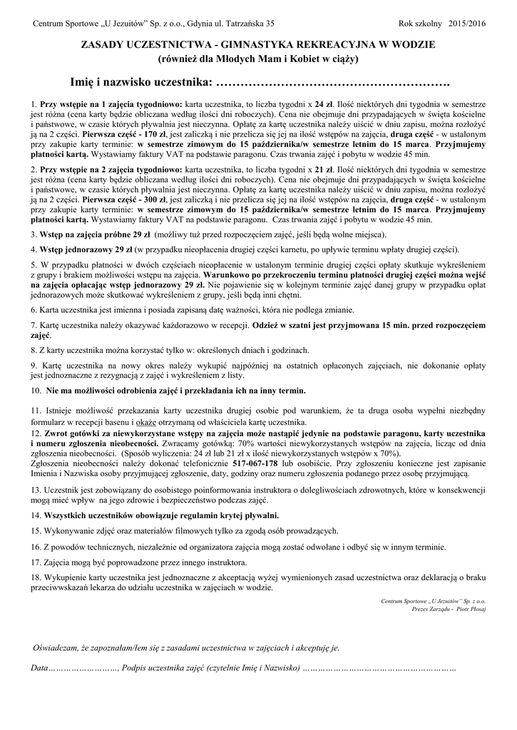 Centrum Sportowe „U Jezuitów” Sp. z o.o., Gdynia ul. Tatrzańska 35 Rok szkolny 2015/2016 ZASADY UCZESTNICTWA - GIMNASTYKA REKREACYJNA W WODZIE (również dla Młodych Mam i Kobiet w ciąży) Imię i nazwisko uczestnika: …………………………………………………. 1. Przy wstępie na 1 zajęcia tygodniowo: karta uczestnika, to liczba tygodni x 24 zł. Ilość niektórych dni tygodnia w semestrze jest różna (cena karty będzie obliczana według ilości dni roboczych). Cena nie obejmuje dni przypadających w święta kościelne i państwowe, w czasie których pływalnia jest nieczynna. Opłatę za kartę uczestnika należy uiścić w dniu zapisu, można rozłożyć ją na 2 części. Pierwsza część - 170 zł, jest zaliczką i nie przelicza się jej na ilość wstępów na zajęcia, druga część - w ustalonym przy zakupie karty terminie: w semestrze zimowym do 15 października/w semestrze letnim do 15 marca. Przyjmujemy płatności kartą. Wystawiamy faktury VAT na podstawie paragonu. Czas trwania zajęć i pobytu w wodzie 45 min. 2. Przy wstępie na 2 zajęcia tygodniowo: karta uczestnika, to liczba tygodni x 21 zł. Ilość niektórych dni tygodnia w semestrze jest różna (cena karty będzie obliczana według ilości dni roboczych). Cena nie obejmuje dni przypadających w święta kościelne i państwowe, w czasie których pływalnia jest nieczynna. Opłatę za kartę uczestnika należy uiścić w dniu zapisu, można rozłożyć ją na 2 części. Pierwsza część - 300 zł, jest zaliczką i nie przelicza się jej na ilość wstępów na zajęcia, druga część - w ustalonym przy zakupie karty terminie: w semestrze zimowym do 15 października/w semestrze letnim do 15 marca. Przyjmujemy płatności kartą. Wystawiamy faktury VAT na podstawie paragonu. Czas trwania zajęć i pobytu w wodzie 45 min. 3. Wstęp na zajęcia próbne 29 zł (możliwy tuż przed rozpoczęciem zajęć, jeśli będą wolne miejsca). 4. Wstęp jednorazowy 29 zł (w przypadku nieopłacenia drugiej części karnetu, po upływie terminu wpłaty drugiej części). 5. W przypadku płatności w dwóch częściach nieopłacenie w ustalonym terminie drugiej części opłaty skutkuje wykreśleniem z grupy i brakiem możliwości wstępu na zajęcia. Warunkowo po przekroczeniu terminu płatności drugiej części można wejść na zajęcia opłacając wstęp jednorazowy 29 zł. Nie pojawienie się w kolejnym terminie zajęć danej grupy w przypadku opłat jednorazowych może skutkować wykreśleniem z grupy, jeśli będą inni chętni. 6. Karta uczestnika jest imienna i posiada zapisaną datę ważności, która nie podlega zmianie. 7. Kartę uczestnika należy okazywać każdorazowo w recepcji. Odzież w szatni jest przyjmowana 15 min. przed rozpoczęciem zajęć. 8. Z karty uczestnika można korzystać tylko w: określonych dniach i godzinach. 9. Kartę uczestnika na nowy okres należy wykupić najpóźniej na ostatnich opłaconych zajęciach, nie dokonanie opłaty jest jednoznaczne z rezygnacją z zajęć i wykreśleniem z listy. 10. Nie ma możliwości odrobienia zajęć i przekładania ich na inny termin. 11. Istnieje możliwość przekazania karty uczestnika drugiej osobie pod warunkiem, że ta druga osoba wypełni niezbędny formularz w recepcji basenu i okaże otrzymaną od właściciela kartę uczestnika. 12. Zwrot gotówki za niewykorzystane wstępy na zajęcia może nastąpić jedynie na podstawie paragonu, karty uczestnika i numeru zgłoszenia nieobecności. Zwracamy gotówką: 70% wartości niewykorzystanych wstępów na zajęcia, licząc od dnia zgłoszenia nieobecności. (Sposób wyliczenia: 24 zł lub 21 zł x ilość niewykorzystanych wstępów x 70%). Zgłoszenia nieobecności należy dokonać telefonicznie 517-067-178 lub osobiście. Przy zgłoszeniu konieczne jest zapisanie Imienia i Nazwiska osoby przyjmującej zgłoszenie, daty, godziny oraz numeru zgłoszenia podanego przez osobę przyjmującą. 13. Uczestnik jest zobowiązany do osobistego poinformowania instruktora o dolegliwościach zdrowotnych, które w konsekwencji mogą mieć wpływ na jego zdrowie i bezpieczeństwo podczas zajęć. 14. Wszystkich uczestników obowiązuje regulamin krytej pływalni. 15. Wykonywanie zdjęć oraz materiałów filmowych tylko za zgodą osób prowadzących. 16. Z powodów technicznych, niezależnie od organizatora zajęcia mogą zostać odwołane i odbyć się w innym terminie. 17. Zajęcia mogą być poprowadzone przez innego instruktora. 18. Wykupienie karty uczestnika jest jednoznaczne z akceptacją wyżej wymienionych zasad uczestnictwa oraz deklaracją o braku przeciwwskazań lekarza do udziału uczestnika w zajęciach w wodzie. Centrum Sportowe „U Jezuitów” Sp. z o.o. Prezes Zarządu - Piotr Płosaj Oświadczam, że zapoznałam/łem się z zasadami uczestnictwa w zajęciach i akceptuję je. Data………………………, Podpis uczestnika zajęć (czytelnie Imię i Nazwisko) ……………………………………………………