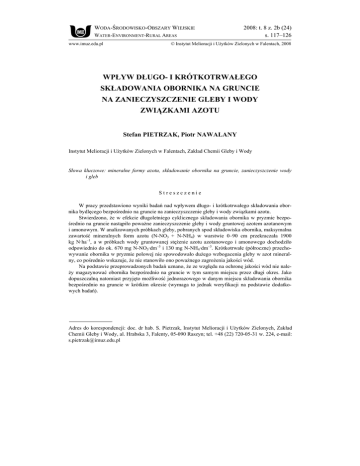 WODA-ŚRODOWISKO-OBSZARY WIEJSKIE WATER-ENVIRONMENT-RURAL AREAS www.imuz.edu.pl 2008: t. 8 z. 2b (24) s. 117–126 © Instytut Melioracji i Użytków Zielonych w Falentach, 2008 WPŁYW DŁUGO- I KRÓTKOTRWAŁEGO SKŁADOWANIA OBORNIKA NA GRUNCIE NA ZANIECZYSZCZENIE GLEBY I WODY ZWIĄZKAMI AZOTU Stefan PIETRZAK, Piotr NAWALANY Instytut Melioracji i Użytków Zielonych w Falentach, Zakład Chemii Gleby i Wody Słowa kluczowe: mineralne formy azotu, składowanie obornika na gruncie, zanieczyszczenie wody i gleb Streszczenie W pracy przedstawiono wyniki badań nad wpływem długo- i krótkotrwałego składowania obornika bydlęcego bezpośrednio na gruncie na zanieczyszczenie gleby i wody związkami azotu. Stwierdzono, że w efekcie długoletniego cyklicznego składowania obornika w pryzmie bezpośrednio na gruncie nastąpiło poważne zanieczyszczenie gleby i wody gruntowej azotem azotanowym i amonowym. W analizowanych próbkach gleby, pobranych spod składowiska obornika, maksymalna zawartość mineralnych form azotu (N-NO3 + N-NH4) w warstwie 0–90 cm przekraczała 1900 kg N·ha–1, a w próbkach wody gruntowanej stężenie azotu azotanowego i amonowego dochodziło odpowiednio do ok. 670 mg N-NO3·dm–3 i 130 mg N-NH4·dm–3. Krótkotrwałe (półroczne) przechowywanie obornika w pryzmie polowej nie spowodowało dużego wzbogacenia gleby w azot mineralny, co pośrednio wskazuje, że nie stanowiło ono poważnego zagrożenia jakości wód. Na podstawie przeprowadzonych badań uznano, że ze względu na ochronę jakości wód nie należy magazynować obornika bezpośrednio na gruncie w tym samym miejscu przez długi okres. Jako dopuszczalną natomiast przyjęto możliwość jednorazowego w danym miejscu składowania obornika bezpośrednio na gruncie w krótkim okresie (wymaga to jednak weryfikacji na podstawie dodatkowych badań). Adres do korespondencji: doc. dr hab. S. Pietrzak, Instytut Melioracji i Użytków Zielonych, Zakład Chemii Gleby i Wody, al. Hrabska 3, Falenty, 05-090 Raszyn; tel. +48 (22) 720-05-31 w. 224, e-mail: [email protected] 118 Woda-Środowisko-Obszary Wiejskie t. 8 z. 2b (24) WSTĘP Wieloletnie i szeroko zakrojone prace badawcze, prowadzone w Instytucie Melioracji i Użytków Zielonych w Falentach, wykazały że niewłaściwe metody przechowywania obornika stanowią poważne zagrożenie jakości wód na obszarach wiejskich [SAPEK, SAPEK, 2007]. Istnienie takiego zagrożenia potwierdziło również Ministerstwo Rolnictwa i Rozwoju Wsi, podając w swoich dokumentach, że w Polsce powszechną praktyką „jest przechowywanie obornika bezpośrednio na gruncie, co ma duży wpływ na zanieczyszczenie studni przydomowych. W efekcie … w 2000 roku 44,8% studni przydomowych posiadało wody złej jakości i niezdatnej do picia (powyżej 10 mg azotanów/l)” [Program…, 2006]. Skala zagrożenia wydaje się duża. W raporcie wykonanym na zlecenie Dyrekcji Generalnej ds. Środowiska (DG ENV) Komisji Europejskiej podaje się – na podstawie szacunków wykonanych z wykorzystaniem modelu MITERRA-EUROPE – że straty wymywania azotu z podwórzy gospodarskich oraz pryzm obornika stanowią do 40% całkowitych strat na skutek wymywania tego składnika [Assessment…, 2007]. Z powyższego wynika, że istnieją dość jednoznaczne negatywne oceny skutków oddziaływania wadliwych metod przechowywania obornika na zanieczyszczenie wody związkami azotu z niego pochodzącymi. Niemniej wiedza na ten temat nie została wystarczająco uwzględniona w dotychczasowych pracach nad wdrażaniem Dyrektywy Azotanowej w Polsce ani też nie jest dostatecznie respektowana w obowiązującym ustawodawstwie. W tym ostatnim przypadku, zgodnie z art. 25 ust. 2 ustawy o nawozach i nawożeniu [2007], nakaz przechowywania obornika na nieprzepuszczalnych płytach, zabezpieczonych w taki sposób, aby wycieki nie przedostawały się do gruntu, ograniczony został jedynie do ferm IPPC1) (wszystkie inne gospodarstwa prowadzące produkcję zwierzęcą są zwolnione z tego obowiązku). Wydaje się, że przedstawiony stan wynika w znacznej części z ciągle jeszcze niepełnych danych dotyczących środowiskowych skutków przechowywania nawozów naturalnych w sposób niewłaściwy (w wymiarze jakościowym i ilościowym). Dlatego też problem wymaga dalszych badań i analiz. Występuje m.in. potrzeba wyjaśnienia takich zagadnień, jak wpływ okresu przechowywania i wielkości pryzm obornika na zanieczyszczenie gleby i wody związkami azotu oraz wielkość strat tego składnika z pryzm obornika (z uwzględnieniem ich zróżnicowania) do wód. W ramy tych potrzeb wpisuje się niniejsza praca. Jej celem jest ocena wpływu długo- (ok. 20 lat) i krótkotrwałego (0,5 roku) składowania obornika na gruncie na zanieczyszczenie gleby i wody związkami azotu. METODY BADAŃ Badania przeprowadzono w okresie od października 2007 r. do maja 2008 r. na dwóch stanowiskach badawczych, w miejscach po oborniku bydlęcym przechowywanym bezpośrednio na gruncie. Na stanowisku 1., zlokalizowanym na nieużytku (rys. 1), obornik był 1) Ferma IPPC (ang. Integrated Pollution Prevention and Control – zintegrowane zapobieganie i ograniczanie zanieczyszczeń) – podmiot, który prowadzi chów lub hodowlę drobiu powyżej 40 000 stanowisk albo chów lub hodowlę świń powyżej 2 000 stanowisk dla świń o wadze ponad 30 kg albo 750 stanowisk dla macior. S. Pietrzak, P. Nawalany: Wpływ długo- i krótkotrwałego składowania obornika… 119 składowany cyklicznie przez ok. 20 lat, na stanowisku 2., położonym na gruncie ornym (rys. 2), przez ok. 0,5 roku. Po wybraniu obornika z pryzm na każdym ze stanowisk (jesienią 2007 r. ze stanowiska 1. i wczesną wiosną 2008 r. ze stanowiska 2.) i z miejsc znajdujących się w ich pobliżu pobrano jednorazowo do analiz próbki gleby z warstwy 0–90 cm. W miejscu długotrwałego, cyklicznego magazynowania obornika (stanowisko 1.) oraz obok niego zainstalowano studzienki pomiarowe. Z tych st