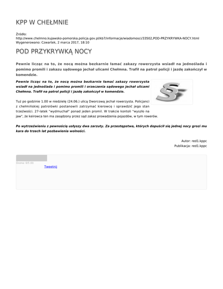 KPP W CHEŁMNIE Źródło: http://www.chelmno.kujawsko-pomorska.policja.gov.pl/kb7/informacje/wiadomosci/33502,POD-PRZYKRYWKA-NOCY.html Wygenerowano: Czwartek, 2 marca 2017, 18:10 POD PRZYKRYWKĄ NOCY Pewnie licząc na to, że nocą można bezkarnie łamać zakazy rowerzysta wsiadł na jednoślada i pomimo promili i zakazu sądowego jechał ulicami Chełmna. Trafił na patrol policji i jazdę zakończył w komendzie. Pewnie licząc na to, że nocą można bezkarnie łamać zakazy rowerzysta wsiadł na jednoślada i pomimo promili i orzeczenia sądowego jechał ulicami Chełmna. Trafił na patrol policji i jazdę zakończył w komendzie. Tuż po godzinie 1.00 w niedzielę (24.06.) ulicą Dworcową jechał rowerzysta. Policjanci z chełmińskiej patrolówki postanowili zatrzymać kierowcę i sprawdzić jego stan trzeźwości. 27-latek "wydmuchał" ponad jeden promil. W trakcie kontoli "wyszło na jaw", że keirowca ten ma zasądzony przez sąd zakaz prowadzenia pojazdów, w tym rowerów. Po wytrzeźwieniu z pewnością usłyszy dwa zarzuty. Za przestępstwa, których dopuścił się jednej nocy grozi mu kara do trzech lat pozbawienia wolności. Autor: red1.kppc Publikacja: red1.kppc Ocena: 0/5 (0) Tweetnij