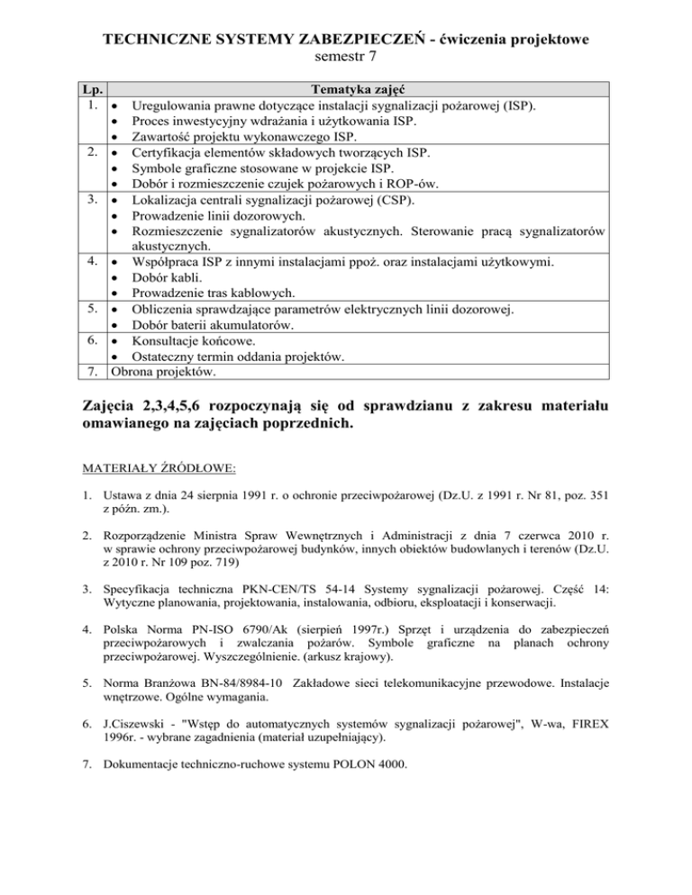 TECHNICZNE SYSTEMY ZABEZPIECZEŃ - ćwiczenia projektowe semestr 7 Tematyka zajęć Uregulowania prawne dotyczące instalacji sygnalizacji pożarowej (ISP). Proces inwestycyjny wdrażania i użytkowania ISP. Zawartość projektu wykonawczego ISP. Certyfikacja elementów składowych tworzących ISP. Symbole graficzne stosowane w projekcie ISP. Dobór i rozmieszczenie czujek pożarowych i ROP-ów. Lokalizacja centrali sygnalizacji pożarowej (CSP). Prowadzenie linii dozorowych. Rozmieszczenie sygnalizatorów akustycznych. Sterowanie pracą sygnalizatorów akustycznych. Współpraca ISP z innymi instalacjami ppoż. oraz instalacjami użytkowymi. Dobór kabli. Prowadzenie tras kablowych. Obliczenia sprawdzające parametrów elektrycznych linii dozorowej. Dobór baterii akumulatorów. Konsultacje końcowe. Ostateczny termin oddania projektów. Obrona projektów. Lp. 1. 2. 3. 4. 5. 6. 7. Zajęcia 2,3,4,5,6 rozpoczynają się od sprawdzianu z zakresu materiału omawianego na zajęciach poprzednich. MATERIAŁY ŹRÓDŁOWE: 1. Ustawa z dnia 24 sierpnia 1991 r. o ochronie przeciwpożarowej (Dz.U. z 1991 r. Nr 81, poz. 351 z późn. zm.). 2. Rozporządzenie Ministra Spraw Wewnętrznych i Administracji z dnia 7 czerwca 2010 r. w sprawie ochrony przeciwpożarowej budynków, innych obiektów budowlanych i terenów (Dz.U. z 2010 r. Nr 109 poz. 719) 3. Specyfikacja techniczna PKN-CEN/TS 54-14 Systemy sygnalizacji pożarowej. Część 14: Wytyczne planowania, projektowania, instalowania, odbioru, eksploatacji i konserwacji. 4. Polska Norma PN-ISO 6790/Ak (sierpień 1997r.) Sprzęt i urządzenia do zabezpieczeń przeciwpożarowych i zwalczania pożarów. Symbole graficzne na planach ochrony przeciwpożarowej. Wyszczególnienie. (arkusz krajowy). 5. Norma Branżowa BN-84/8984-10 Zakładowe sieci telekomunikacyjne przewodowe. Instalacje wnętrzowe. Ogólne wymagania. 6. J.Ciszewski - "Wstęp do automatycznych systemów sygnalizacji pożarowej", W-wa, FIREX 1996r. - wybrane zagadnienia (materiał uzupełniający). 7. Dokumentacje techniczno-ruchowe systemu POLON 4000.