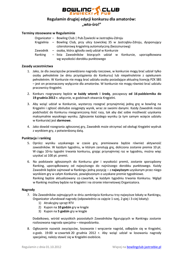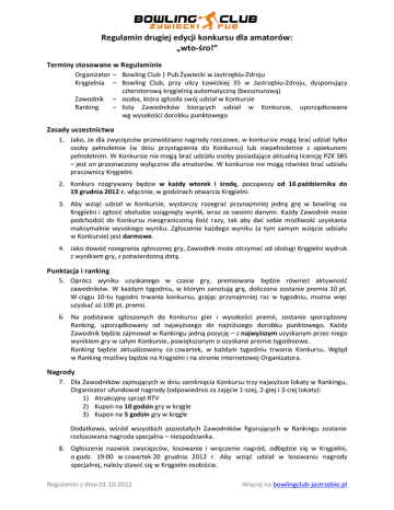 Regulamin drugiej edycji konkursu dla amatorów: „wto-śro!” Terminy stosowane w Regulaminie Organizator – Bowling Club | Pub Żywiecki w Jastrzębiu-Zdroju Kręgielnia – Bowling Club, przy ulicy Łowickiej 35 w Jastrzębiu-Zdroju, dysponujący czterotorową kręgielnią automatyczną (bezsznurową) Zawodnik – osoba, która zgłosiła swój udział w Konkursie Ranking – lista Zawodników biorących udział w Konkursie, uporządkowana wg wysokości dorobku punktowego Zasady uczestnictwa 1. Jako, że dla zwycięzców przewidziano nagrody rzeczowe, w konkursie mogą brać udział tylko osoby pełnoletnie (w dniu przystąpienia do Konkursu) lub niepełnoletnie z opiekunem pełnoletnim. W Konkursie nie mogą brać udziału osoby posiadające aktualną licencję PZK SBS – jest on przeznaczony wyłącznie dla amatorów. W konkursie nie mogą również brać udziału pracownicy Kręgielni. 2. Konkurs rozgrywany będzie w każdy wtorek i środę, począwszy od 16 października do 19 grudnia 2012 r. włącznie, w godzinach otwarcia Kręgielni. 3. Aby wziąć udział w Konkursie, wystarczy rozegrać przynajmniej jedną grę w bowling na Kręgielni i zgłosić obsłudze osiągnięty wynik, wraz ze swoimi danymi. Każdy Zawodnik może podchodzić do Konkursu nieograniczoną ilość razy, tak aby dać sobie możliwość uzyskania maksymalnie wysokiego wyniku. Zgłoszenie każdego wyniku (a tym samym wzięcie udziału w Konkursie) jest darmowe. 4. Jako dowód rozegrania zgłoszonej gry, Zawodnik może otrzymać od obsługi Kręgielni wydruk z wynikiem gry, z potwierdzoną datą. Punktacja i ranking 5. Oprócz wyniku uzyskanego w czasie gry, premiowana będzie również aktywność zawodników. W każdym tygodniu, w którym zanotują grę, doliczona zostanie premia 10 pt. W ciągu 10-tu tygodni trwania konkursu, grając przynajmniej raz w tygodniu, można więc uzyskać aż 100 pt. premii. 6. Na podstawie zgłoszonych do Konkursu gier i wysokości premii, zostanie sporządzony Ranking, uporządkowany od najwyższego do najniższego dorobku punktowego. Każdy Zawodnik będzie zajmował w Rankingu jedną pozycję – z najwyższym uzyskanym przez niego wynikiem gry w całym Konkursie, powiększonym o uzyskane premie tygodniowe. Ranking będzie aktualizowany co czwartek, w każdym tygodniu trwania Konkursu. Wgląd w Ranking możliwy będzie na Kręgielni i na stronie internetowej Organizatora. Nagrody 7. Dla Zawodników zajmujących w dniu zamknięcia Konkursu trzy najwyższe lokaty w Rankingu, Organizator ufundował nagrody (odpowiednio za zajęcie 1-szej, 2-giej i 3-ciej lokaty): 1) Atrakcyjny sprzęt RTV 2) Kupon na 10 godzin gry w kręgle 3) Kupon na 5 godzin gry w kręgle Dodatkowo, wśród wszystkich pozostałych Zawodników figurujących w Rankingu zostanie rozlosowana nagroda specjalna – niespodzianka. 8. Ogłoszenie nazwisk zwycięzców, losowanie i wręczenie nagród, odbędzie się w Kręgielni, o godz. 19:00 w czwartek 20 grudnia 2012 r. Aby wziąć udział w losowaniu nagrody specjalnej, należy stawić się w Kręgielni osobiście. Regulamin z dnia 01.10.2012 Więcej na bowlingclub-jastrzebie.pl