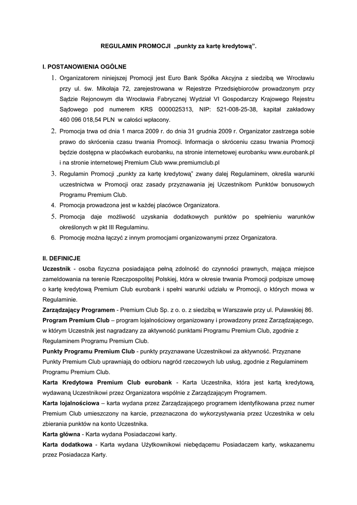 REGULAMIN PROMOCJI „punkty za kartę kredytową”. I. POSTANOWIENIA OGÓLNE 1. Organizatorem niniejszej Promocji jest Euro Bank Spółka Akcyjna z siedzibą we Wrocławiu przy ul. św. Mikołaja 72, zarejestrowana w Rejestrze Przedsiębiorców prowadzonym przy Sądzie Rejonowym dla Wrocławia Fabrycznej Wydział VI Gospodarczy Krajowego Rejestru Sądowego pod numerem KRS 0000025313, NIP: 521-008-25-38, kapitał zakładowy 460 096 018,54 PLN w całości wpłacony. 2. Promocja trwa od dnia 1 marca 2009 r. do dnia 31 grudnia 2009 r. Organizator zastrzega sobie prawo do skrócenia czasu trwania Promocji. Informacja o skróceniu czasu trwania Promocji będzie dostępna w placówkach eurobanku, na stronie internetowej eurobanku www.eurobank.pl i na stronie internetowej Premium Club www.premiumclub.pl 3. Regulamin Promocji „punkty za kartę kredytową” zwany dalej Regulaminem, określa warunki uczestnictwa w Promocji oraz zasady przyznawania jej Uczestnikom Punktów bonusowych Programu Premium Club. 4. Promocja prowadzona jest w każdej placówce Organizatora. 5. Promocja daje możliwość uzyskania dodatkowych punktów po spełnieniu warunków określonych w pkt III Regulaminu. 6. Promocję można łączyć z innym promocjami organizowanymi przez Organizatora. II. DEFINICJE Uczestnik - osoba fizyczna posiadająca pełną zdolność do czynności prawnych, mająca miejsce zameldowania na terenie Rzeczpospolitej Polskiej, która w okresie trwania Promocji podpisze umowę o kartę kredytową Premium Club eurobank i spełni warunki udziału w Promocji, o których mowa w Regulaminie. Zarządzający Programem - Premium Club Sp. z o. o. z siedzibą w Warszawie przy ul. Puławskiej 86. Program Premium Club – program lojalnościowy organizowany i prowadzony przez Zarządzającego, w którym Uczestnik jest nagradzany za aktywność punktami Programu Premium Club, zgodnie z Regulaminem Programu Premium Club. Punkty Programu Premium Club - punkty przyznawane Uczestnikowi za aktywność. Przyznane Punkty Premium Club uprawniają do odbioru nagród rzeczowych lub usług, zgodnie z Regulaminem Programu Premium Club. Karta Kredytowa Premium Club eurobank - Karta Uczestnika, która jest kartą kredytową, wydawaną Uczestnikowi przez Organizatora wspólnie z Zarządzającym Programem. Karta lojalnościowa – karta wydana przez Zarządzającego programem identyfikowana przez numer Premium Club umieszczony na karcie, przeznaczona do wykorzystywania przez Uczestnika w celu zbierania punktów na konto Uczestnika. Karta główna - Karta wydana Posiadaczowi karty. Karta dodatkowa - Karta wydana Użytkownikowi niebędącemu Posiadaczem karty, wskazanemu przez Posiadacza Karty. Punkty bonusowe – dodatkowe punkty Programu Premium Club. III. WARUNKI UDZIAŁU W PROMOCJI I NALICZANIA PUNKTÓW BONUSOWYCH 1. Uczestnicy nie będący posiadaczami karty kredytowej VISA Classic Premium Club eurobank otrzymają 1500 Punktów bonusowych Premium Club jeżeli w okresie Promocji spełnią następujące warunki: a) podpiszą umowę o główną kartę kredytową VISA Classic Premium Club eurobank lub/i podpiszą umowę o dodatkową kartę kredytową VISA Classic Premium Club eurobank, b) w przypadku klientów, którzy posiadają kartę lojalnościową Premium Club, poinformują Doradcę Klienta w oddziale eurobanku o jej numerze, c) aktywują kartę kredytową VISA Classic Premium Club eurobank, d) dokonają co najmniej jednej transakcji bezgotówkowej lub gotówkowej kartą kredytową VISA Classic Premium Club eurobank, e) w przypadku Uczestników, który są posiadaczami głównej karty kredytowej VISA Classic Premium Club eurobank i podpiszą w okresie Promocji umowę o dodatkową kartę kredytową VISA Classic Premium Club eurobank warunkiem udziału w Promocji jest brak zaległości w spłacie minimalnej. 2. Uczestnicy nie będący posiadaczami karty kredytowej VISA Gold Premium Club eurobank otrzymają 2000 Punktów bonusowych Premium Club jeżeli w okresie Promocji spełnią następujące warunki: a) podpiszą umowę o główną kartę kredytową VISA Gold Premium Club eurobank, lub/i podpiszą umowę o dodatkową kartę kredytową VISA Gold Premium Club eurobank, b) w przypadku klientów, którzy posiadają kartę lojalnościową Premium Club, poinformują Doradcę Klienta w oddziale eurobanku o jej numerze, c) dokonają co najmniej jednej transakcji bezgotówkowej lub gotówkowej kartą kredytową VISA Classic Premium Club eurobank, d) w przypadku Uczestników, który są posiadaczami głównej karty kredytowej VISA Gold Premium Club eurobank i podpiszą w okresie Promocji umowę o dodatkową kartę kredytową VISA Gold Premium Club eurobank warunkiem udziału w Promocji jest brak zaległości w spłacie minimalnej. 3. Klient nie może posiadać jednocześnie kart: VISA Classic Premium Club eurobank i VISA Gold Premium Club eurobank. 4. Punkty bonusowe zostaną naliczone w terminie do 21 dni roboczych od momentu dokonania transakcji gotówkowej lub bezgotówkowej kartą kredytową Premium Club eurobank. IV. POSTĘPOWANIE REKLAMACYJNE 1. Reklamacje dotyczące przebiegu Promocji można składać: w placówkach bankowych Organizatora, w serwisie eurobank on-line, telefonicznie w Centrum Obsługi Klienta eurobanku oraz pisemnie na adres banku: Euro Bank S.A., ul. Św. Mikołaja 72, 50-126 Wrocław. 2. Reklamacje mogą być składane nie później niż 60 dni od daty zakończenia trwania Promocji. 3. Reklamacje będą rozpatrywane przez Organizatora w terminie 14 dni roboczych od daty przyjęcia reklamacji. Termin ten może ulec wydłużeniu w przypadku konieczności kontaktu z firmą zewnętrzną. 4. Organizator poinformuje składającego reklamację o zajętym stanowisku telefonicznie lub listem zwykłym lub w formie wiadomości w serwisie eurobank on-line. V. POSTANOWIENIE KOŃCOWE 1. Regulamin Promocji dostępny jest w placówkach bankowych Organizatora, na stronie internetowej eurobanku www.eurobank.pl i na stroni