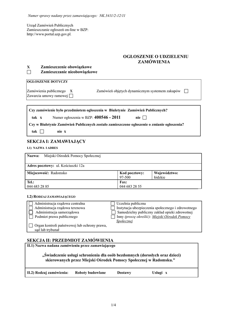 Numer sprawy nadany przez zamawiającego: NK.3411/2-12/11 Urząd Zamówień Publicznych Zamieszczanie ogłoszeń on-line w BZP: http://www.portal.uzp.gov.pl. OGŁOSZENIE O UDZIELENIU ZAMÓWIENIA Zamieszczenie obowiązkowe Zamieszczanie nieobowiązkowe X OGŁOSZENIE DOTYCZY Zamówienia publicznego Zawarcia umowy ramowej x Zamówień objętych dynamicznym systemem zakupów Czy zamówienie było przedmiotem ogłoszenia w Biuletynie Zamówień Publicznych? tak x Numer ogłoszenia w BZP: 400546 - 2011 nie Czy w Biuletynie Zamówień Publicznych zostało zamieszczone ogłoszenie o zmianie ogłoszenia? nie x tak SEKCJA I: ZAMAWIAJĄCY I.1) NAZWA I ADRES Nazwa: Miejski Ośrodek Pomocy Społecznej Adres pocztowy: ul. Kościuszki 12a Miejscowość: Radomsko Kod pocztowy: 97-500 Fax: 044 683 28 55 Tel.: 044 683 28 85 Województwo: łódzkie I.2) RODZAJ ZAMAWIAJĄCEGO Administracja rządowa centralna Administracja rządowa terenowa Administracja samorządowa Podmiot prawa publicznego Uczelnia publiczna Instytucja ubezpieczenia społecznego i zdrowotnego Samodzielny publiczny zakład opieki zdrowotnej Inny (proszę określić): Miejski Ośrodek Pomocy Społecznej Organ kontroli państwowej lub ochrony prawa, sąd lub trybunał SEKCJA II: PRZEDMIOT ZAMÓWIENIA II.1) Nazwa nadana zamówieniu przez zamawiającego „Świadczenie usługi schronienia dla osób bezdomnych (dorosłych oraz dzieci) skierowanych przez Miejski Ośrodek Pomocy Społecznej w Radomsku." II.2) Rodzaj zamówienia: Roboty budowlane Dostawy 1/4 Usługi x II.3) Określenie przedmiotu zamówienia Przedmiotem niniejszego zamówienia jest świadczenie usługi schronienia dla osób bezdomnych (dorosłych oraz dzieci) skierowanych przez Miejski Ośrodek Pomocy Społecznej w Radomsku w placówce przeznaczonej dla osób bezdomnych w okresie od dnia zawarcia umowy do dnia 31 grudnia 2012 r. Na terenie placówki Wykonawca ma obowiązek zapewnić skierowanym osobom bezdomnym: 1) nocleg w pokojach ogrzewanych liczących nie więcej niż 10 łóżek, oddzielnie dla kobiet, mężczyzn oraz rodzin, 2) bieżącą zimną wodę, 3) stały dostęp do węzłów sanitarnych z bieżącą ciepłą wodą, 4) podstawowe środki czystości, 5) dla osób dorosłych jeden gorący posiłek w formie zupy, natomiast dla dzieci poniżej 18 roku życia 3 posiłki w tym jeden gorący w formie zupy oraz 2 posiłki na zimno, 6) zapewnienie dostępu do opieki medycznej, psychiatrycznej i pomocy psychologicznej, 7) umożliwienie terapii odwykowej na terenie schroniska (w indywidualnych przypadkach możliwość korzystania z terapii na zewnątrz), 8) prowadzenie zajęć terapeutycznych ze specjalistą ds. uzależnień 9) niezbędna odzież stosowną do pory roku, 10) pomoc w załatwianiu spraw formalnych tj. np. wyrobieniu dowodu osobistego, ubezpieczenie zdrowotne, rejestracja w PUP, składania wniosków o ustalenie stopnia niepełnosprawności, składania wniosków o przydział mieszkania socjalnego itp. 11) w przypadku placówki zlokalizowanej w odległości większej niż 25 km od siedziby Zamawiającego Wykonawca ma obowiązek na własny koszt zapewnić transport bezdomnego do placówki. 12) w przypadku objęcia osoby bezdomnej indywidualnym programem wychodzenia z bezdomności Wykonawca ma obowiązek realizować postanowienia zawarte w indywidualnym programie zgodnie z art. 49 ust. 5 Ustawy z dnia 12 marca 2004 r. o pomocy społecznej (t.j. Dz. U. z 2009 r. Nr 175 poz. 1362 ze zm.). W/w usługa świadczona będzie w oparciu o indywidualne decyzje administracyjne i skierowanie wystawione przez Zamawiającego na podstawie ustawy o pomocy społecznej. Zamawiający szacuje, że średnio dziennie w ciągu roku ze schroniska korzystać będzie od 10 do 20 osób. Rozliczenie usług następować będzie co miesiąc w terminie do 5 dnia następnego miesiąca. Wykonawca co miesiąc zobowiązany jest przedstawić Zamawiającemu imienny wykaz osób objętych schronieniem (z podziałem na placówki), wraz z datami ich pobytu w placówce. Po podpisaniu umowy Wykonawca ma obowiązek przedstawić Zamawiającemu pisemny wykaz placówek, na terenie których przebywać będą skierowani przez Zamawiającego bezdomni. II.4) WSPÓLNY SŁOWNIK ZAMÓWIEŃ (CPV) Słownik główny Główny przedmiot Dodatkowe przedmioty 85.31.10.00-2 Numer sprawy nadany przez zamawiającego: NK.3411/2-12/11 SEKCJA III: PROCEDURA III.1) TRYB UDZIELENIA ZAMÓWIENIA x Przetarg nieograniczony Negocjacje bez ogłoszenia Przetarg ograniczony Zamówienie z wolnej ręki Negocjacje z ogłoszeniem Zapytanie o cenę Dialog konkurencyjny Licytacja elektroniczna III.2) INFORMACJE ADMINISTRACYJNE Zamówienie dotyczy projektu/programu finansowanego ze środków Unii Europejskiej Nie x Tak SEKCJA IV: UDZIELENIE ZAMÓWIENIA IV.1) DATA UDZIELENIA ZAMÓWIENIA: IV.2) LICZBA OTRZYMANYCH OFERT: IV.3) LICZBA ODRZUCONYCH OFERT: 23/12/2011 (dd/mm/rrrr) 1 0 IV.4) NAZWA I ADRES WYKONAWCY KTÓREMU UDZIELONO ZAMÓWIENIA2) : Nazwa: Konsorcjum Firm: Lider: Stowarzyszenie Centrum Pomocy Panaceum w Radomsku 97-500 Radomsko ul. Sucharskiego 87 A Partnerzy: 1. Chrześcijańskie Stowarzyszenie Dobroczynne Oddział Terenowy w Radomsku ul. Kopiec 17, 97-500 Radomsko 2. Centrum Pomocy Bliźniemu MONAR MARKOT w Klizinie 18, 97-512 Kodrąb 3. Stowarzyszenie Pomocy „Przebudzenie” z siedzibą Kolonia Piaszczyce 1, 97-545 Gomunice Adres pocztowy: ul. Sucharskiego 87 A Miejscowość: Radomsko Kod pocztowy: 97-500 Kraj / województwo: Polska / łódzkie IV.5) szacunkowa wartość zamówienia (bez VAT) 3) Wartość: 123 520,00 PLN V.6) INFORMACJA O CENIE WYBRANEJ OFERTY ORAZ O OFERTACH Z NAJNIŻSZĄ I NAJWYŻSZĄ CENĄ ________________________________________________________________________________________ 4) Cena wybranej oferty 131 240,00 zł Oferta z najniższą ceną 5) 131 240,00 zł / Oferta z najwyższą ceną Waluta: PLN 3/4 5) 131 240,00 zł. DYREKTOR Miejskiego Ośrodka Pomocy Społecznej /-/ mgr Andrzej Barszcz Radomsko, dn. 23.12.2011 r.