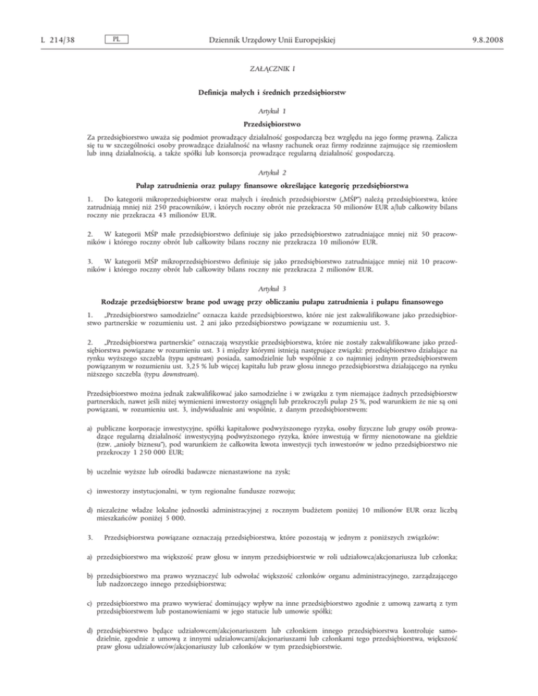 PL L 214/38 Dziennik Urzędowy Unii Europejskiej ZAŁĄCZNIK I Definicja małych i średnich przedsiębiorstw Artykuł 1 Przedsiębiorstwo Za przedsiębiorstwo uważa się podmiot prowadzący działalność gospodarczą bez względu na jego formę prawną. Zalicza się tu w szczególności osoby prowadzące działalność na własny rachunek oraz firmy rodzinne zajmujące się rzemiosłem lub inną działalnością, a także spółki lub konsorcja prowadzące regularną działalność gospodarczą. Artykuł 2 Pułap zatrudnienia oraz pułapy finansowe określające kategorię przedsiębiorstwa 1. Do kategorii mikroprzedsiębiorstw oraz małych i średnich przedsiębiorstw („MŚP”) należą przedsiębiorstwa, które zatrudniają mniej niż 250 pracowników, i których roczny obrót nie przekracza 50 milionów EUR a/lub całkowity bilans roczny nie przekracza 43 milionów EUR. 2. W kategorii MŚP małe przedsiębiorstwo definiuje się jako przedsiębiorstwo zatrudniające mniej niż 50 pracow ników i którego roczny obrót lub całkowity bilans roczny nie przekracza 10 milionów EUR. 3. W kategorii MŚP mikroprzedsiębiorstwo definiuje się jako przedsiębiorstwo zatrudniające mniej niż 10 pracow ników i którego roczny obrót lub całkowity bilans roczny nie przekracza 2 milionów EUR. Artykuł 3 Rodzaje przedsiębiorstw brane pod uwagę przy obliczaniu pułapu zatrudnienia i pułapu finansowego 1. „Przedsiębiorstwo samodzielne” oznacza każde przedsiębiorstwo, które nie jest zakwalifikowane jako przedsiębior stwo partnerskie w rozumieniu ust. 2 ani jako przedsiębiorstwo powiązane w rozumieniu ust. 3. 2. „Przedsiębiorstwa partnerskie” oznaczają wszystkie przedsiębiorstwa, które nie zostały zakwalifikowane jako przed siębiorstwa powiązane w rozumieniu ust. 3 i między którymi istnieją następujące związki: przedsiębiorstwo działające na rynku wyższego szczebla (typu upstream) posiada, samodzielnie lub wspólnie z co najmniej jednym przedsiębiorstwem powiązanym w rozumieniu ust. 3,25 % lub więcej kapitału lub praw głosu innego przedsiębiorstwa działającego na rynku niższego szczebla (typu downstream). Przedsiębiorstwo można jednak zakwalifikować jako samodzielne i w związku z tym niemające żadnych przedsiębiorstw partnerskich, nawet jeśli niżej wymienieni inwestorzy osiągnęli lub przekroczyli pułap 25 %, pod warunkiem że nie są oni powiązani, w rozumieniu ust. 3, indywidualnie ani wspólnie, z danym przedsiębiorstwem: a) publiczne korporacje inwestycyjne, spółki kapitałowe podwyższonego ryzyka, osoby fizyczne lub grupy osób prowa dzące regularną działalność inwestycyjną podwyższonego ryzyka, które inwestują w firmy nienotowane na giełdzie (tzw. „anioły biznesu”), pod warunkiem że całkowita kwota inwestycji tych inwestorów w jedno przedsiębiorstwo nie przekroczy 1 250 000 EUR; b) uczelnie wyższe lub ośrodki badawcze nienastawione na zysk; c) inwestorzy instytucjonalni, w tym regionalne fundusze rozwoju; d) niezależne władze lokalne jednostki administracyjnej z rocznym budżetem poniżej 10 milionów EUR oraz liczbą mieszkańców poniżej 5 000. 3. Przedsiębiorstwa powiązane oznaczają przedsiębiorstwa, które pozostają w jednym z poniższych związków: a) przedsiębiorstwo ma większość praw głosu w innym przedsiębiorstwie w roli udziałowca/akcjonariusza lub członka; b) przedsiębiorstwo ma prawo wyznaczyć lub odwołać większość członków organu administracyjnego, zarządzającego lub nadzorczego innego przedsiębiorstwa; c) przedsiębiorstwo ma prawo wywierać dominujący wpływ na inne przedsiębiorstwo zgodnie z umową zawartą z tym przedsiębiorstwem lub postanowieniami w jego statucie lub umowie spółki; d) przedsiębiorstwo będące udziałowcem/akcjonariuszem lub członkiem innego przedsiębiorstwa kontroluje samo dzielnie, zgodnie z umową z innymi udziałowcami/akcjonariuszami lub członkami tego przedsiębiorstwa, większość praw głosu udziałowców/akcjonariuszy lub członków w tym przedsiębiorstwie. 9.8.2008 9.8.2008 PL Dziennik Urzędowy Unii Europejskiej Zakłada się, że wpływ dominujący nie istnieje, jeżeli inwestorzy wymienieni w ust. 2 akapit drugi nie angażują się bezpośrednio lub pośrednio w zarządzanie danym przedsiębiorstwem, bez uszczerbku dla ich praw jako udziałowców/ akcjonariuszy. Przedsiębiorstwa, które pozostają w jednym ze związków opisanych w akapicie pierwszym z co najmniej jednym przedsiębiorstwem, lub inwestorów, o których mowa w ust. 2, również traktuje się jako powiązanych. Przedsiębiorstwa pozostające w jednym z takich związków z osobą fizyczną lub grupą osób fizycznych działających wspólnie również traktuje się jak przedsiębiorstwa powiązane, jeżeli prowadzą swoją działalność lub część działalności na tym samym właściwym rynku lub rynkach pokrewnych. Za „rynek pokrewny” uważa się rynek dla danego produktu lub usługi znajdujący się bezpośrednio na wyższym lub niższym szczeblu rynku w stosunku do właściwego rynku. 4. Poza przypadkami określonymi w ust. 2 akapit drugi przedsiębiorstwa nie można uznać za małe lub średnie przedsiębiorstwo, jeżeli 25 % lub więcej kapitału lub praw głosu kontroluje bezpośrednio lub pośrednio, wspólnie lub indywidualnie, co najmniej jeden organ państwowy. 5. Przedsiębiorstwa mogą złożyć oświadczenie o swoim statusie prawnym przedsiębiorstwa samodzielnego, przedsię biorstwa partnerskiego lub przedsiębiorstwa powiązanego, załączając dane dotyczące pułapów określonych w art. 2. Oświadczenie można złożyć nawet wtedy, gdy kapitał jest rozdrobniony w stopniu uniemożliwiającym określenie właściciela, w którym to przypadku przedsiębiorstwo w dobrej wierze oświadcza, że w sposób prawnie uzasadniony może przyjąć, iż 25 % lub więcej jego kapitału nie jest w posiadaniu innego przedsiębiorstwa ani we wspóln
