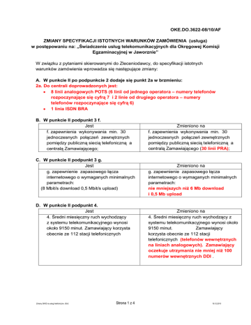 OKE.DO.3622-08/10/AF ZMIANY SPECYFIKACJI ISTOTNYCH WARUNKÓW ZAMÓWIENIA (usługa) w postępowaniu na: „Świadczenie usług telekomunikacyjnych dla Okręgowej Komisji Egzaminacyjnej w Jaworznie” W związku z pytaniami skierowanymi do Zleceniodawcy, do specyfikacji istotnych warunków zamówienia wprowadza się następujące zmiany: A. W punkcie II po podpunkcie 2 dodaje się punkt 2a w brzmieniu: 2a. Do centrali doprowadzonych jest: 8 linii analogowych POTS (6 linii od jednego operatora – numery telefonów rozpoczynające się cyfrą 7 i 2 linie od drugiego operatora – numery telefonów rozpoczynające się cyfrą 6) 1 linia ISDN BRA B. W punkcie II podpunkt 3 f. Jest f. zapewnienia wykonywania min. 30 jednoczesnych połączeń zewnętrznych pomiędzy publiczną siecią telefoniczną a centralą Zamawiającego; C. W punkcie II podpunkt 3 g. Jest g. zapewnienie zapasowego łącza internetowego o wymaganych minimalnych parametrach: (8 Mbit/s download 0,5 Mbit/s upload) D. W punkcie II podpunkt 4. Jest 4. Średni miesięczny ruch wychodzący z systemu telekomunikacyjnego wynosi około 9150 minut. Zamawiający korzysta obecnie ze 112 stacji telefonicznych Zmiany SIWZ na usługi telefoniczne .doc Strona 1 z 4 Zmieniono na f. zapewnienia wykonywania min. 30 jednoczesnych połączeń zewnętrznych pomiędzy publiczną siecią telefoniczną a centralą Zamawiającego (30 linii PRA); Zmieniono na g. zapewnienie zapasowego łącza internetowego o wymaganych minimalnych parametrach: nie mniejszych niż 6 Mb download i 0,5 Mb upload Zmieniono na 4. Średni miesięczny ruch wychodzący z systemu telekomunikacyjnego wynosi około 9150 minut. Zamawiający korzysta obecnie ze 112 stacji telefonicznych (telefonów wewnętrznych na liniach analogowych). Zamawiający oczekuje utrzymania nie mniej niż 100 numerów wewnętrznych DDI . 16.12.2010 E. W punkcie III podpunkt 1 i 2. Jest Termin realizacji zamówienia 1. Dla numerów 6163399 i 6162814 od 1 stycznia 2011r. do 31 grudnia 2012r. 2. Dla numerów 7519071, 7519073, 7520044, 7520290, 7520293 7520388, 7525100 od 17 stycznia 2011r. do 31 grudnia 2012r. F. W punkcie II podpunkt 7. Jest 7. Wykonawca przejmuje na siebie obowiązek przeprowadzenia procedury związanej z zachowaniem numerów. Zmieniono na Termin realizacji zamówienia: od 1 marca 2011 r. do 28 lutego 2012r. Zmieniono na 7. Wykonawca przejmuje na siebie obowiązek przeprowadzenia wszelkich formalności, w tym procedury związanej z zachowaniem numerów. G. W punkcie X podpunkt 2. Jest 2. Termin składania ofert upływa dnia 20 grudnia 2010r. o godz. 11:00. Zmieniono na 2. Termin składania ofert upływa dnia 10 stycznia 2011 r. o godz. 11:00. H. W punkcie X podpunkt 3. Jest 3. Otwarcie ofert jest jawne i nastąpi dnia 20 grudnia 2010r. o godz. 11:10 w siedzibie Okręgowej Komisji Egzaminacyjnej w Jaworznie, ulica Mickiewicza 4, pokój 301 b III piętro Zmieniono na 3. Otwarcie ofert jest jawne i nastąpi dnia 10 stycznia 2011 r. o godz. 11:10 w siedzibie Okręgowej Komisji Egzaminacyjnej w Jaworznie, ulica Mickiewicza 4, pokój 301 b III piętro I. Ponadto wprowadza się zmiany w treści formularza cenowego, stanowiącego załącznik nr 2 do SIWZ, którego aktualną treść przedstawia poniższy formularz. Zmiany SIWZ na usługi telefoniczne .doc Strona 2 z 4 16.12.2010 OKE.DO. 3622 - 8/10/AF Załącznik nr 2 do SIWZ FORMULARZ CENOWY J. Sposób naliczania kwot Darmowa Różnica pomiędzy liczba Średnia Średnią liczbą minut minut w miesięczn dla strefy a Darmową aboname a liczba liczbą minut w ncie dla minut abonamencie dla strefy [X] strefy [W] Lokalne i strefowe Międzystrefowe Sieci telefonii komórkowej: Era, Plus, Orange. Proponowana cena za 1 minutę połączenia brutto po wykorzystaniu darmowych minut wliczonych w abonament w zł [C] Cena brutto za wszystkie połączenia w strefie powyżej limitu darmowych minut w abonamencie X1 3200 W1 = 3200 – X1 C1 C1 x W1 X2 2350 W2 = 2350 – X2 C2 C2 x W2 X3 3400 W3 = 3400 – X3 C3 C3 x W3 Kwota za przeprowadzone rozmowy powyżej liczby minut w abonamencie dla stref SUMA = C1 x W1 + C2 x W2 + C3 x W3 K. Cena brutto proponowanej usługi Miesięczny abonament = ABON Kwota za obsługę ruchu = ABON + SUMA Kwota abonamentu za łącze internetowe Razem miesięcznie = INT SUMA + KWOTA + INT Podpis/y osoby/osób upoważnionych do reprezentowania wykonawcy w obrocie prawnym ……………………………… dnia. ….................................. Zmiany SIWZ na usługi telefoniczne .doc Strona 3 z 4 16.12.2010 Jaworzno, 16.12.2010r. Zatwierdzam Dyrektor OKE Zmiany SIWZ na usługi telefoniczne .doc Strona 4 z 4 16.12.2010