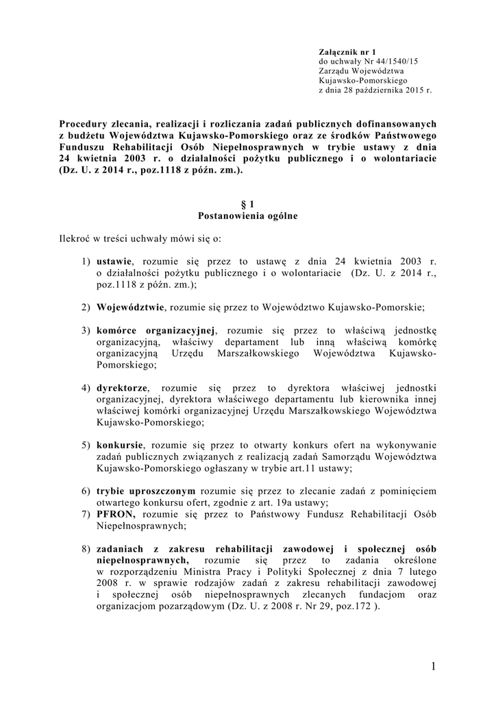 Załącznik nr 1 do uchwały Nr 44/1540/15 Zarządu Województwa Kujawsko-Pomorskiego z dnia 28 października 2015 r. Procedury zlecania, realizacji i rozliczania zadań publicznych dofinansowanych z budżetu Województwa Kujawsko-Pomorskiego oraz ze środków Państwowego Funduszu Rehabilitacji Osób Niepełnosprawnych w trybie ustawy z dnia 24 kwietnia 2003 r. o działalności pożytku publicznego i o wolontariacie (Dz. U. z 2014 r., poz.1118 z późn. zm.). §1 Postanowienia ogólne Ilekroć w treści uchwały mówi się o: 1) ustawie, rozumie się przez to ustawę z dnia 24 kwietnia 2003 r. o działalności pożytku publicznego i o wolontariacie (Dz. U. z 2014 r., poz.1118 z późn. zm.); 2) Województwie, rozumie się przez to Województwo Kujawsko-Pomorskie; 3) komórce organizacyjnej, rozumie się przez to właściwą jednostkę organizacyjną, właściwy departament lub inną właściwą komórkę organizacyjną Urzędu Marszałkowskiego Województwa KujawskoPomorskiego; 4) dyrektorze, rozumie się przez to dyrektora właściwej jednostki organizacyjnej, dyrektora właściwego departamentu lub kierownika innej właściwej komórki organizacyjnej Urzędu Marszałkowskiego Województwa Kujawsko-Pomorskiego; 5) konkursie, rozumie się przez to otwarty konkurs ofert na wykonywanie zadań publicznych związanych z realizacją zadań Samorządu Województwa Kujawsko-Pomorskiego ogłaszany w trybie art.11 ustawy; 6) trybie uproszczonym rozumie się przez to zlecanie zadań z pominięciem otwartego konkursu ofert, zgodnie z art. 19a ustawy; 7) PFRON, rozumie się przez to Państwowy Fundusz Rehabilitacji Osób Niepełnosprawnych; 8) zadaniach z zakresu rehabilitacji zawodowej i społecznej osób niepełnosprawnych, rozumie się przez to zadania określone w rozporządzeniu Ministra Pracy i Polityki Społecznej z dnia 7 lutego 2008 r. w sprawie rodzajów zadań z zakresu rehabilitacji zawodowej i społecznej osób niepełnosprawnych zlecanych fundacjom oraz organizacjom pozarządowym (Dz. U. z 2008 r. Nr 29, poz.172 ). 1 §2 Zlecanie zadań publicznych w trybie konkursowym 1. Zlecanie realizacji zadań publicznych w formie wsparcia lub powierzenia odbywa się w trybie ustawy w drodze otwartych konkursów ofert ogłaszanych uchwałą Zarządu Województwa na zasadach i w trybie ustawy. 1a. Oferty w otwartych konkursach ofert składane są elektronicznie za pomocą Generatora ofert oraz w wersji papierowej stanowiącej wydruk z Generatora zawierający zgodną sumę kontrolną. Do czasu uruchomienia Generatora ofert dopuszcza się złożenie oferty wyłącznie w wersji papierowej zarówno w trybie konkursowym jak i pozakonkursowym. 1 2. W przypadku realizacji zadań w formie wsparcia, oferent ma możliwość wniesienia wkładu własnego osobowego, którego wysokość określają poszczególne regulaminy konkursowe. 3. Wkład własny osobowy mogą stanowić świadczenia wolontariuszy i praca społeczna członków organizacji. 4. Regulaminy poszczególnych konkursów przygotowują właściwe komórki organizacyjne, zgodnie ze swoimi kompetencjami, z zachowaniem jednolitego schematu regulaminu oraz jednolitych formularzy druków i wymogów formalnych wobec wnioskodawców. 5. Zarząd Województwa powołuje Komisje Konkursowe i ustala regulamin ich pracy. 6. Komisja konkursowa przedstawia propozycje rozstrzygnięcia konkursu, a Zarząd Województwa dokonuje wyboru ofert i przyznaje dotacje. 7. Rozstrzygnięcie konkursów następuje w terminie do 45 dni od ostatniego dnia składania ofert, z wyjątkiem konkursów, na które wpłynęło więcej niż 100 ofert, których rozstrzygnięcie może nastąpić w terminie do 60 dni od ostatniego dnia składania ofert. Wyniki konkursu wraz z punktacją ogłaszane są w sposób określony w art. 15 ust. 2 ustawy. 8. Na zlecanie realizacji zadań publicznych w trybie uproszczonym, komórki organizacyjne mogą rezerwować kwotę do wysokości 20% środków przeznaczonych na granty w trybie pożytku publicznego w danym roku budżetowym. 9. Oferent, któremu przyznano kwotę dotacji niższą niż zaproponowana przez niego w ofercie lub oferent, który z ważnych przyczyn postanawia skorygować zakres realizacji zadania jeszcze przed podpisaniem umowy, może zaproponować w formie elektronicznej i pisemnej (wydruk z Generatora ofert) zaktualizowany harmonogram i kosztorys realizacji zadania (korektę zakresu rzeczowego i finansowego zadania) zwany dalej korektą, wg druku stanowiącego załącznik nr 3 do 1 Regulacja dotyczy okresu przejściowego tj. od dnia podjęcia uchwały Nr 44/1540/15 Zarządu Województwa Kujawsko-Pomorskiego z dnia 28 paździenika 2015 r. w sprawie procedur zlecania, realizacji i rozliczenia zadań publicznych dofinansowanych z budżetu Województwa Kujawsko-Pomorskiego oraz ze środków Państwowego Funduszu Rehabilitacji Osób Niepełnosprawnych do dnia uruchomienia Generatora ofert. 2 uchwały. Korekta powinna być złożona w czasie umożliwiającym terminowe przygotowanie i podpisanie umowy. Negocjacje w sprawie zmian zakresu rzeczowego i finansowego zadania prowadzi właściwa komórka organizacyjna. 10. Oferent, któremu przyznano dotację może z niej zrezygnować. Pisemne oświadczenie o rezygnacji z dotacji ze środków Województwa lub ze środków PFRON, należy złożyć w terminie do 14 dni od dnia powiadomienia o przyznanej dotacji. W szczególnie uzasadnionych przypadkach, oświadczenie to można złożyć po terminie wymienionym powyżej. Oświadczenie powinno zawierać nazwę zadania, oraz podpisy osób uprawnionych do składania oświadczeń woli w imieniu oferenta. 11. Oferent, z którym podpisano umowę o realizację zadania publicznego, może zrezygnować z dotacji w następujących przypadkach: 1) wystąpienia okoliczności uniemożliwiających wykonanie umowy - do dnia przekazania dotacji/przekazania I transzy dotacji; 2) jeżeli Zleceniodawca nie przekaże dotacji/I transzy dotacji w terminie określonym w umowie, 