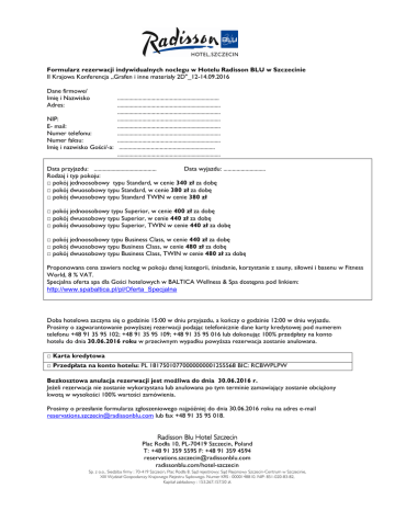 Formularz rezerwacji indywidualnych noclegu w Hotelu Radisson BLU w Szczecinie II Krajowa Konferencja „Grafen i inne materiały 2D"_12-14.09.2016 Dane firmowe/ Imię i Nazwisko Adres: ...................................................................... ....................................................................... ....................................................................... NIP: ....................................................................... E- mail: ....................................................................... Numer telefonu: ....................................................................... Numer faksu: ....................................................................... Imię i nazwisko Gości/-a: .................................................................. ....................................................................... Data przyjazdu: ........................................... Data wyjazdu: ............................. Rodzaj i typ pokoju: □ pokój jednoosobowy typu Standard, w cenie 340 zł za dobę □ pokój dwuosobowy typu Standard, w cenie 380 zł za dobę □ pokój dwuosobowy typu Standard TWIN w cenie 380 zł □ pokój jednoosobowy typu Superior, w cenie 400 zł za dobę □ pokój dwuosobowy typu Superior, w cenie 440 zł za dobę □ pokój dwuosobowy typu Superior, TWIN w cenie 440 zł za dobę □ pokój jednoosobowy typu Business Class, w cenie 440 zł za dobę □ pokój dwuosobowy typu Business Class, w cenie 480 zł za dobę □ pokój dwuosobowy typu Business Class, TWIN w cenie 480 zł za dobę Proponowana cena zawiera nocleg w pokoju danej kategorii, śniadanie, korzystanie z sauny, siłowni i basenu w Fitness World, 8 % VAT. Specjalna oferta spa dla Gości hotelowych w BALTICA Wellness & Spa dostępna pod linkiem: http://www.spabaltica.pl/pl/Oferta_Specjalna Doba hotelowa zaczyna się o godzinie 15:00 w dniu przyjazdu, a kończy o godzinie 12:00 w dniu wyjazdu. Prosimy o zagwarantowanie powyższej rezerwacji podając telefonicznie dane karty kredytowej pod numerem telefonu +48 91 35 95 102; +48 91 35 95 109; +48 91 35 95 016 lub dokonując 100% przedpłaty na konto hotelu do dnia 30.06.2016 roku w przeciwnym wypadku powyższa rezerwacja zostanie anulowana. □ Karta kredytowa □ Przedpłata na konto hotelu: PL 18175010770000000001255568 BIC: RCBWPLPW Bezkosztowa anulacja rezerwacji jest możliwa do dnia 30.06.2016 r. Jeżeli rezerwacja nie zostanie wykorzystana lub anulowana po tym terminie zamawiający zostanie obciążony kwotą w wysokości 100% wartości zamówienia. Prosimy o przesłanie formularza zgłoszeniowego najpóźniej do dnia 30.06.2016 roku na adres e-mail [email protected] lub fax +48 91 35 95 018. Radisson Blu Hotel Szczecin Plac Rodła 10, PL-70419 Szczecin, Poland T: +48 91 359 5595 F: +48 91 359 4594 [email protected] radissonblu.com/hotel-szczecin Sp. z o.o., Siedziba firmy : 70-419 Szczecin, Plac Rodła 8. Sąd rejestrowy: Sąd Rejonowy Szczecin-Centrum w Szczecinie, XIII Wydział Gospodarczy Krajowego Rejestru Sądowego. Numer KRS : 0000148810. NIP: 851-020-83-82, Kapitał zakładowy : 153.267.157.50 zł. Hotel gwarantuje 20 pokoi cenie zgodnie z warunkami na formularzu rezerwacyjnym do 30.06.2016. Po tym terminie niewykorzystane pokoje zostaną zwolnione z bloku i po tym terminie proponowana będzie cena według dostępności. Po 30.06.2016 roku zapytania należy kierować na dane kontaktowe podane w formularzu lub dokonując rezerwacji poprzez stronę internetową hotelu: https://www.radissonblu.com/pl/hotel-szczecin REZERWACJA WAŻNA JEST TYLKO PO POTWIERDZENIU PRZEZ HOTEL Termin pobytu: ........................................................................ Rodzaj i typ pokoju: ......................................................................... Cena za pokój za noc: .......................................................................... Numer rezerwacji: .......................................................................... Imię i nazwisko osoby potwierdzającej: ......................................................... Data i podpis: ..........................................................
