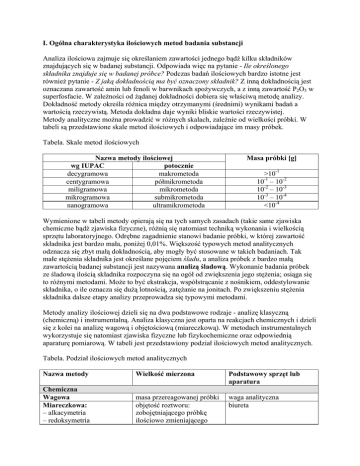 I. Ogólna charakterystyka ilościowych metod badania substancji Analiza ilościowa zajmuje się określaniem zawartości jednego bądź kilku składników znajdujących się w badanej substancji. Odpowiada więc na pytanie - Ile określonego składnika znajduje się w badanej próbce? Podczas badań ilościowych bardzo istotne jest również pytanie - Z jaką dokładnością ma być oznaczony składnik? Z inną dokładnością jest oznaczana zawartość amin lub fenoli w barwnikach spożywczych, a z inną zawartość P2O5 w superfosfacie. W zależności od żądanej dokładności dobiera się właściwą metodę analizy. Dokładność metody określa różnica między otrzymanymi (średnimi) wynikami badań a wartością rzeczywistą. Metoda dokładna daje wyniki bliskie wartości rzeczywistej. Metody analityczne można prowadzić w różnych skalach, zależnie od wielkości próbki. W tabeli są przedstawione skale metod ilościowych i odpowiadające im masy próbek. Tabela. Skale metod ilościowych Nazwa metody ilościowej wg IUPAC potocznie decygramowa makrometoda centygramowa półmikrometoda miligramowa mikrometoda mikrogramowa submikrometoda nanogramowa ultramikrometoda Masa próbki [g] >10-1 10-1 – 10-2 10-2 – 10-3 10-3 – 10-4 <10-4 Wymienione w tabeli metody opierają się na tych samych zasadach (takie same zjawiska chemiczne bądź zjawiska fizyczne), różnią się natomiast techniką wykonania i wielkością sprzętu laboratoryjnego. Odrębne zagadnienie stanowi badanie próbki, w której zawartość składnika jest bardzo mała, poniżej 0,01%. Większość typowych metod analitycznych odznacza się zbyt małą dokładnością, aby mogły być stosowane w takich badaniach. Tak małe stężenia składnika jest określane pojęciem śladu, a analiza próbek z bardzo małą zawartością badanej substancji jest nazywana analizą śladową. Wykonanie badania próbek ze śladową ilością składnika rozpoczyna się na ogół od zwiększenia jego stężenia; osiąga się to różnymi metodami. Może to być ekstrakcja, współstrącanie z nośnikiem, oddestylowanie składnika, o ile oznacza się dużą lotnością, zatężanie na jonitach. Po zwiększeniu stężenia składnika dalsze etapy analizy przeprowadza się typowymi metodami. Metody analizy ilościowej dzieli się na dwa podstawowe rodzaje - analizę klasyczną (chemiczną) i instrumentalną. Analiza klasyczna jest oparta na reakcjach chemicznych i dzieli się z kolei na analizę wagową i objętościową (miareczkową). W metodach instrumentalnych wykorzystuje się natomiast zjawiska fizyczne lub fizykochemiczne oraz odpowiednią aparaturę pomiarową. W tabeli jest przedstawiony podział ilościowych metod analitycznych. Tabela. Podział ilościowych metod analitycznych Nazwa metody Wielkość mierzona Podstawowy sprzęt lub aparatura Chemiczna Wagowa Miareczkowa: – alkacymetria – redoksymetria masa przereagowanej próbki objętość roztworu: zobojętniającego próbkę ilościowo zmieniającego waga analityczna biureta – strąceniowa – kompleksometria Instrumentalna Optyczna: – refraktometria – polarymetria – nefelometria – turbidymetria Spektroskopowa: – absorpcyjna – emisyjna Elektroanalityczna: – konduktometria – potencjometria – elektrograwimetria – polarografia Chromatografia liczbę utlenienia składnika próbki ilościowo wytrącającego składnik próbki w postaci osadu ilościowo wiążącego składnik próbki w trwały kompleks współczynnik załamania światła kąt skręcenia płaszczyzny światła spolaryzowanego natężenie światła rozproszonego wartość rozproszenia promieniowania refraktometr absorpcja promieniowania emisja promieniowania spektrofotometr fotometr płomieniowy przewodność elektrolityczna (konduktywność) potencjał elektrody wskaźnikowej masa substancji wydzielonej na elektrodzie natężenie prądu przepływającego między elektrodami stopień rozdzielenia składników konduktometr polarymetr nefelometr nefelometr potencjometr elektrolizer polarograf chromatograf Metody instrumentalne w porównaniu z metodami chemicznymi odznaczają się szybkością wykonania i obiektywnością pomiaru (najczęściej za pomocą miernika elektrycznego). Dodatkową zaletą tych metod jest możliwość łatwej automatyzacji i przetwarzania ich na metody ciągłe. Pozwala to na stałą kontrolę przebiegu procesów przemysłowych. Metody chemiczne są jednak dokładniejsze i niezastąpione przy przygotowywaniu wzorców stosowanych następnie w analizach instrumentalnych. Metody instrumentalne należą w większości do metod porównawczych w przeciwieństwie do metod chemicznych, które są metodami absolutnymi. W metodach porównawczych dokonuje się pomiaru określonej wielkości w próbce i porównuje z wartością tej samej wielkości we wzorcu. W metodach absolutnych bezpośrednio określa się wielkość mierzoną, np. stężenie jonów siarczanowych można badać wagowo lub nefelometrycznie. Pierwsza z tych metod jest absolutna. Strąca się jon siarczanowy w postaci osadu BaSO4 i na podstawie jego masy określa się zawartość jonu SO42-. W metodzie nefelometrycznej bada się natężenie światła rozproszonego w zawiesinie BaSO4 i porównuje go z natężeniem światła przechodzącego przez wzorzec. Wykonanie analizy ilościowej określonej substancji składa się z kilku etapów. Pierwszym jest pobranie odpowiedniej próbki w ściśle określony sposób. Próbka musi być tak dobrana, aby jej skład odpowiadał średniemu składowi całej partii badanego materiału. Pobiera się zawsze kilka lub kilkanaście tzw. próbek pierwotnych z różnych opakowań tego samego materiału, a jeżeli materiał nie jest pakowany, to pobiera się próbki z różnych miejsc hałdy, wagonu lub innego miejsca przechowywania substancji. Odpowiednie przepisy zamieszczone w Polskich Normach określają dokładnie sposoby pobierania różnego rodzaju materiałów. W drugim 