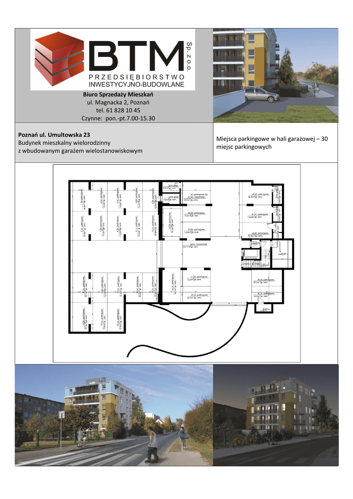 Biuro Sprzedaży Mieszkań ul. Magnacka 2, Poznań tel. 61 828 10 45 Czynne: pon.-pt.7.00-15.30 Poznań ul. Umultowska 23 Budynek mieszkalny wielorodzinny z wbudowanym garażem wielostanowiskowym Miejsca parkingowe w hali garażowej – 30 miejsc parkingowych