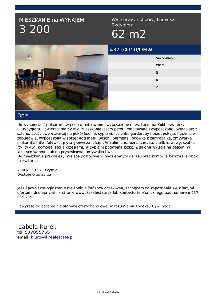 MIESZKANIE na WYNAJEM 3 200 Warszawa, Żoliborz, Ludwika Rydygiera 62 m2 4371/4150/OMW Secondary 2011 3 6 2 Opis Do wynajęcia 2-pokojowe, w pełni umeblowane i wyposażone mieszkanie na Żoliborzu, przy ul.Rydygiera. Powierzchnia 62 m2. Mieszkanie jest w pełni umeblowane i wyposażone. Składa się z salonu, częściowo otwartej na pokój kuchni, sypialni, łazienki, garderoby i przedpokoju. Kuchnia w zabudowie, wyposażona w sprzęt agd marki Bosch i Siemens (lodówka z zamrażalką, zmywarka, piekarnik, mikrofalówka, płyta grzewcza, okap). W salonie narożna kanapa, stolik kawowy, szafka rtv, tv 46", komoda, stół z krzesłami. W sypialni podwójne łóżko. Z salonu wyjście na balkon. W łazience wanna, kabina prysznicowa, umywalka i wc. Do mieszkania przynależy miejsce postojowe w podziemnym garażu oraz komórka lokatorska obok mieszkania. Kaucja: 1 msc. czynsz. Dostępne od zaraz. Jeżeli powyższe ogłoszenie nie spełnia Państwa oczekiwań, zachęcam do zapoznania się z innymi ofertami dostępnymi na stronie www.ikrealestate.pl lub kontaktu telefonicznego pod numerem 537 855 755. Powyższe ogłoszenie nie stanowi oferty handlowej w rozumieniu Kodeksu Cywilnego. Izabela Kurek tel. 537855755 email: [email protected] I.K. Real Estate Powered by TCPDF (www.tcpdf.org)
